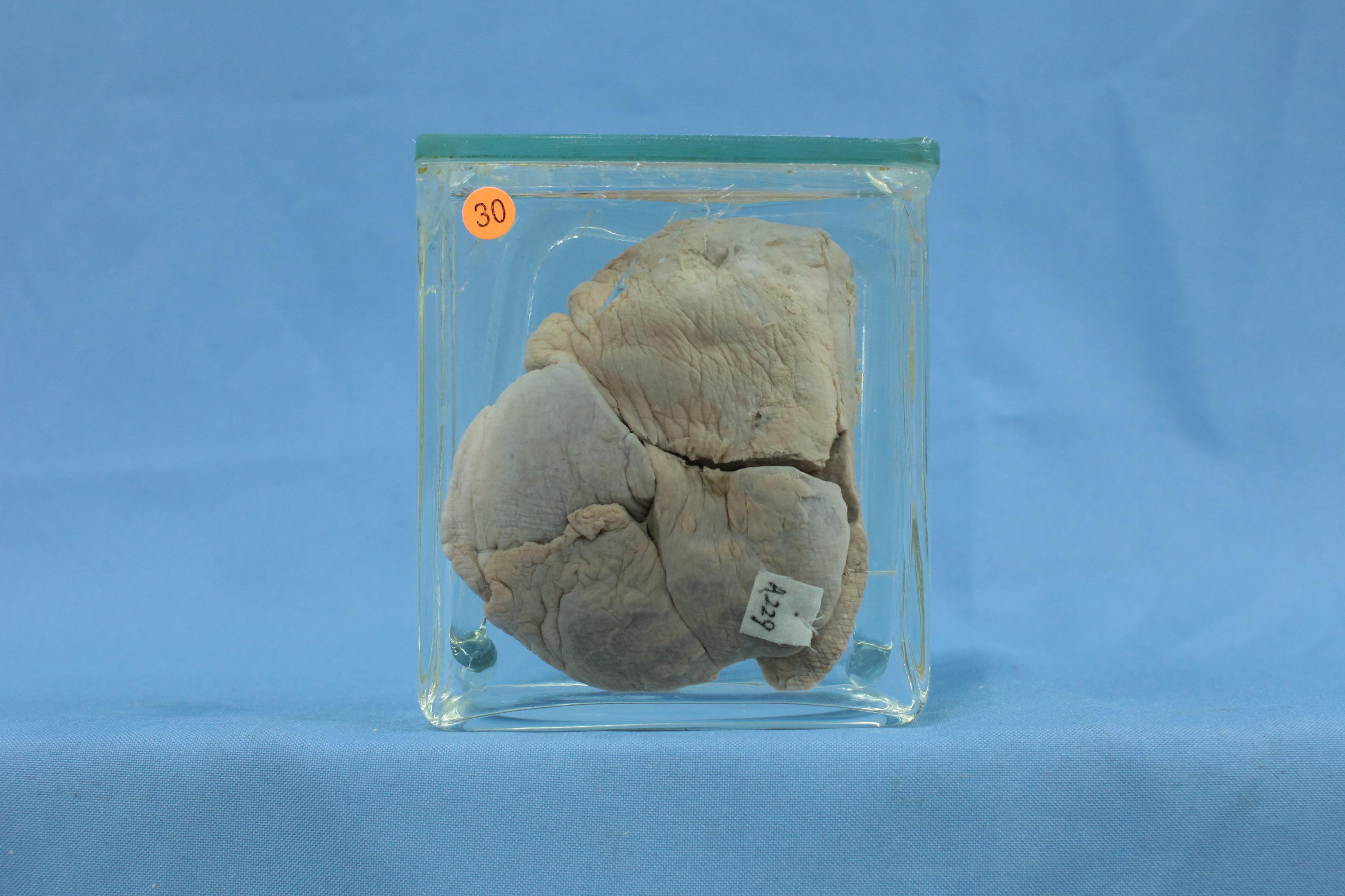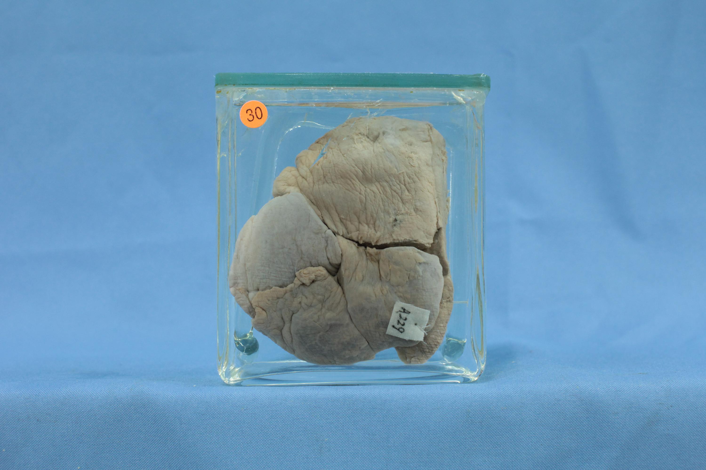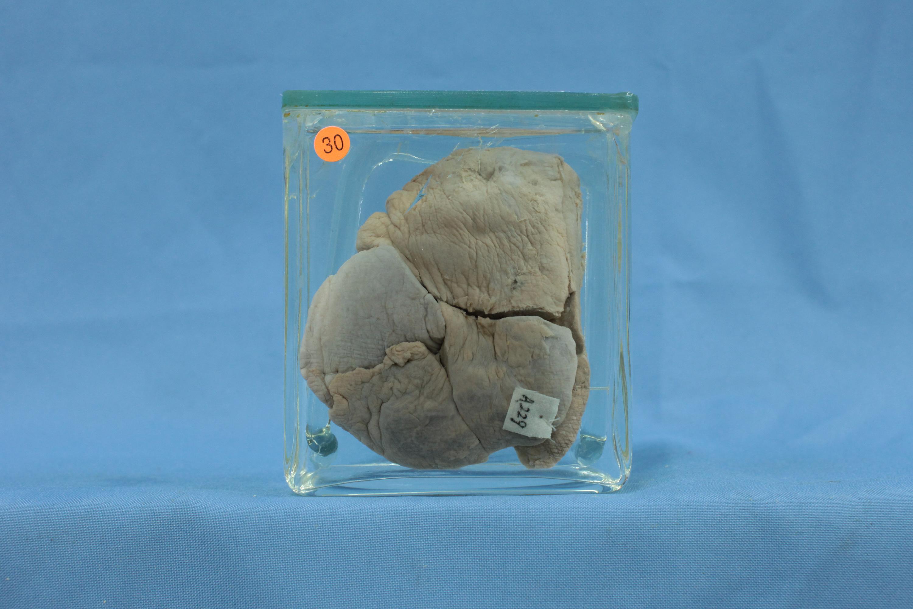 右肺表面不规则斑块状纤维蛋白性渗出,灰黄色,无光泽。