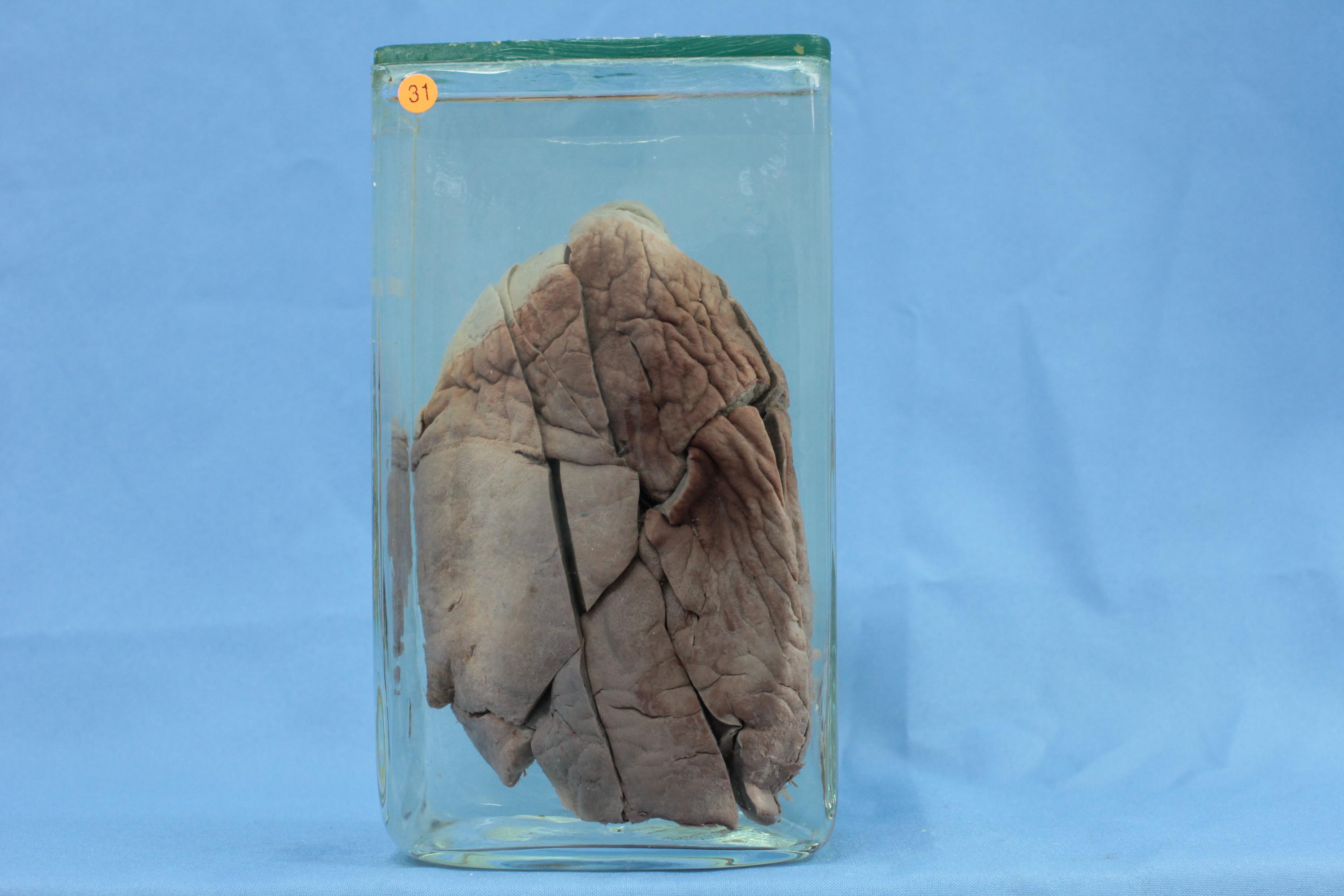 右肺三叶较为饱满,表面一厚层灰白色纤维蛋白性渗出,略呈破毛巾状。尤以外侧中下肺为著。