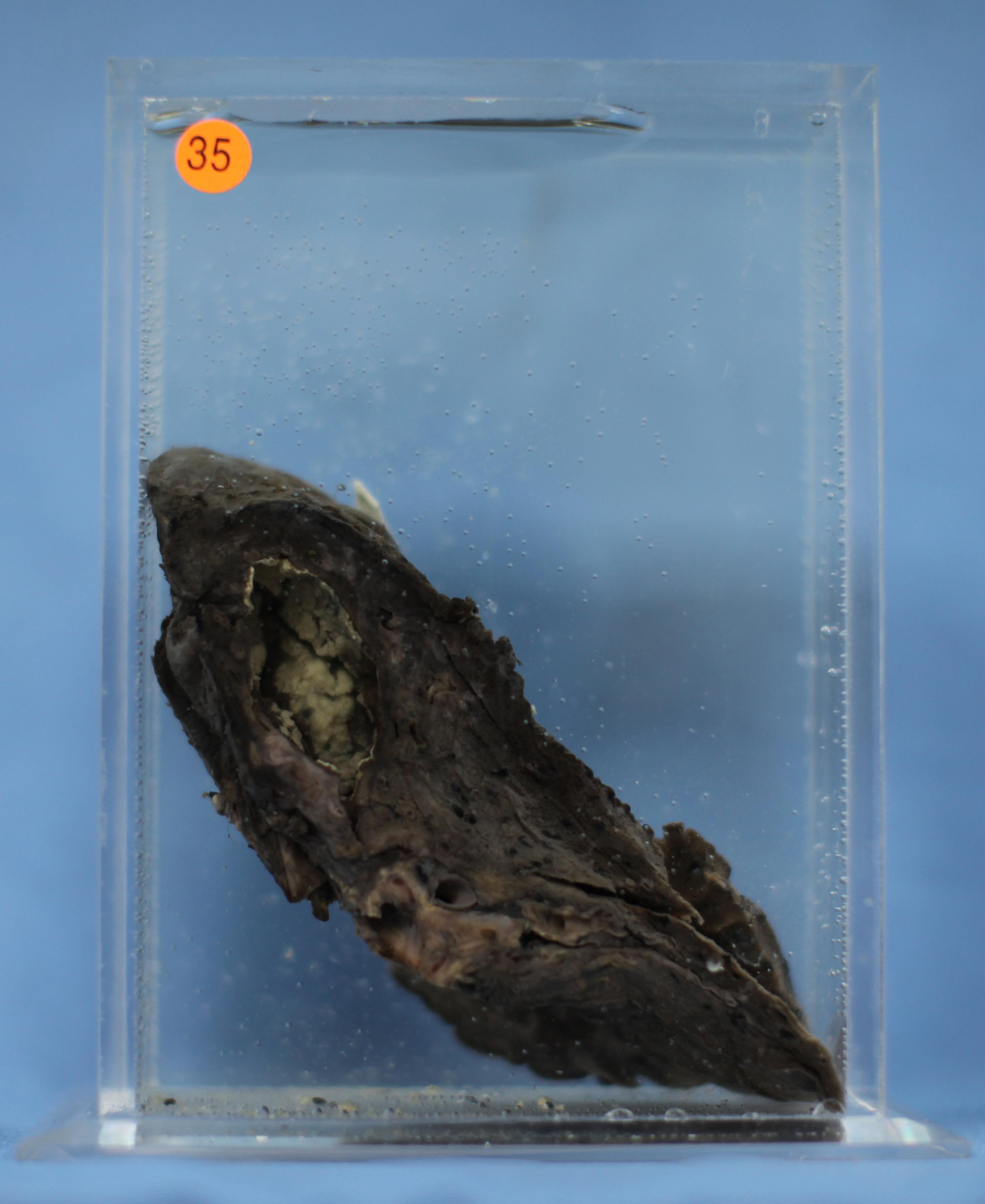 支气管局部扩张,直径1.5cm,长3cm,壁薄,腔内附白色絮状物(大部分已脱落于盒子下方),周围肺轻度膨胀不全。