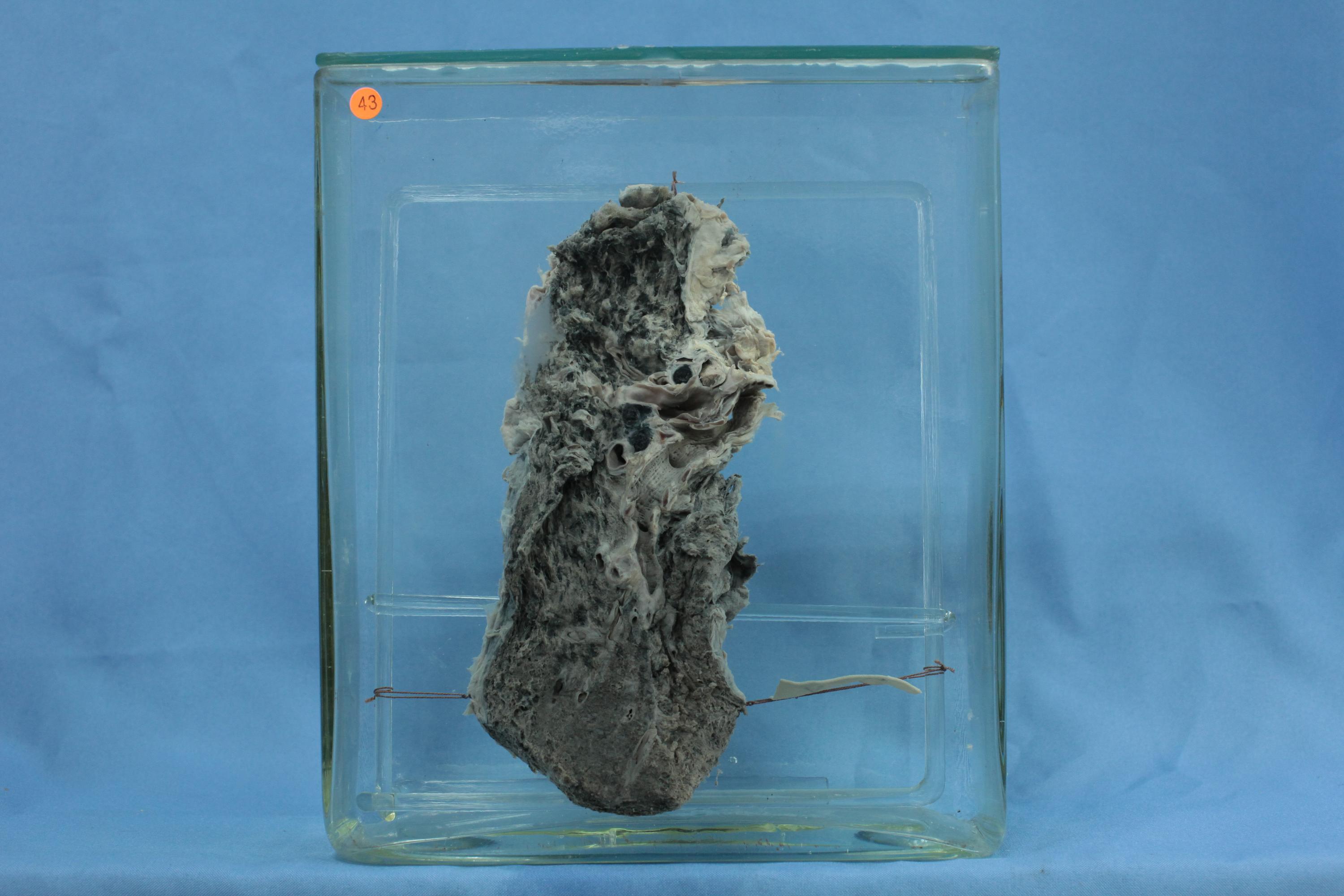 支气管黏膜充血、粗糙,可见有针孔状扩大的腺管开口,上、下肺叶气腔广泛不规则扩大(腺泡中央型肺气肿),下肺有细小灰白色实化灶(继发感染)。胸膜不规则纤维性粘连。