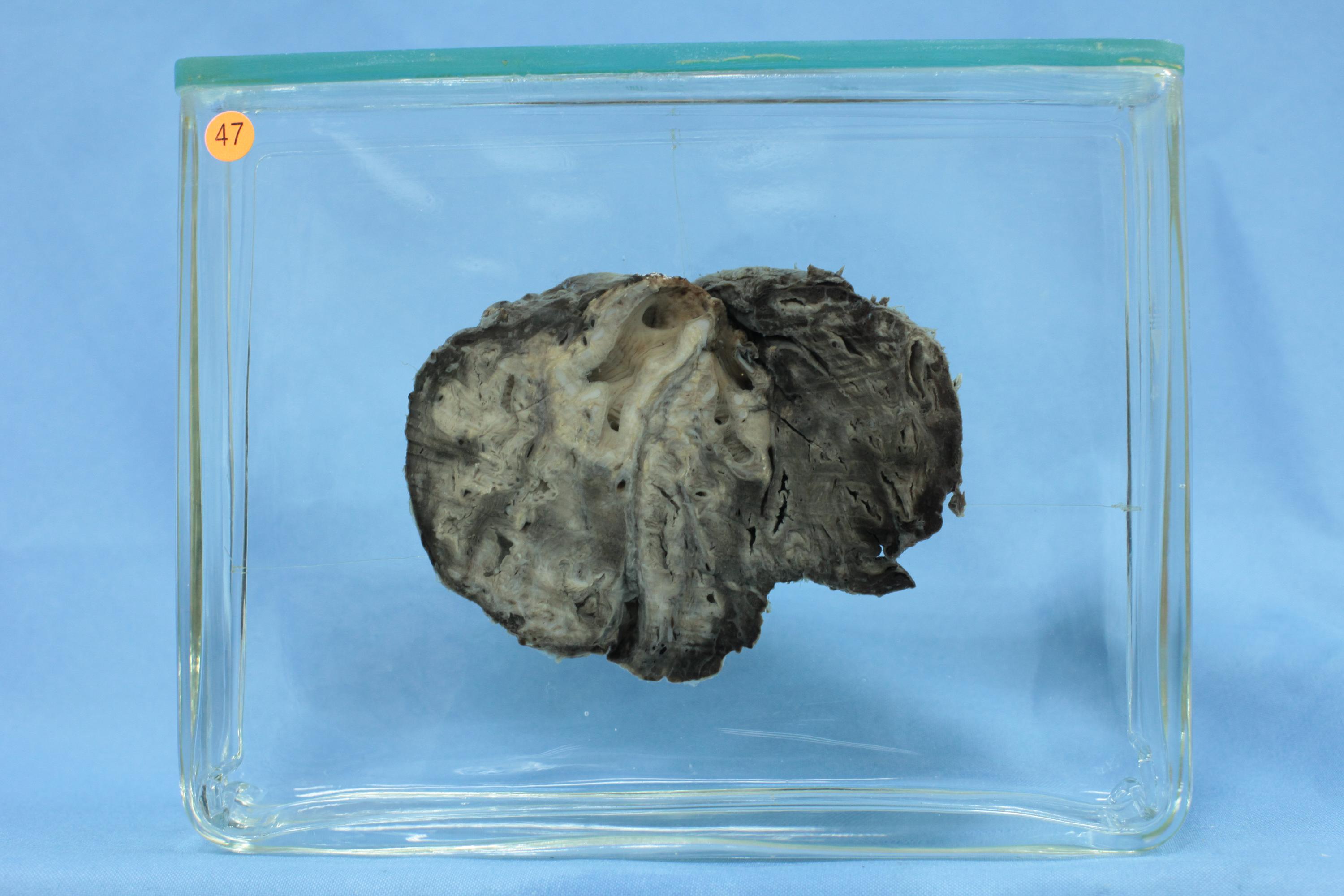 病变肺叶切面见近中央区支气管扩张,管壁增厚,内面纵形皱襞明显。柱状扩张的支气管远端见囊性病灶,囊壁内面粗糙,囊内分泌物已洗去。周围肺组织实变,纤维化。叶和段支气管无扩张,其黏膜粗糙,内面可见针孔状扩张的支气管腺体开口。