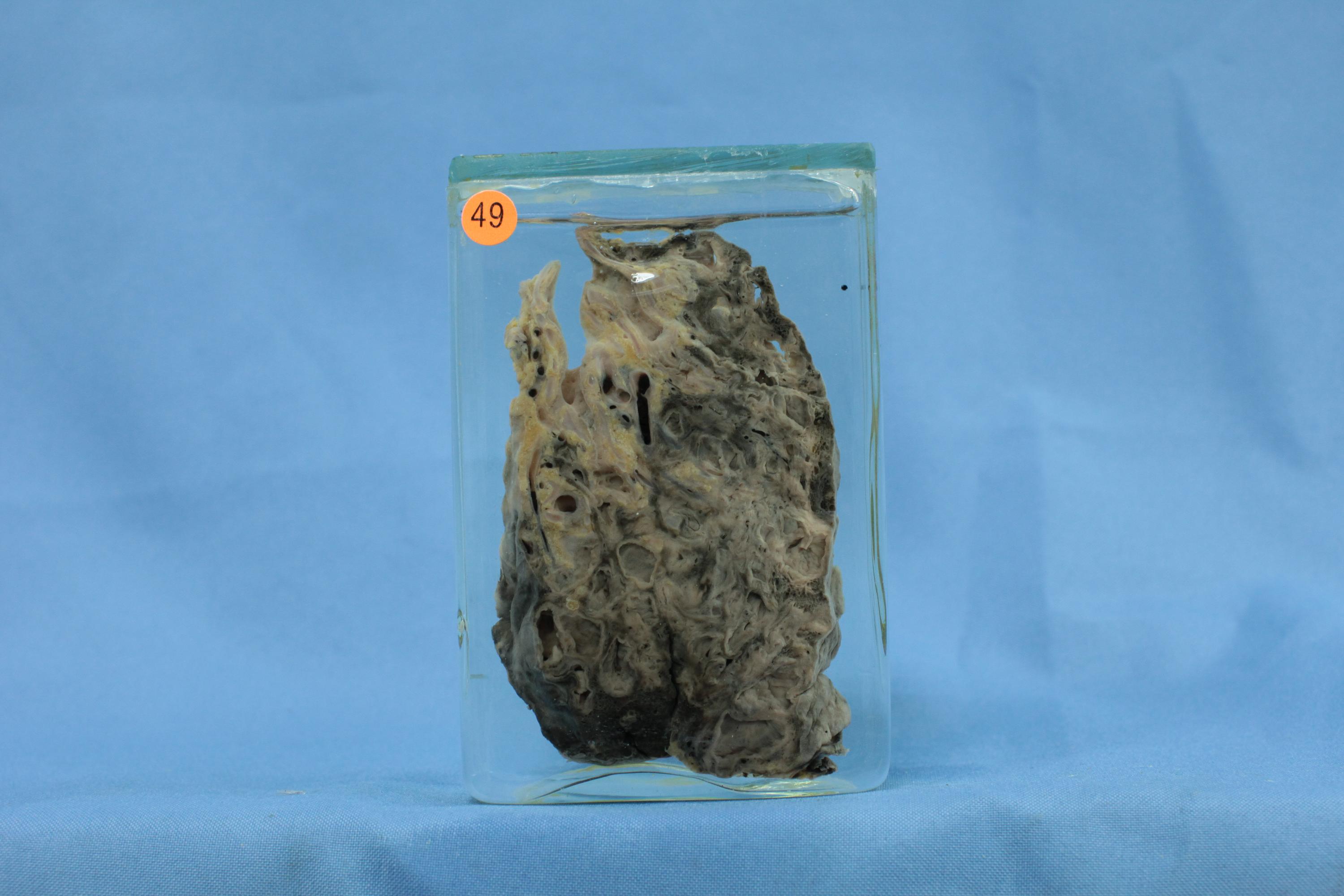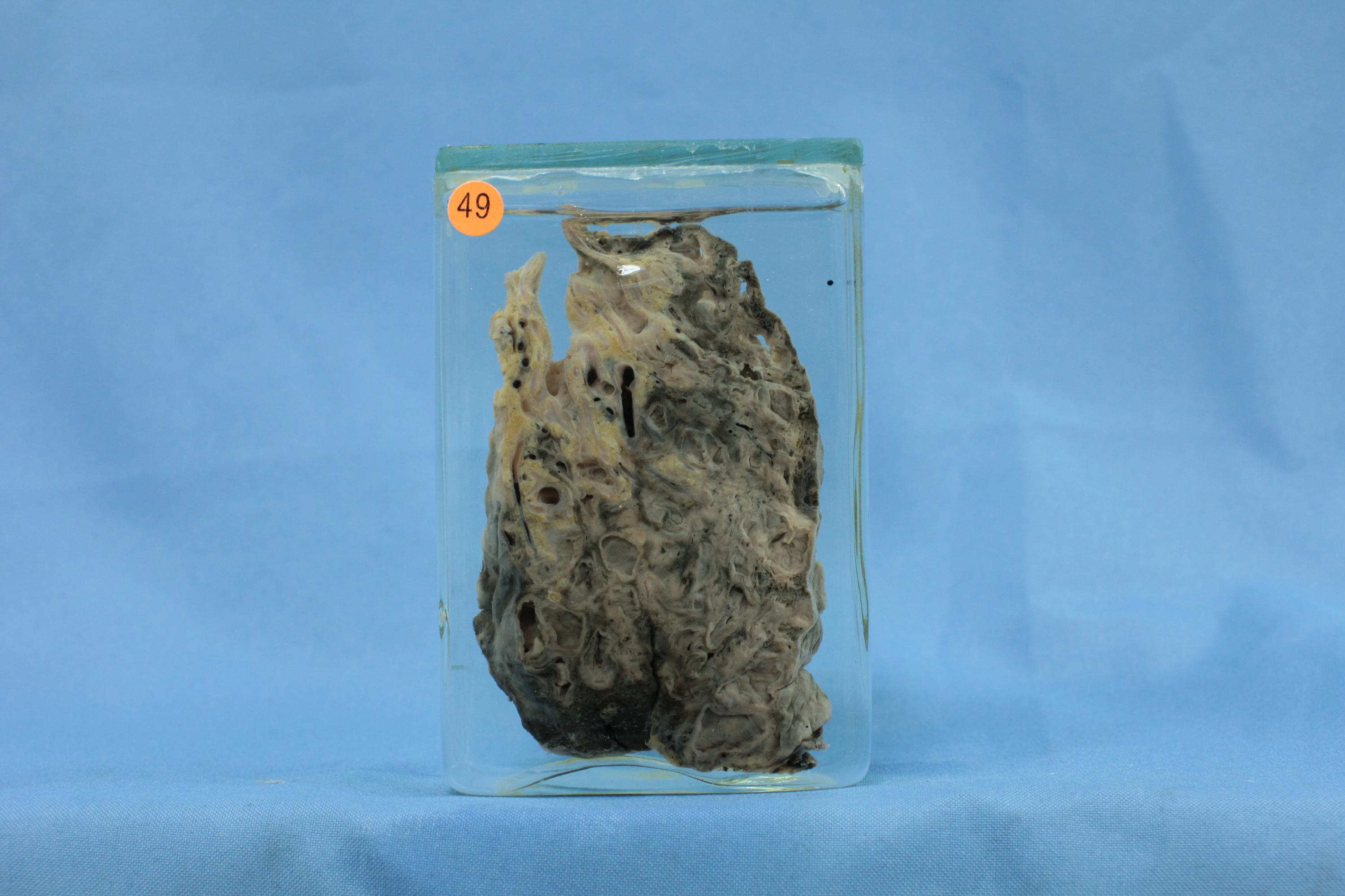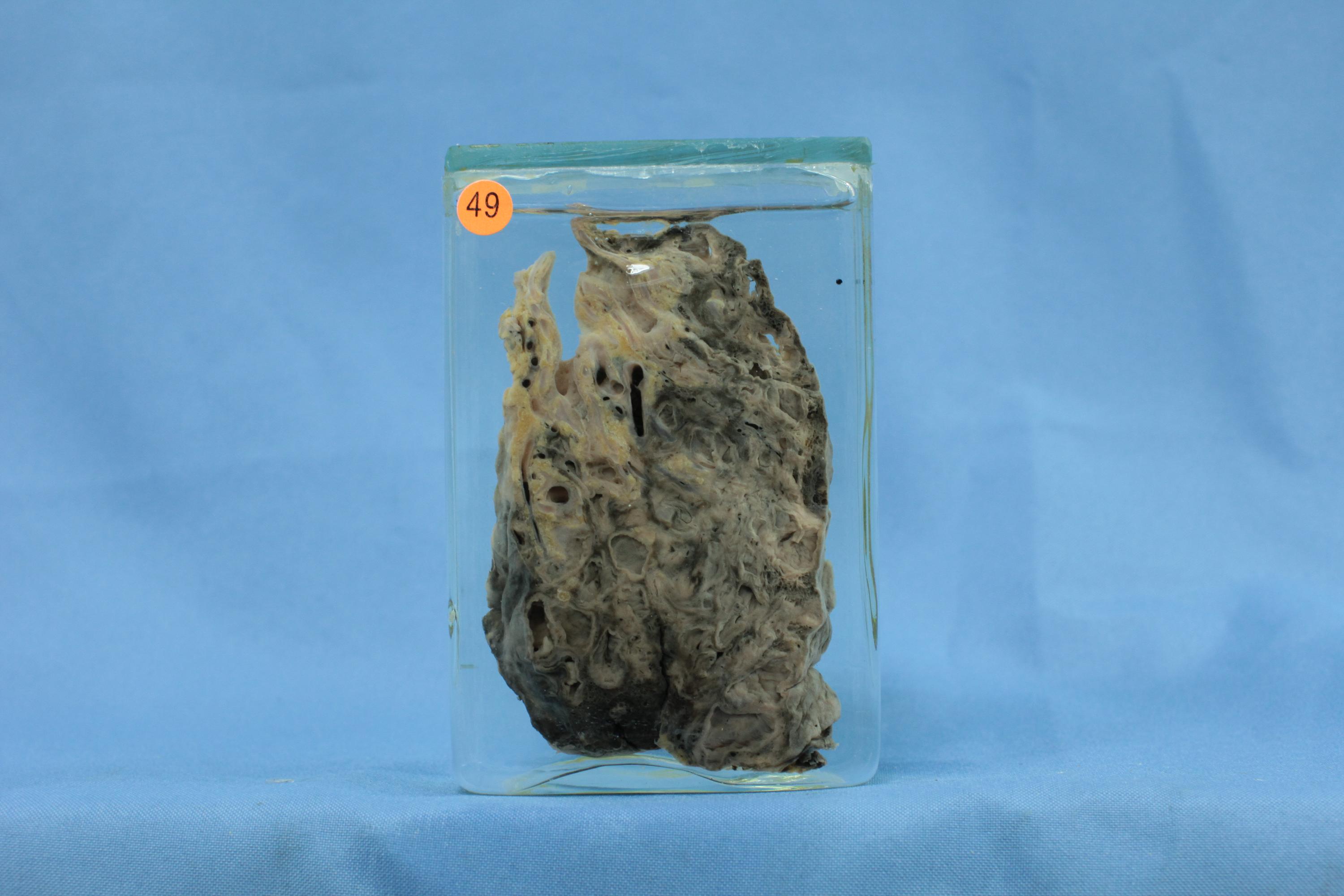 一侧肺叶质地变实,切面见散在分布囊性病变,其囊壁较薄,内面粗糙,囊内分泌物已洗去。叶和段支气管无扩张,其黏膜粗糙,内面可见针孔状扩张的支气管腺体开口。病灶间肺组织广泛实变、纤维化。