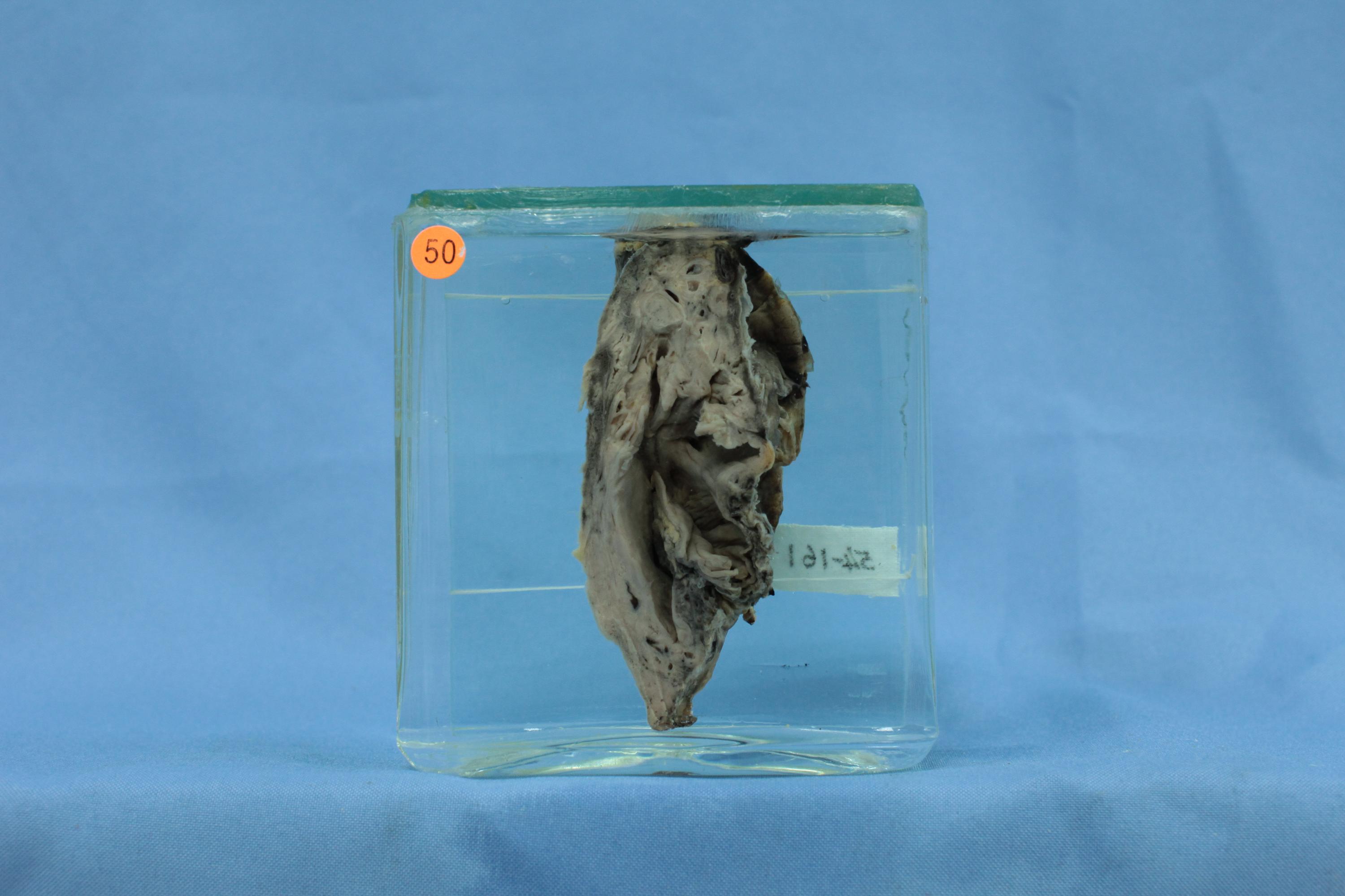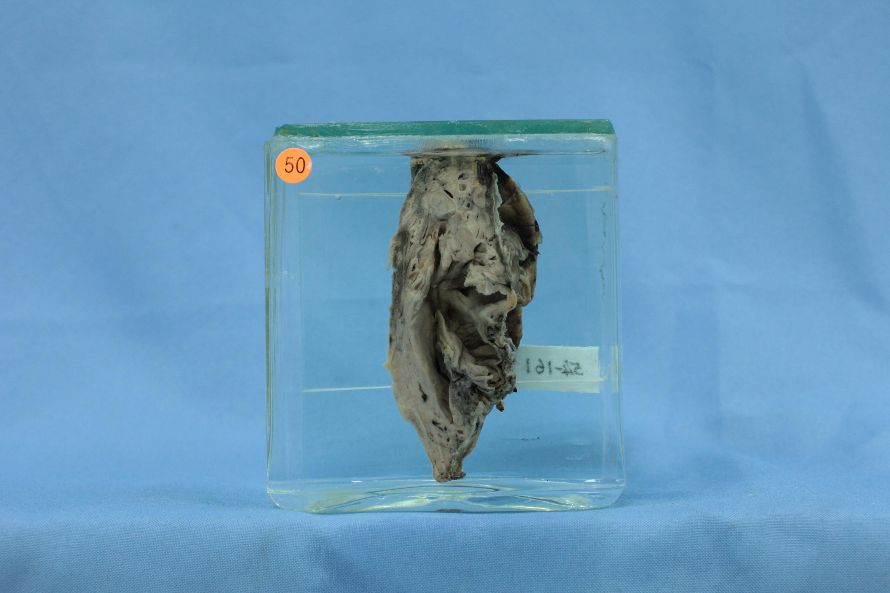病变肺叶体积缩小,质地变实,胸膜面广泛纤维性粘连。切面见数个囊性病变,最大的直径5.6cm。其囊壁灰白色,较薄,内面粗糙,囊内分泌物已洗去。周围肺组织广泛纤维化。