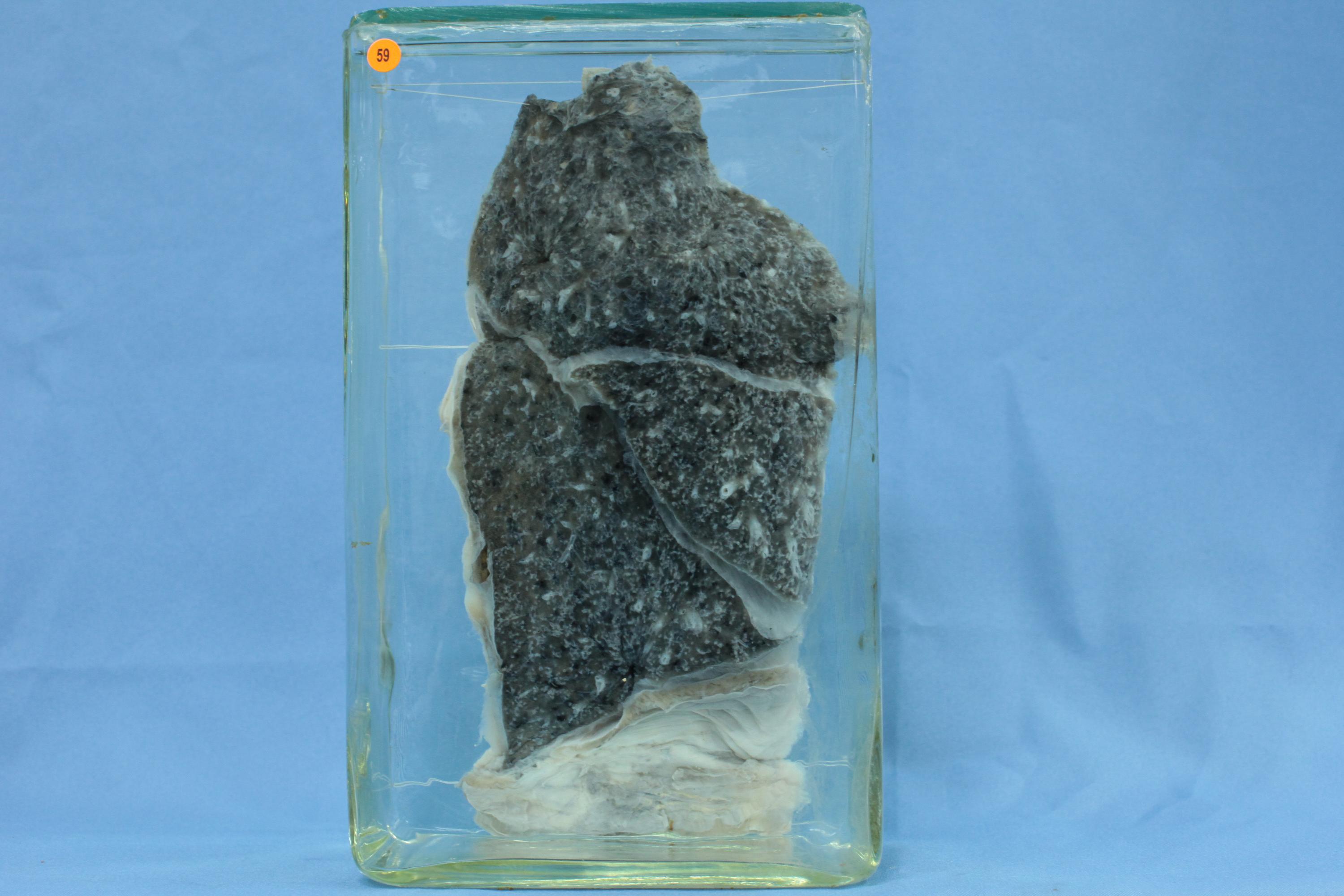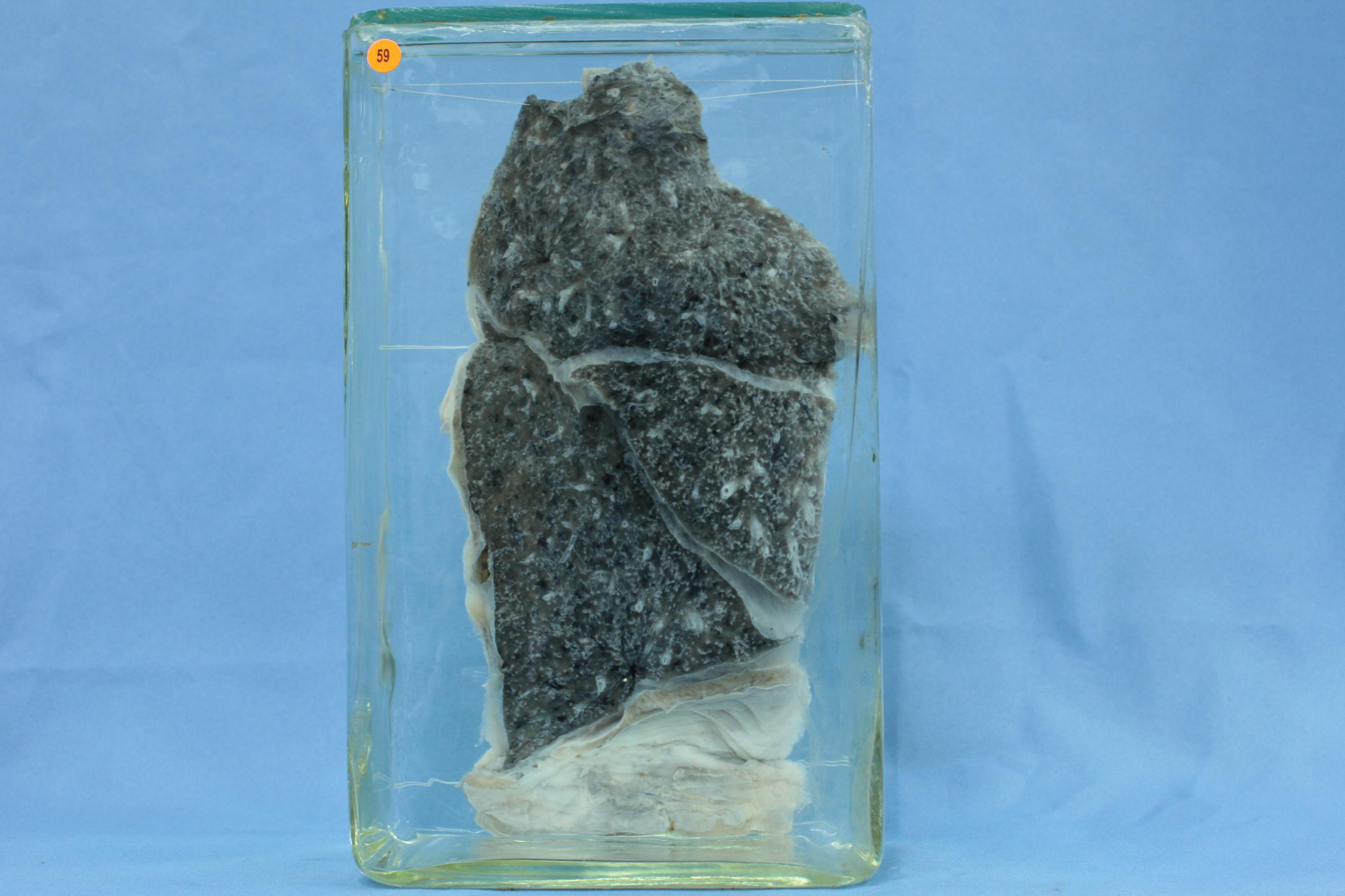 三期硅肺,两肺各叶均见片状乳白色雾状区域,该区域有明显的黑色背景(吸入的碳末)。该病变以两侧上肺为著。在该病变区及肺门和隆突下淋巴结切面可见乳白色细小颗粒。气管和支气管黏膜粗糙,有针尖样小孔。左肺下叶有小片灰白色实化病灶(感染)。胸膜纤维性粘连。