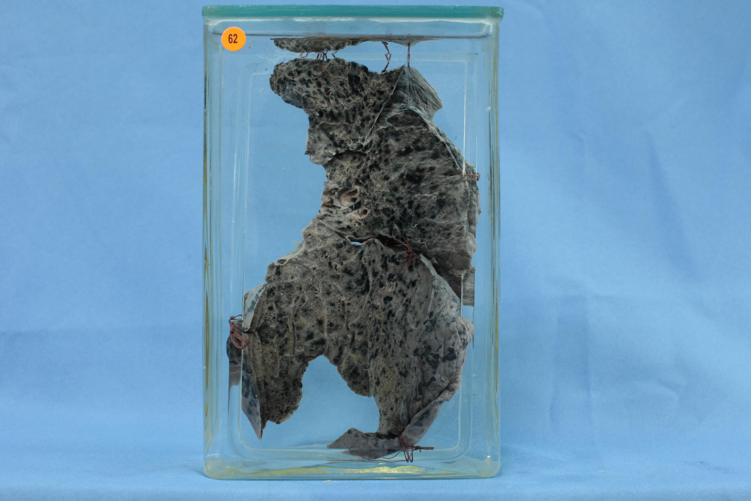 胸膜轻度增厚,纤维增生,上肺切面见肺泡轻度不规则扩张(腺泡中央型肺气肿),靠胸膜处见少量乳白色纤维性病灶,余肺见较多碳末,仔细看似有少量散在粟米大灰白色细颗粒,呈散在分布。