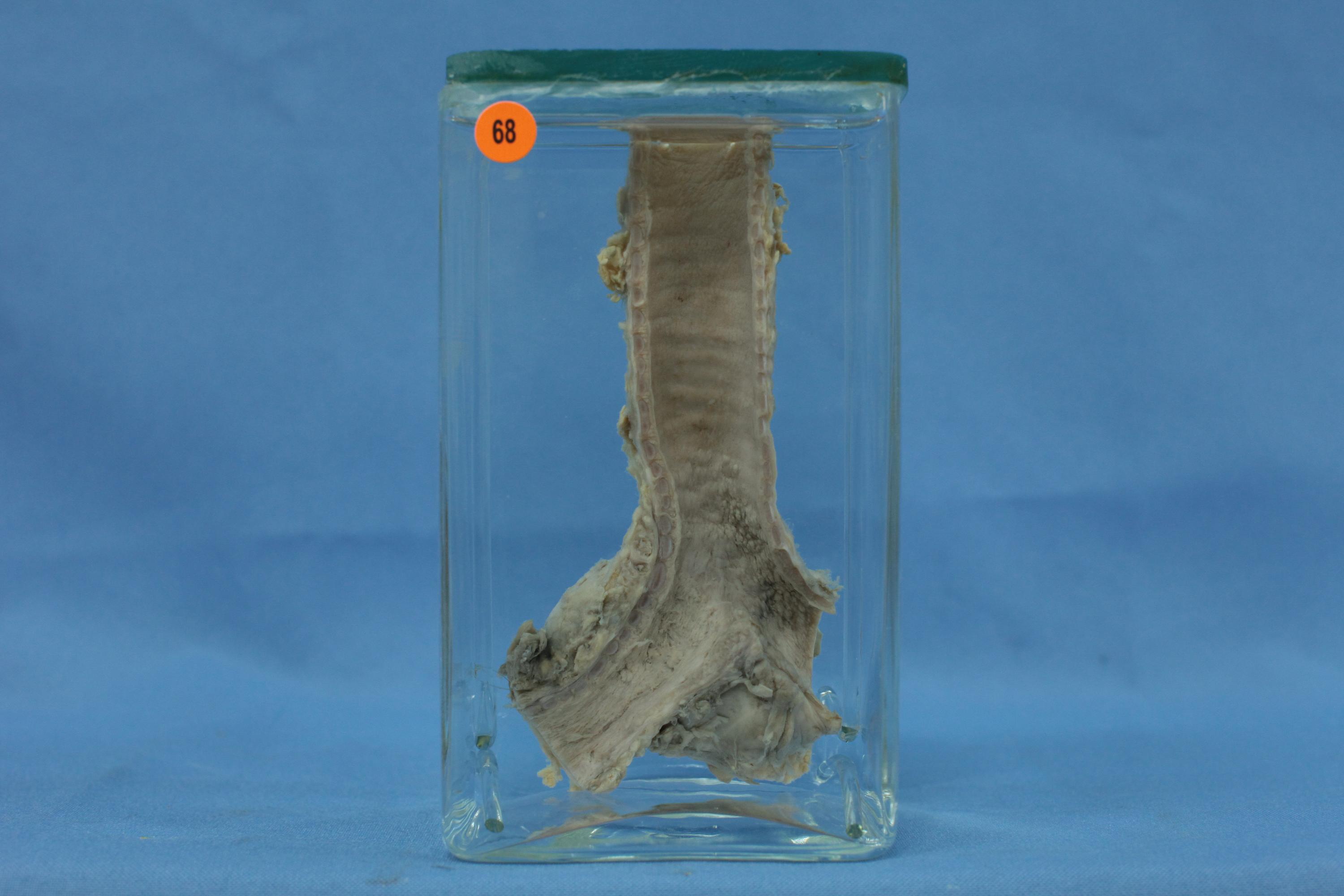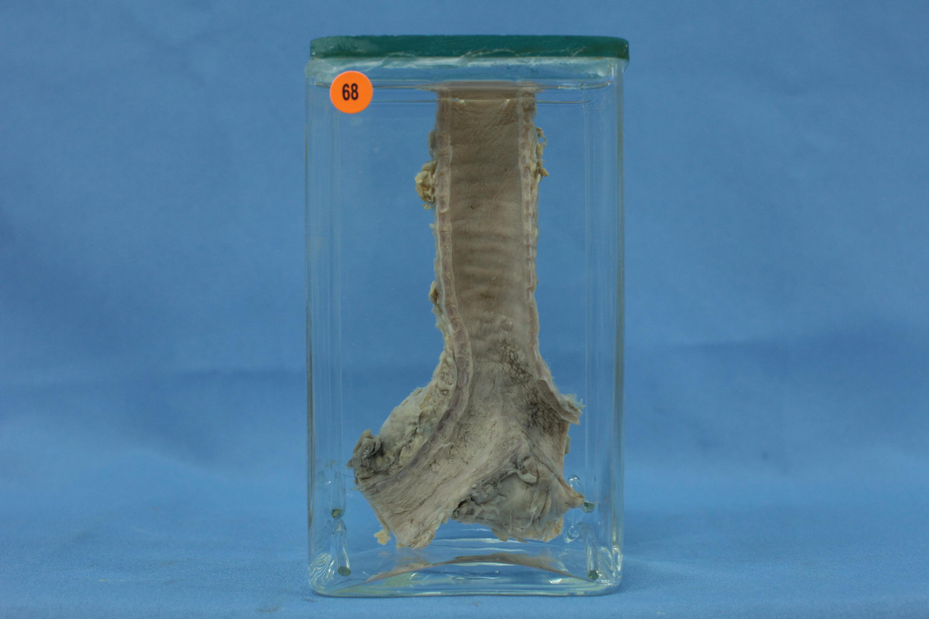 气管下段及左右主支气管黏膜增厚,表面粗糙,但无明显突起。切面见黏膜增厚,灰白色,浸润、破坏管壁,并侵及周围软组织。管壁外表面见大的灰白色结节(5×3×1.5cm)。