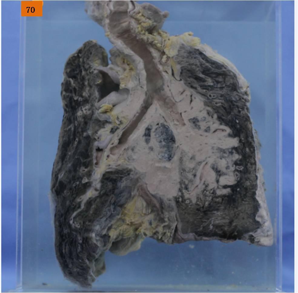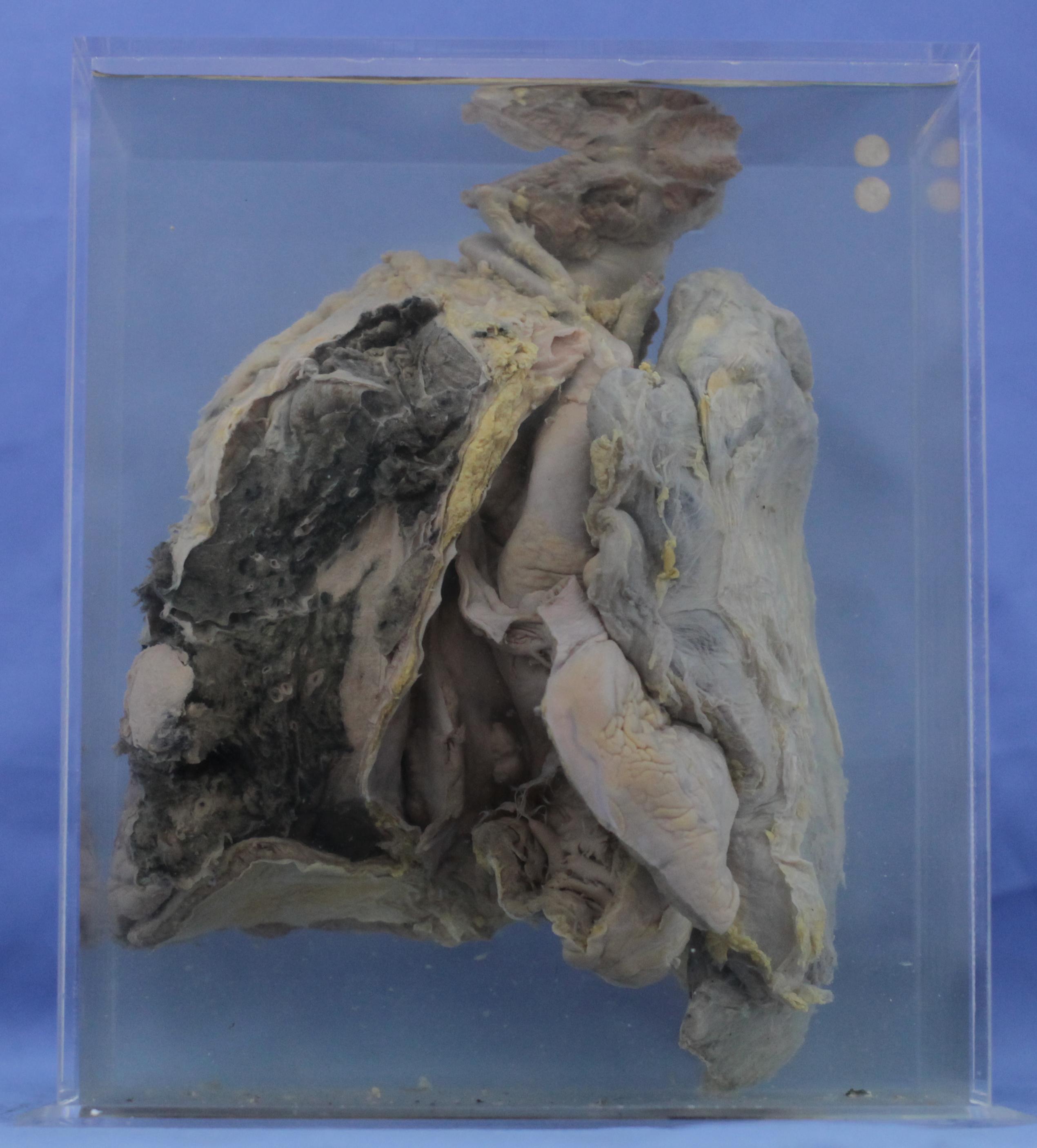 中央型肺癌,肿瘤发自右支气管主干,肿瘤呈灰白色,破坏支气管壁,并广泛浸润周围肺组织、隆突及对侧主支气管,肺门及隆突下淋巴结受累。标本背面可见肿瘤已侵及上、下腔静脉和右心房,右侧肋间淋巴结肿大,灰白色(转移)。余肺见慢性阻塞性肺气肿和慢性支气管炎的表现,胸膜广泛纤维性粘连。