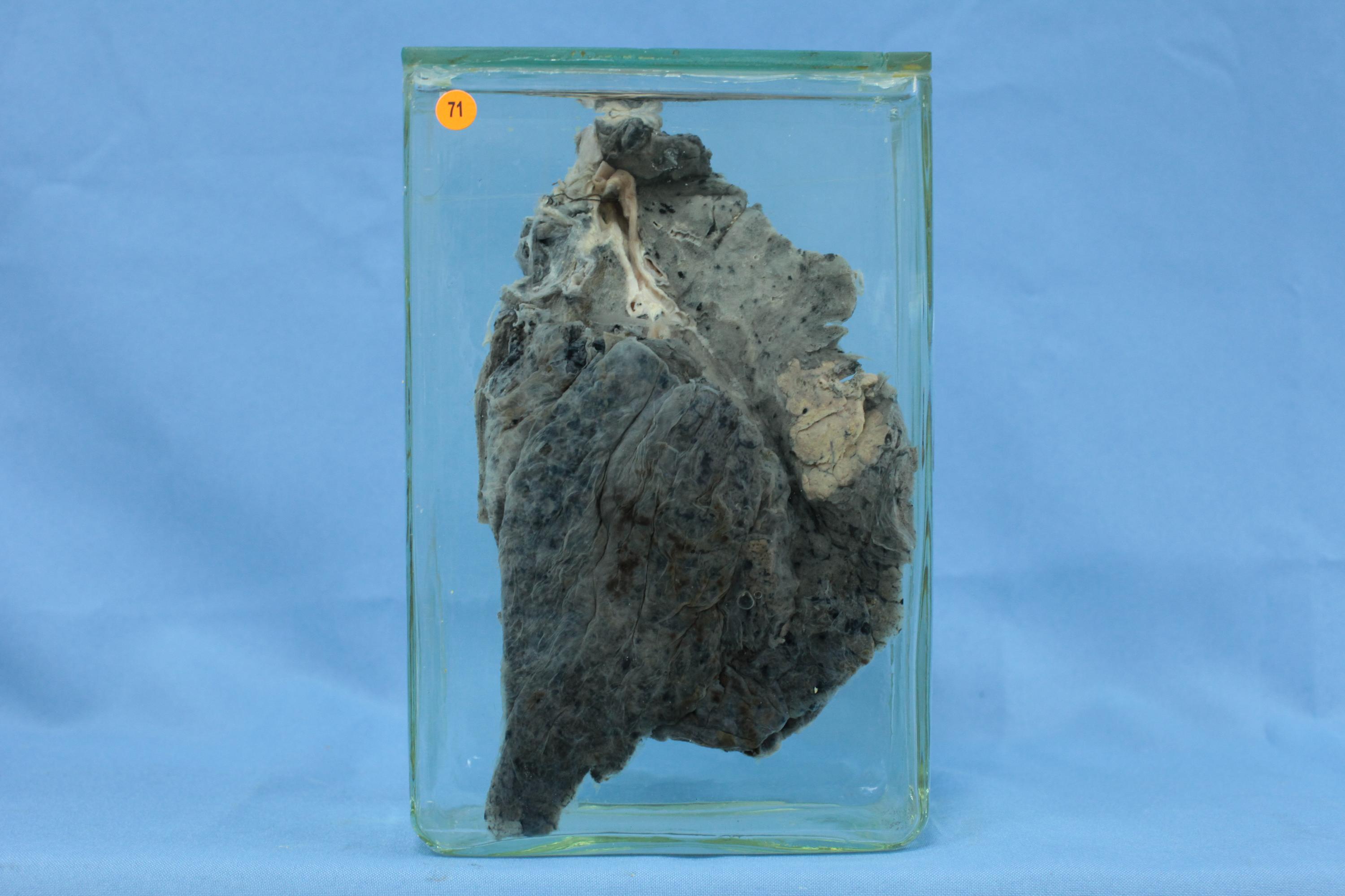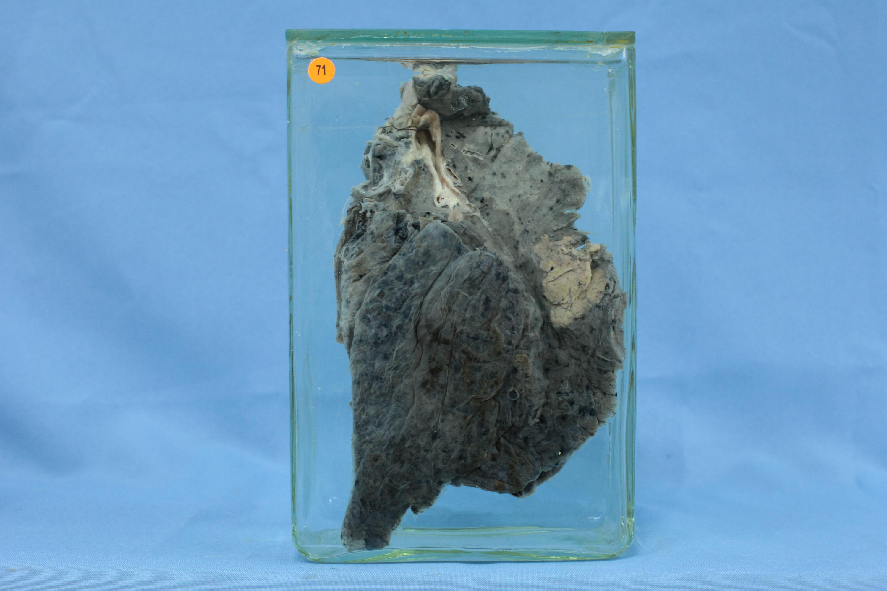 下肺外周近胸膜处见灰白色肿块,3.5×2.5×2cm,无包膜,呈分叶状,局灶区肿瘤累及胸膜。