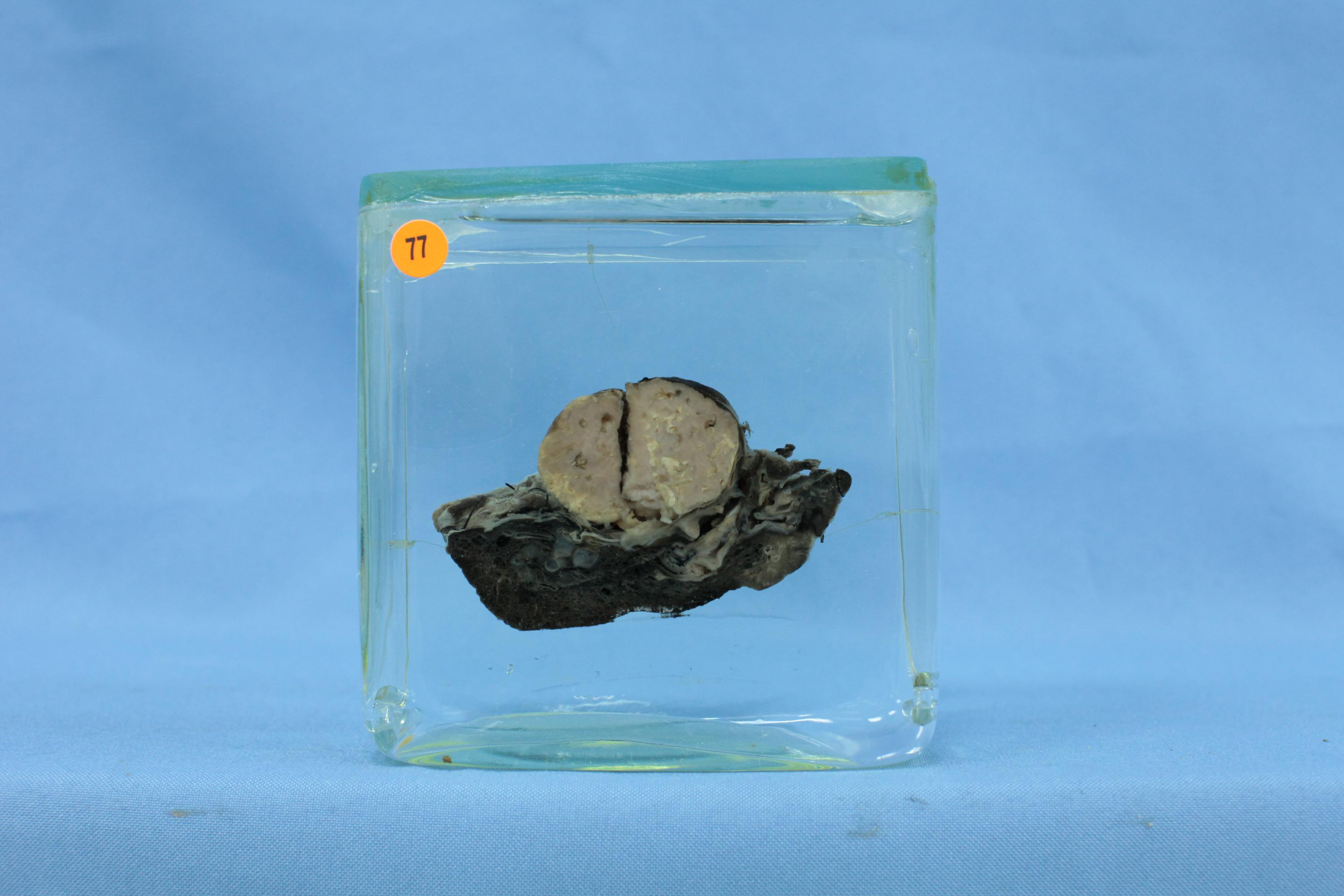 右肺下叶胸壁面见一3.5×2.5×2.5cm肿块,有包膜,切面乳白色、灰黄色相间,有软骨质感,质硬、脆。