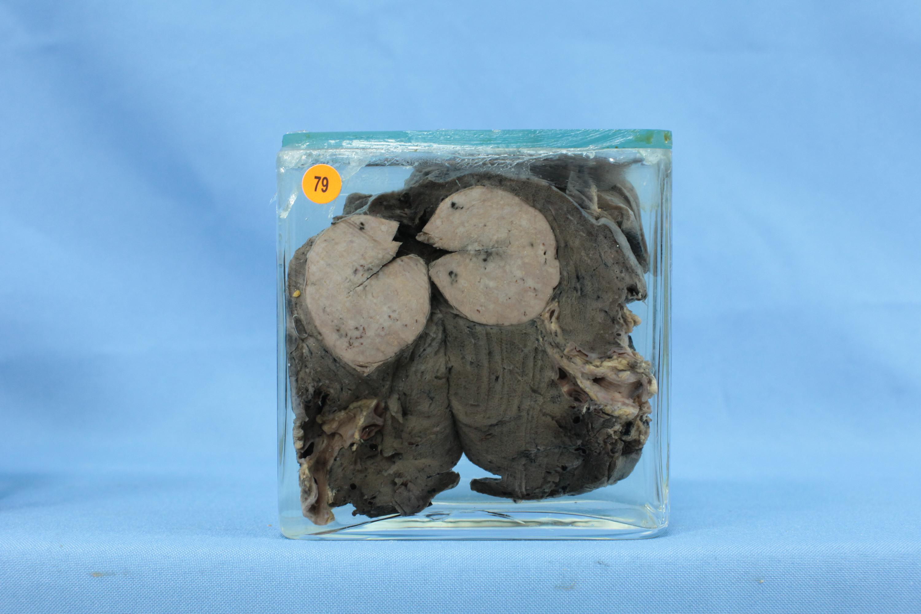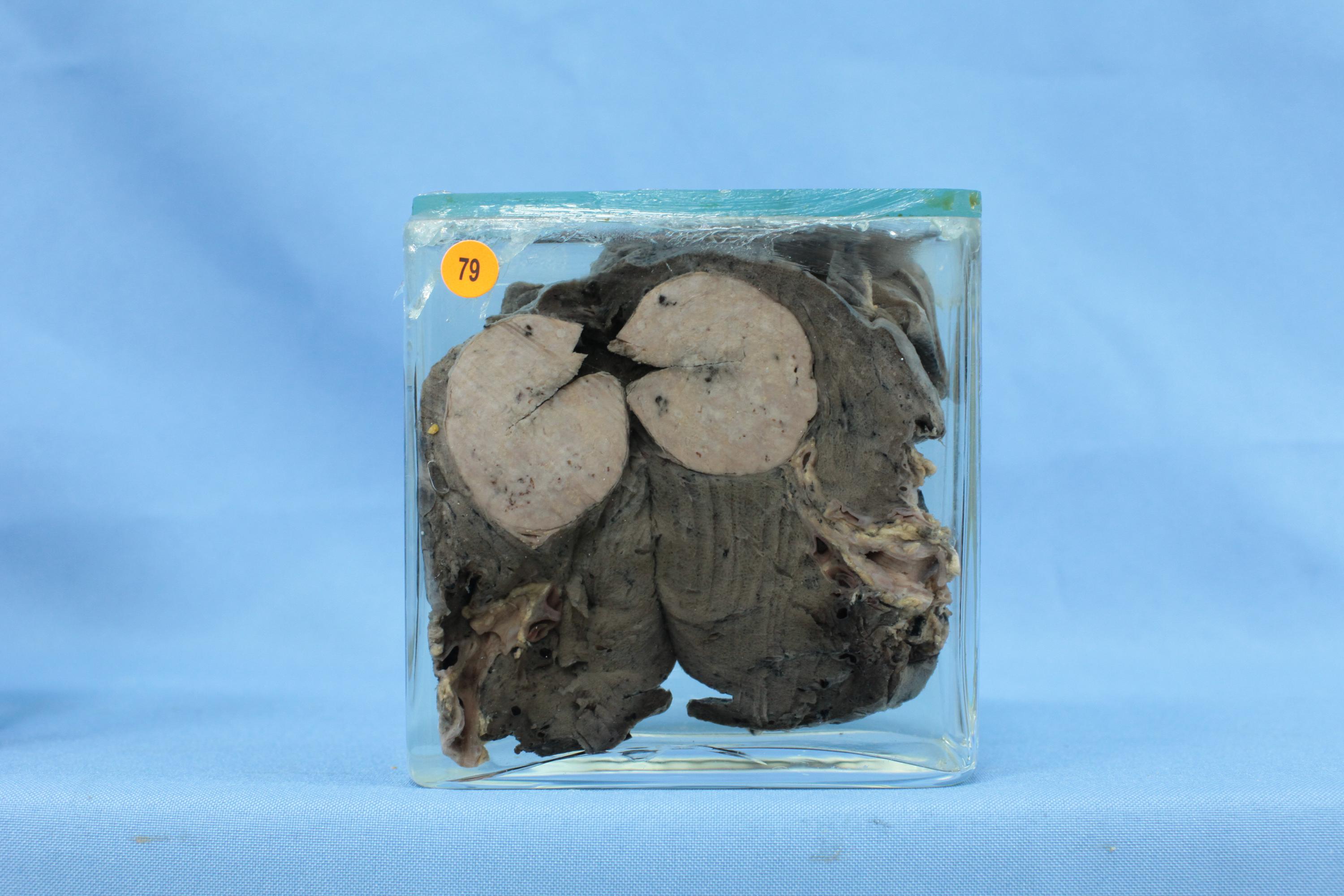左下肺外周近胸膜处见一直径3.4cm的肿块,切面乳白色,略红,呈束状结构,散在有小的出血点,质硬,界清,似有包膜。此瘤生物学行为不确定,以前被误称为炎性假瘤。