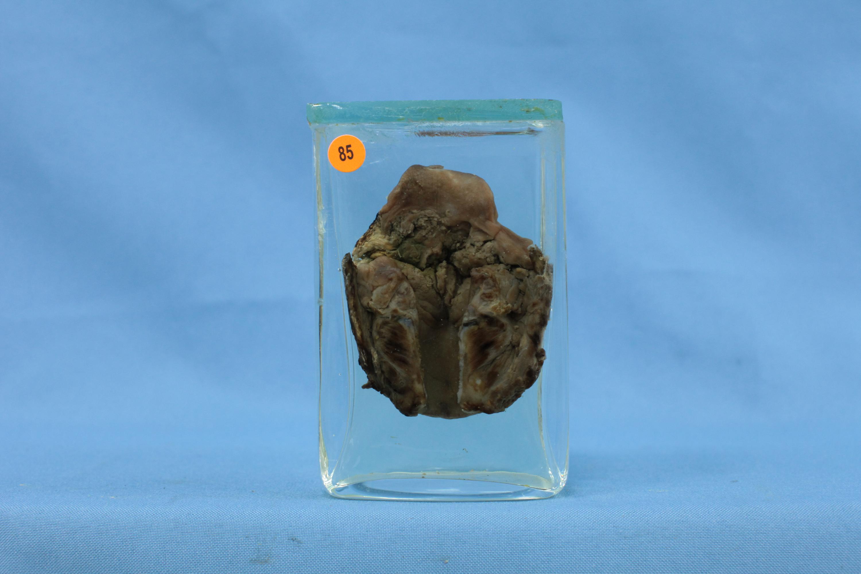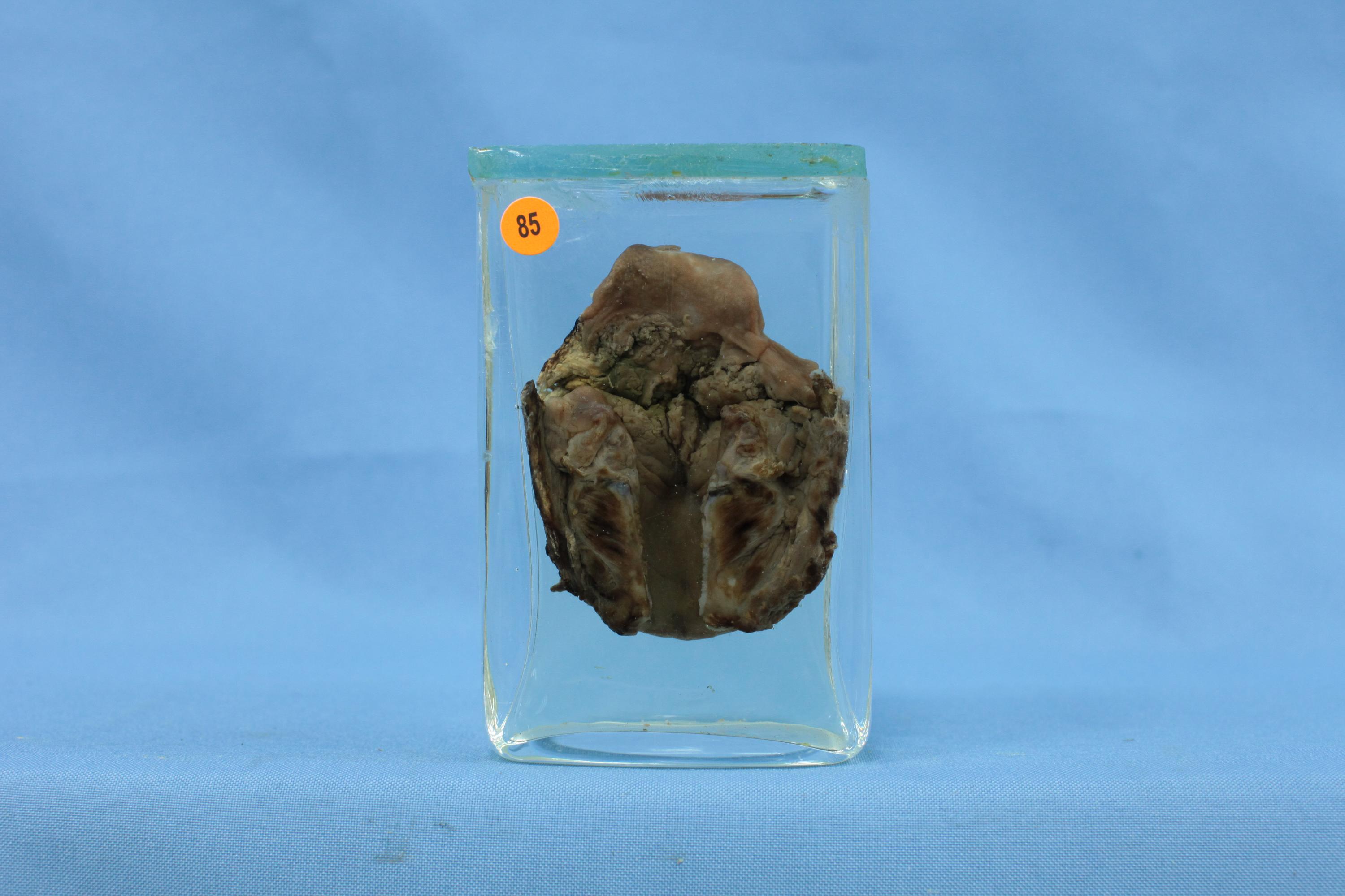 声带前上方见2.5×2×1cm溃疡形肿块,表面有破溃,切面灰白色,向前累及舌下缘。