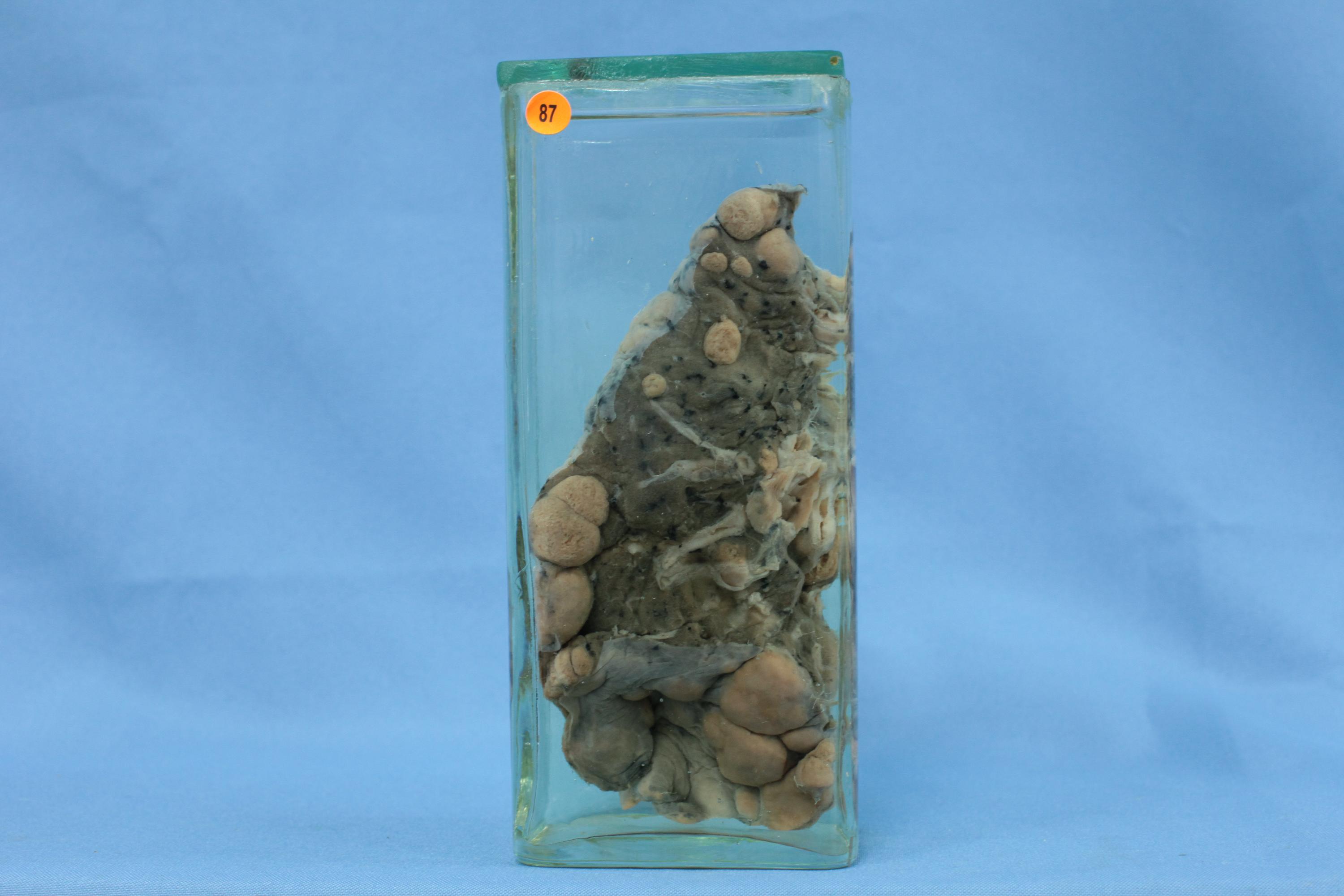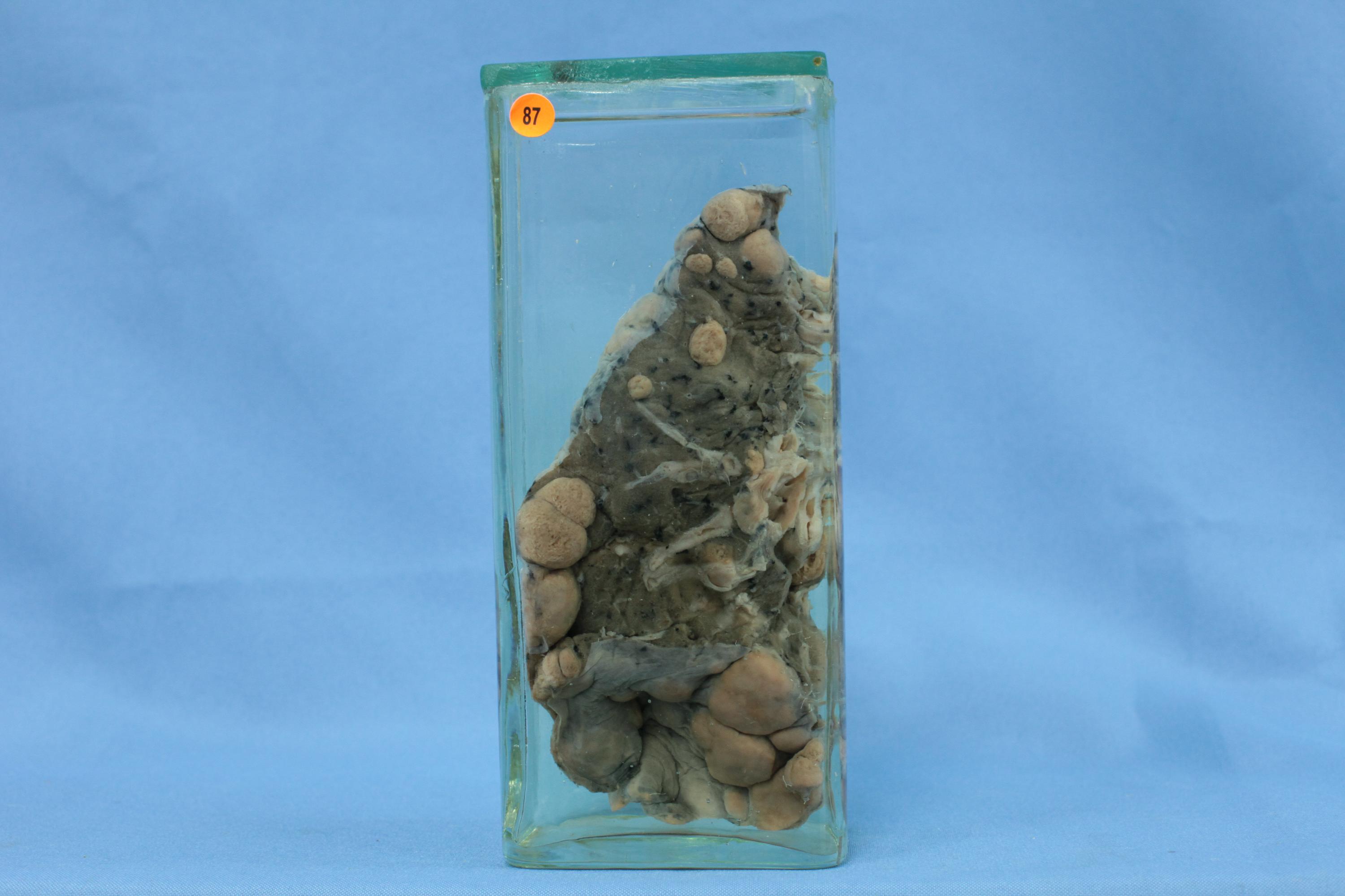 肺叶表面和切面均见散在球形灰白色肿块,直径0.5~1.5cm,界清,肺周边部多见,有的胸膜面中央有凹陷。