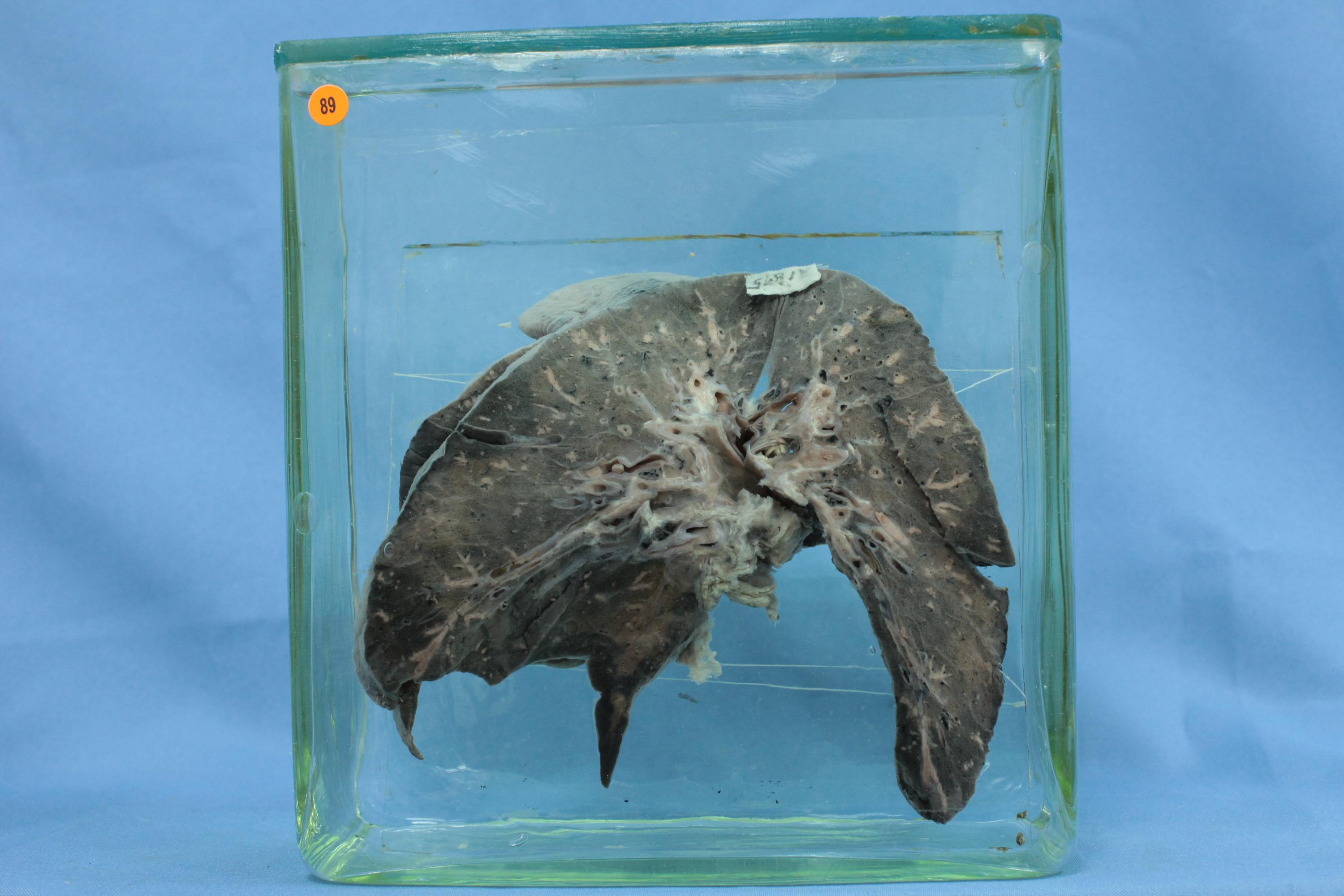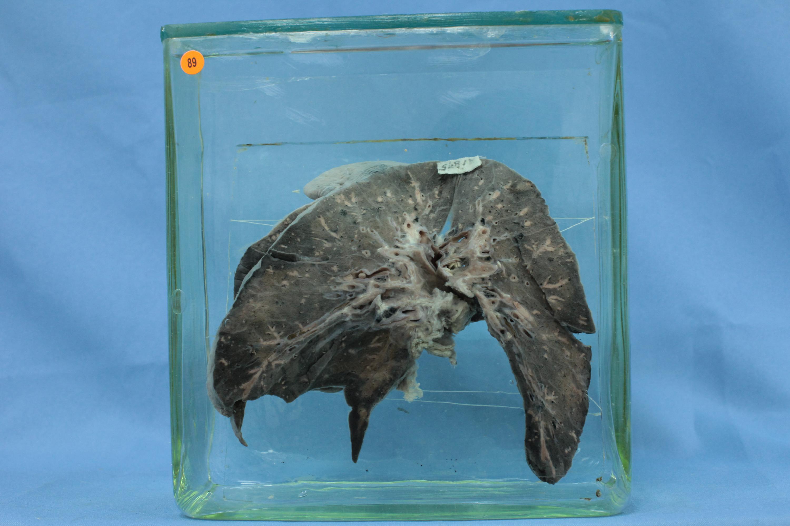 胸膜无明显病变。切面肺组织见大小不一、扩张的血管,内充满灰白色圆柱状物质。
