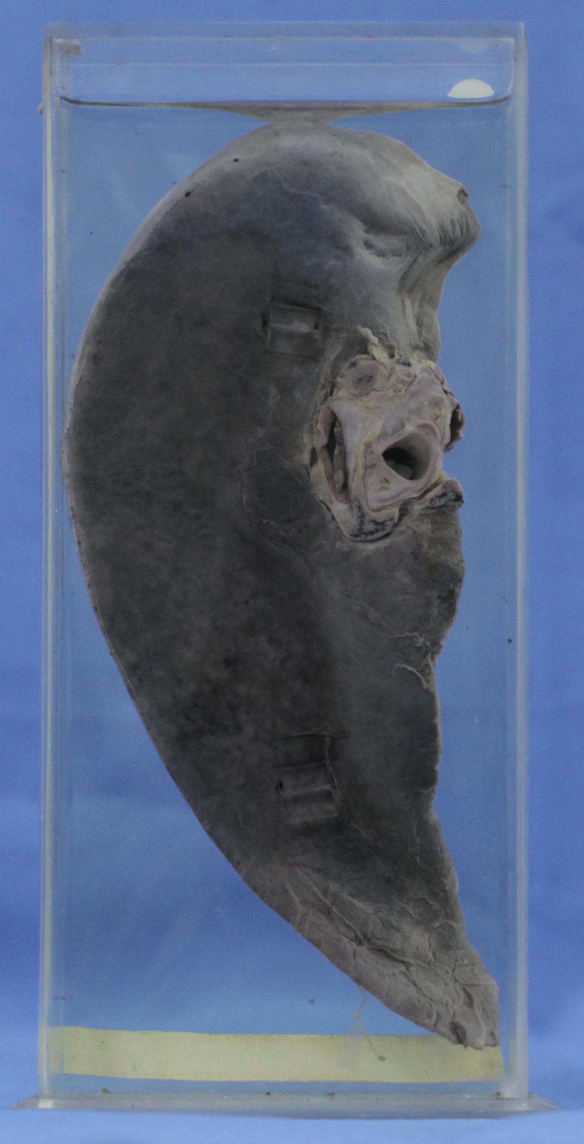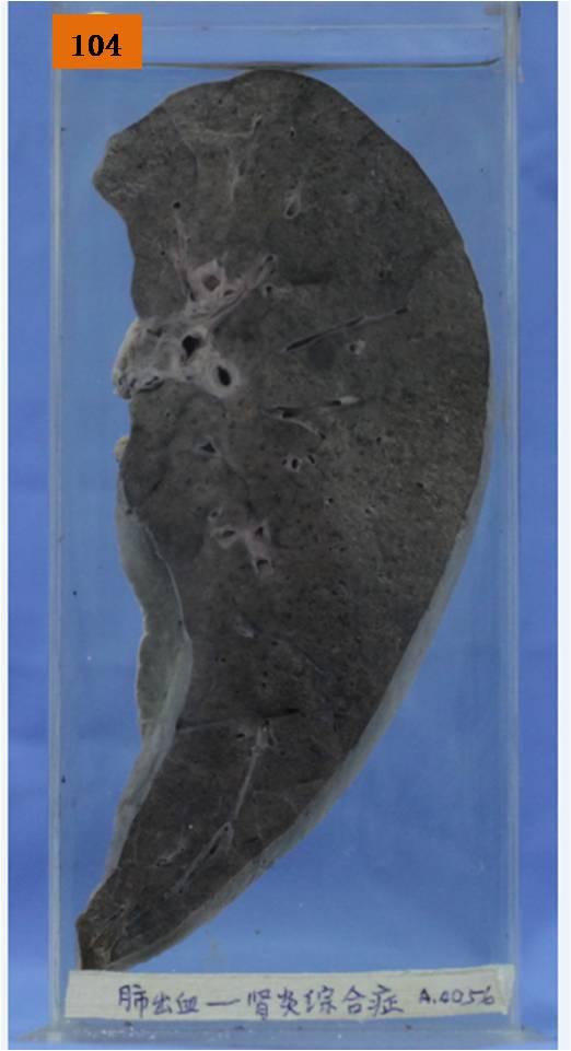 肺组织较为饱满,胸膜少量纤维性粘连,切面肺组织暗红色,并见片状灰黄色斑块状分布区域,气腔缩小。