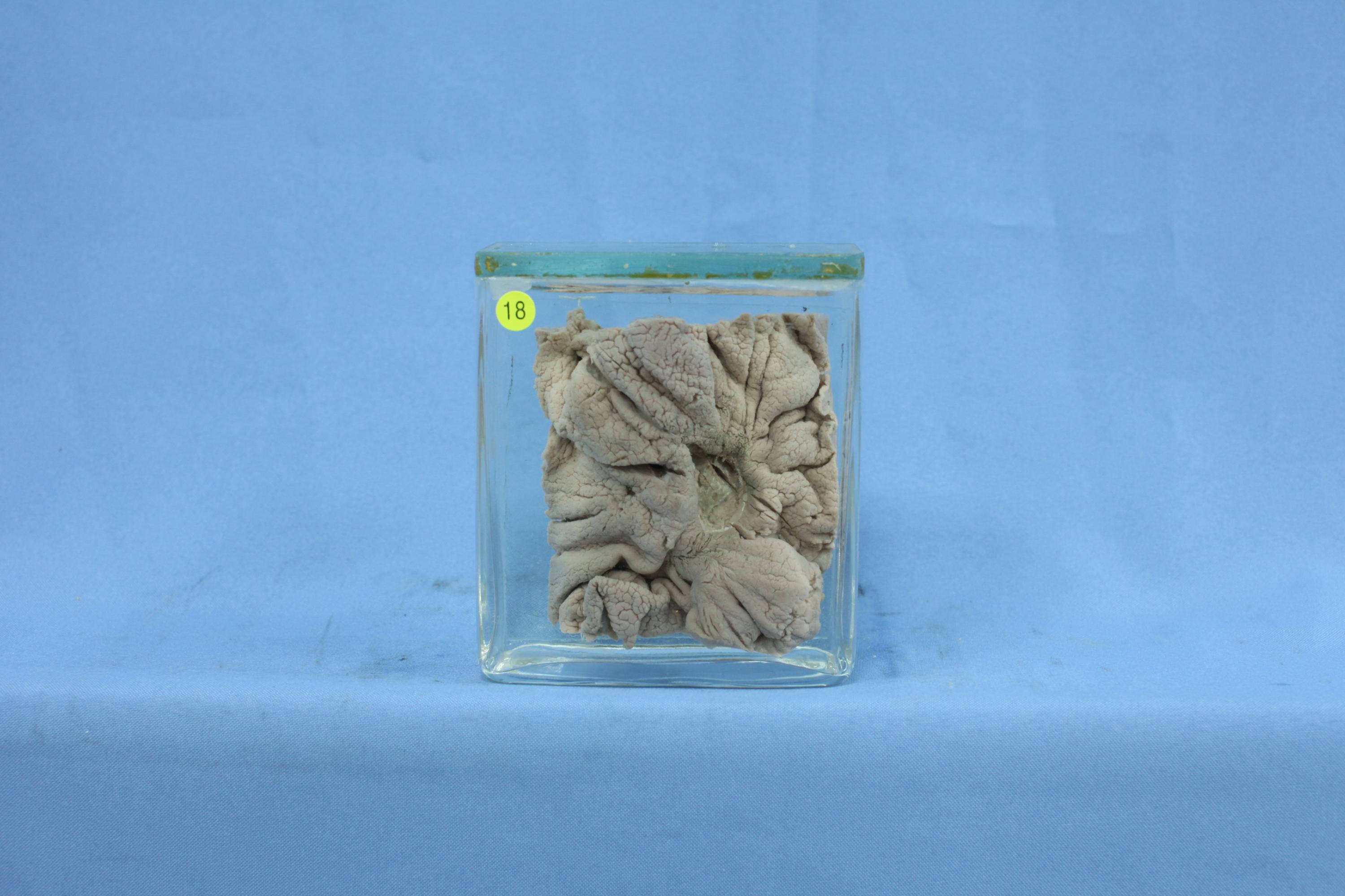 切开胃标本,标本中央有直径1.5厘米组织缺损,底部较干净,周边粘膜粗糙,粘膜皱襞以缺损为中心呈放射状排列。
