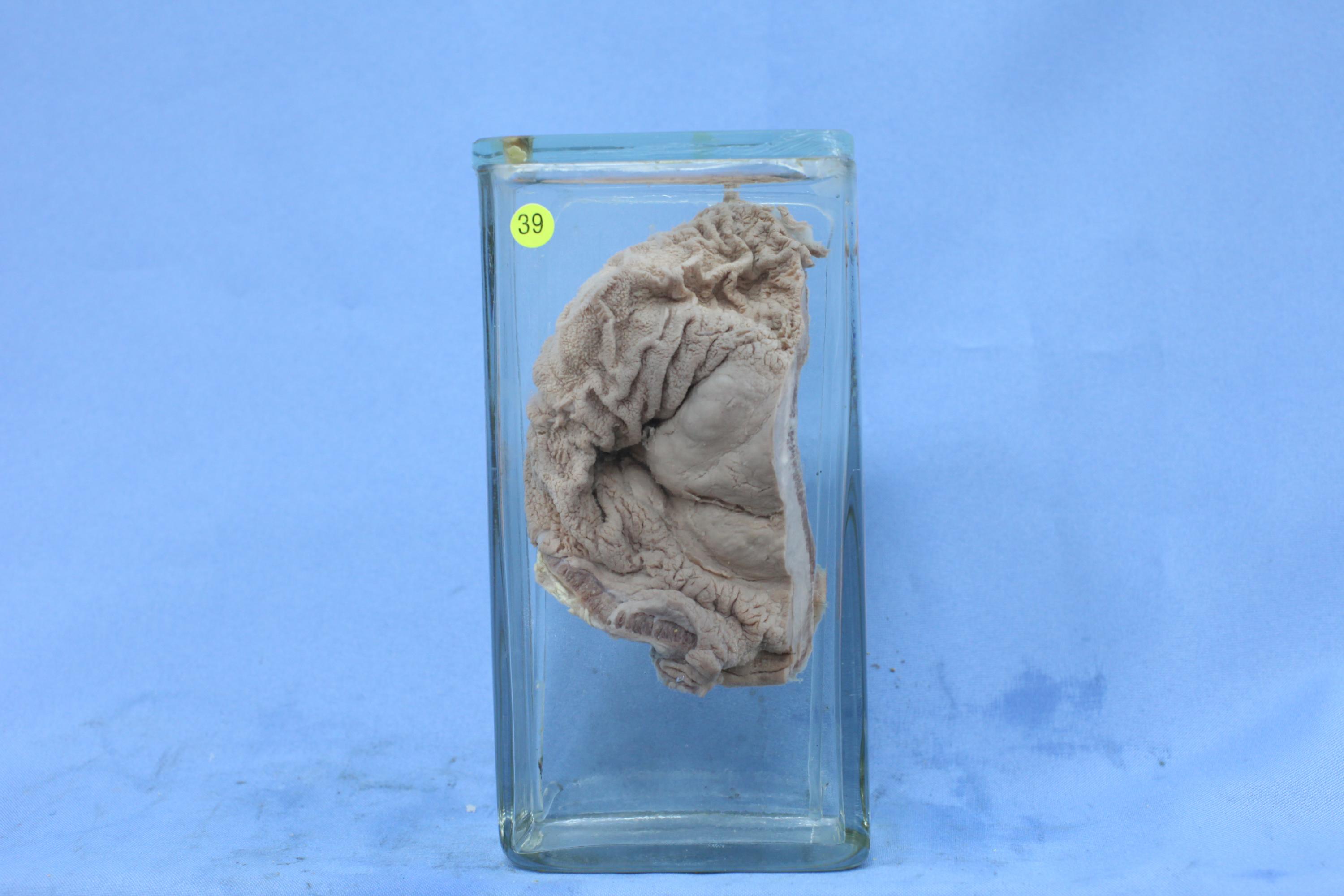 切除的半个胃标本。胃黏膜面见直径约7厘米的胃皱襞消失区,该区黏膜表面光滑,切面见胃壁增厚、变硬,灰白色,未见明显肿物。