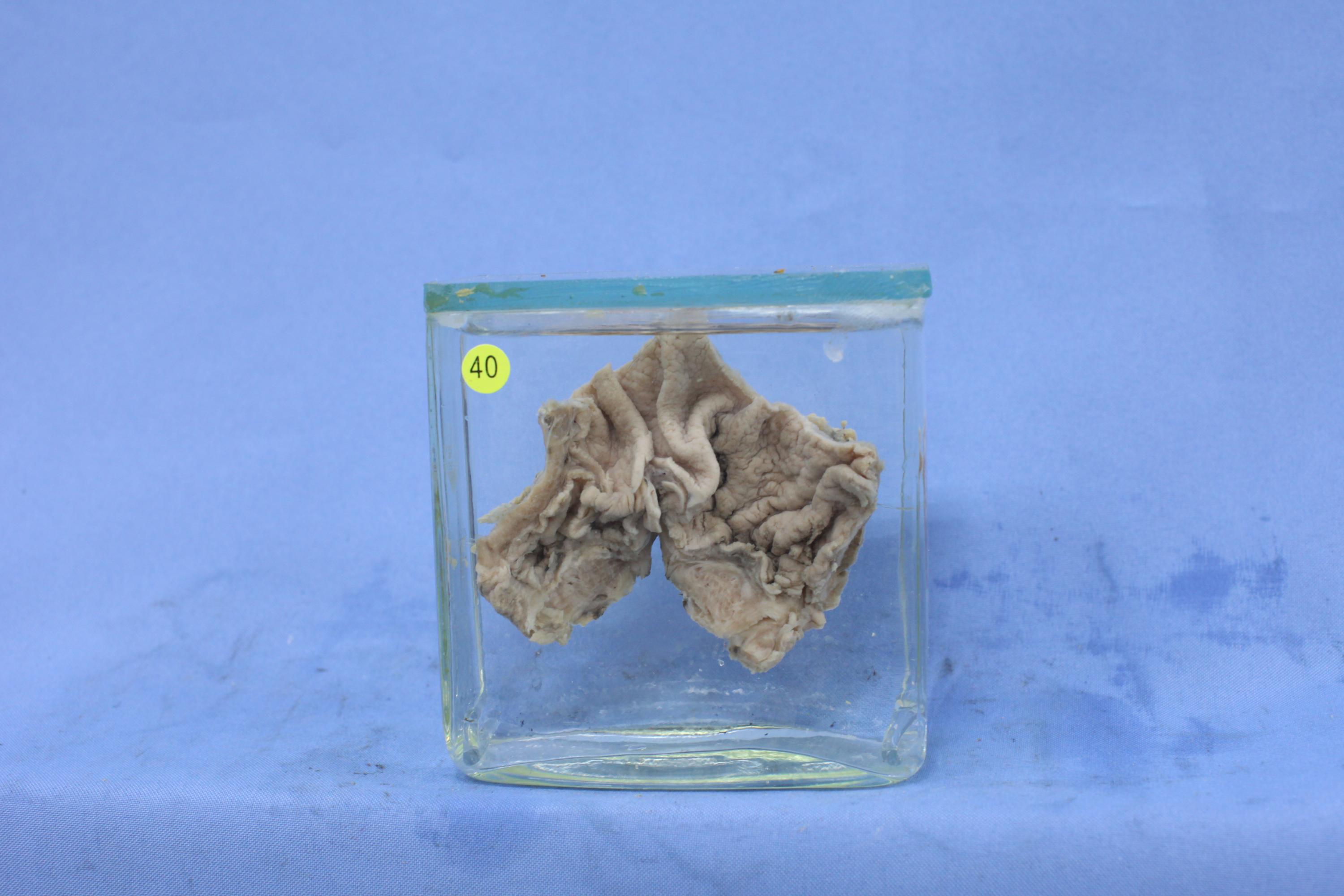 切除的胃部分标本。距一侧切缘1厘米处有一个已剖开的椭圆球形肿物,约3×1.5厘米,肿瘤灰白色,界清,有包膜,切面呈编织状。