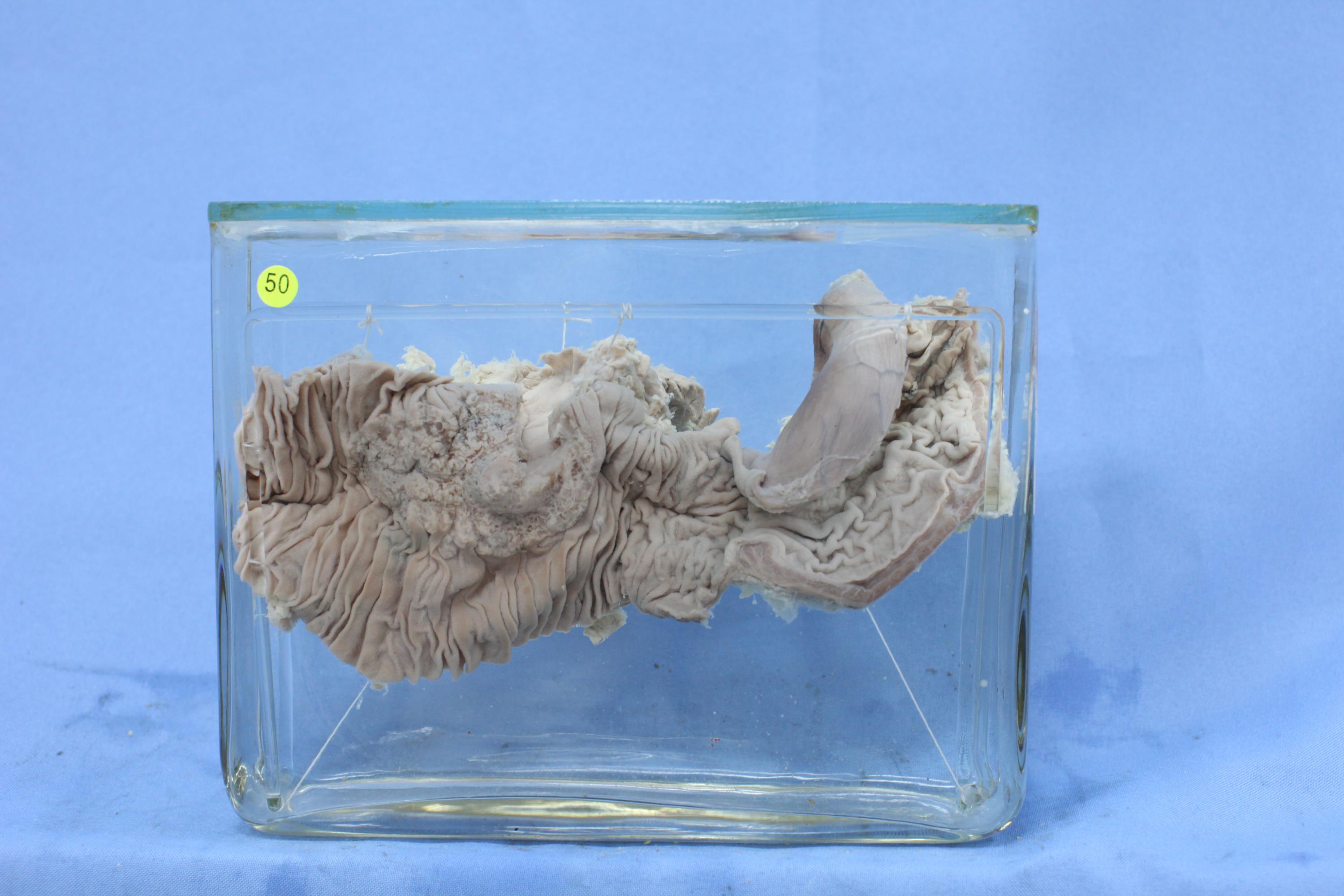 长12厘米十二指肠及部分胃切除标本。距肠切缘4厘米处见一个直径约5厘米的菜花样肿物,其略突出肠黏膜表面,广基,形状不规则,灰白色,呈浸润性生长,肠粘膜被破坏。