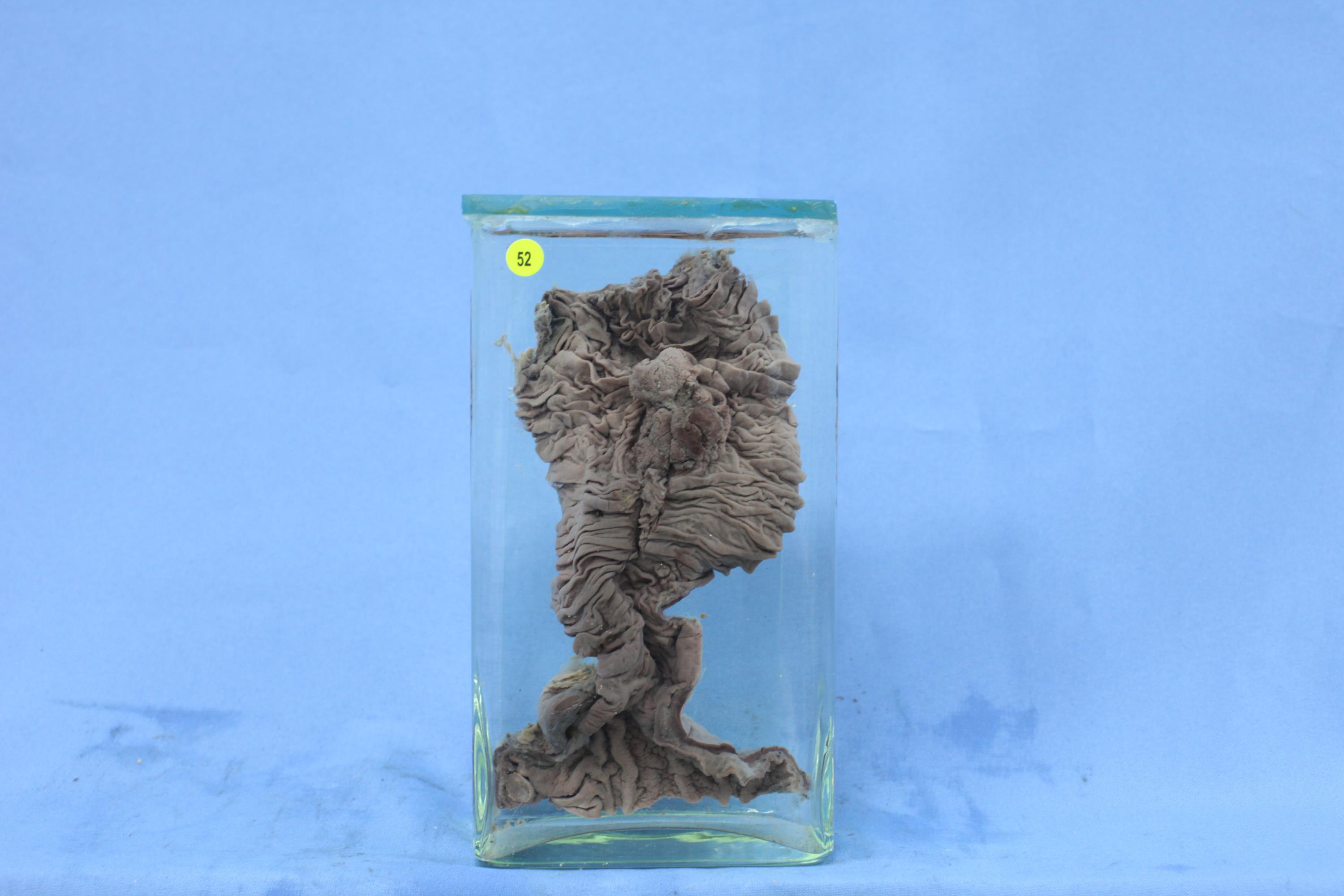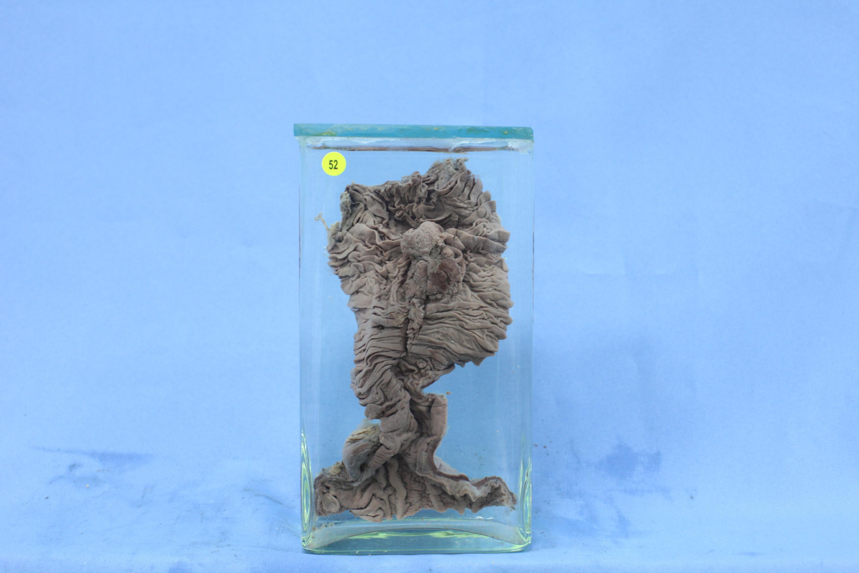长14厘米十二指肠及部分胃切除标本。距肠切缘5厘米处黏膜面有一个4×3厘米的向肠腔内突出的菜花样肿物,肿物表面粗糙、暗红色,与周围组织分界尚清。