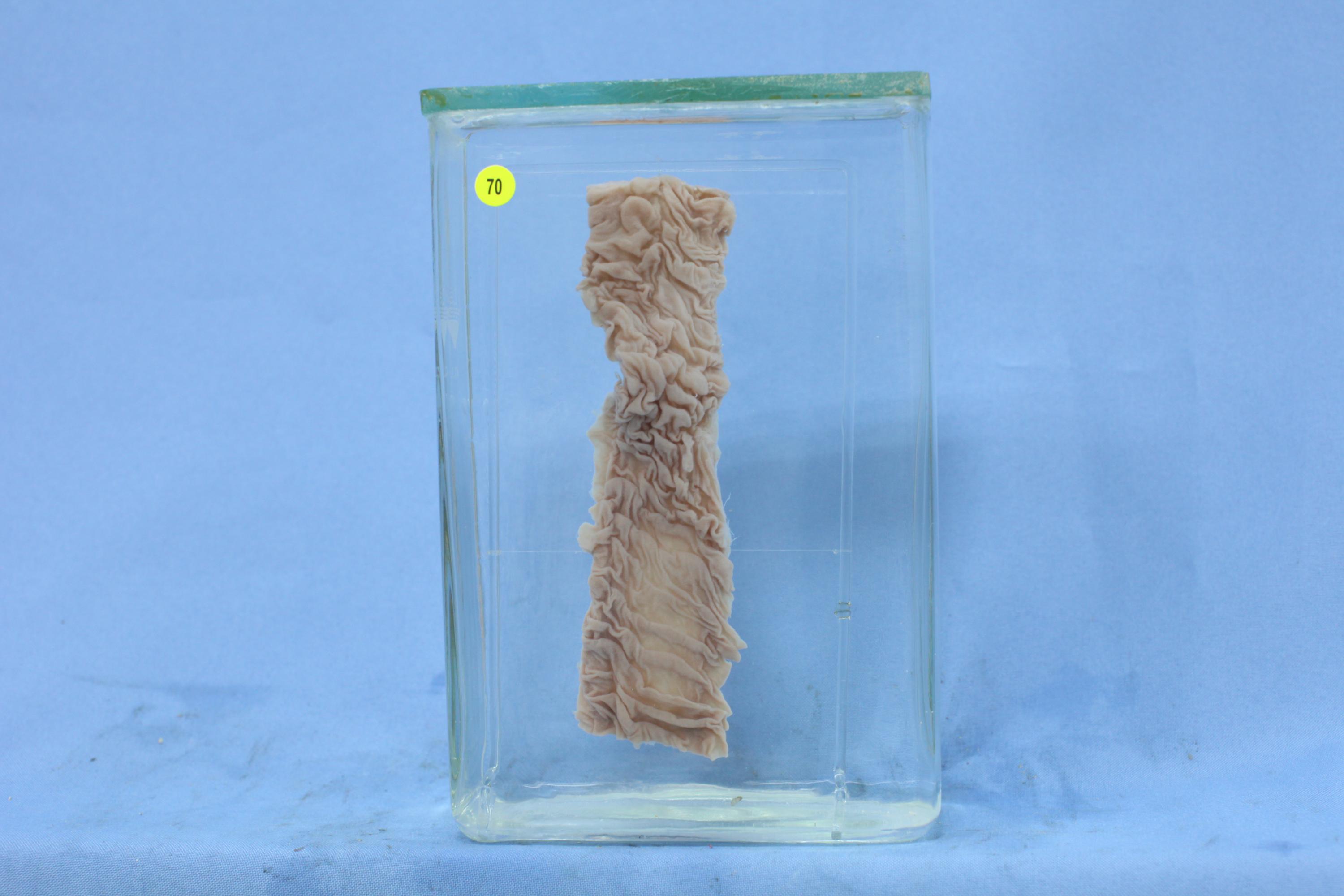 71岁,女性。因发热,咳嗽,神志不清3天入院,之后昏迷达5月之久,经昏迷的护理,鼻饲,抗菌素抗炎,维持水电解质平衡,血压以升压药维持。继发呼吸道感染和褥疮死亡 标本为约11厘米的肠段。肠壁增厚,肠皱襞增粗、肿胀,黏膜苍白呈水汪汪样。