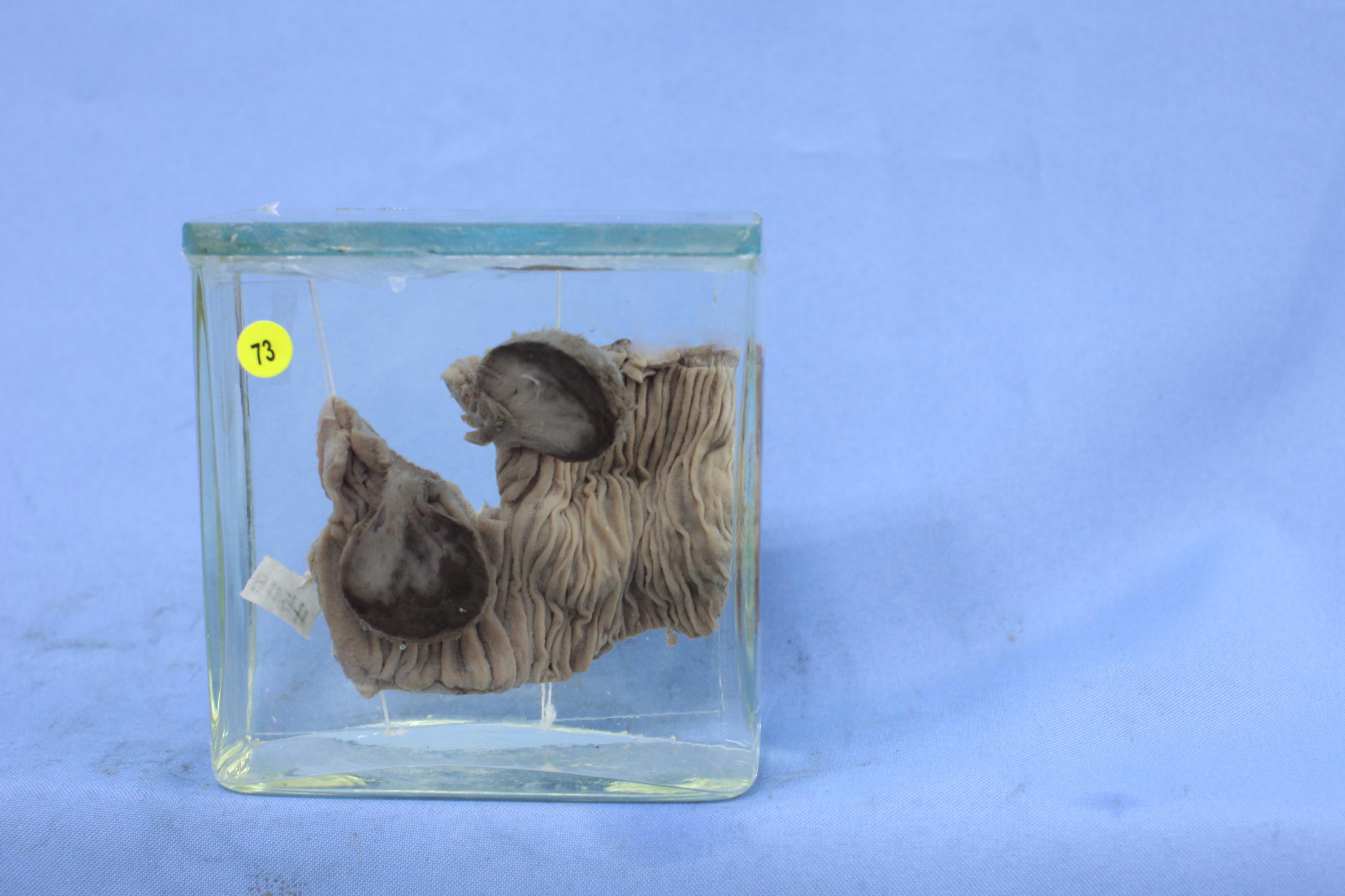 长约6厘米小肠一段,距一侧切缘1厘米处黏膜表面见带蒂的球形肿瘤,其直径约2.5厘米,突向肠腔内,表面光滑;切面质地均匀致密,边缘呈紫红色,中间呈灰白色。