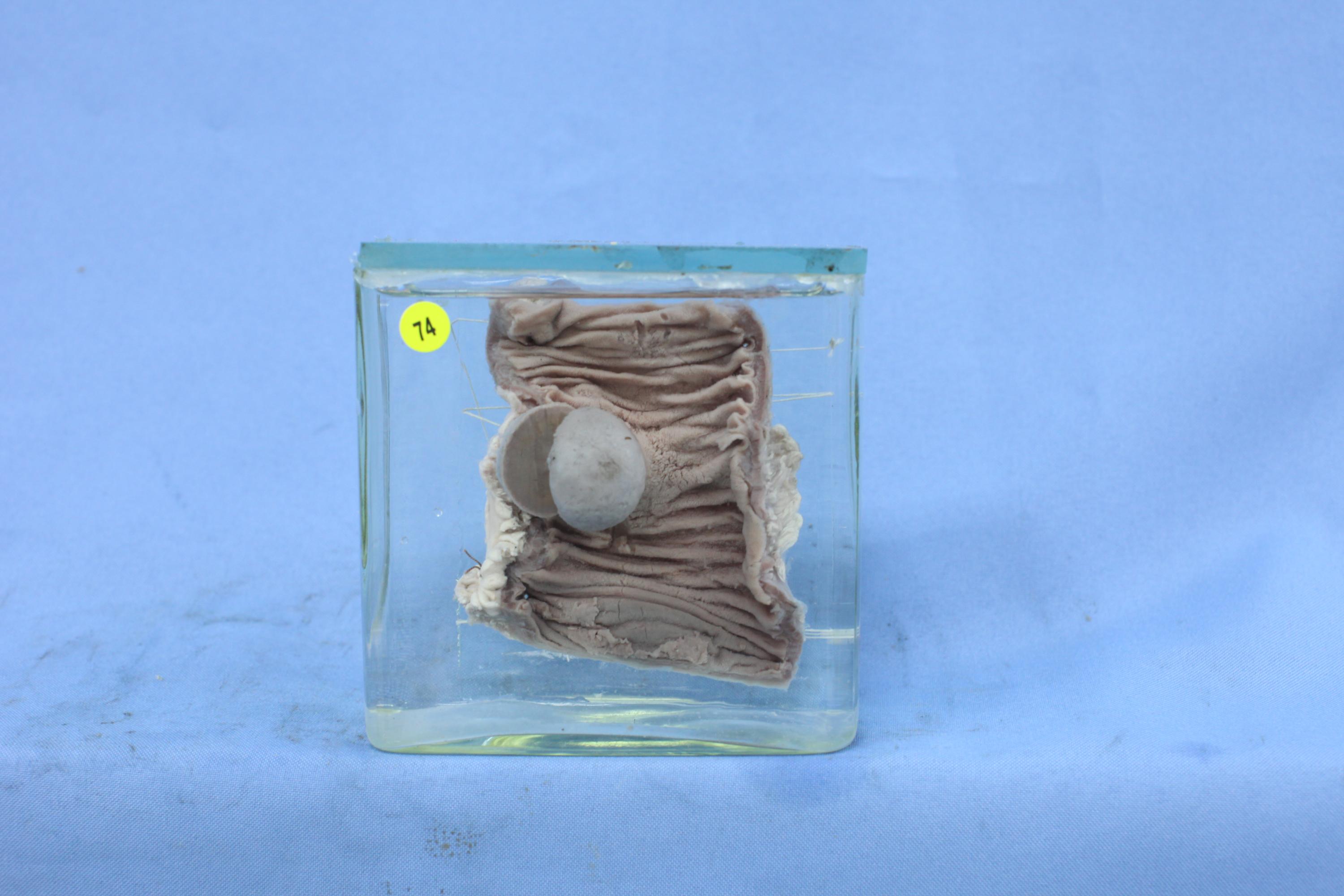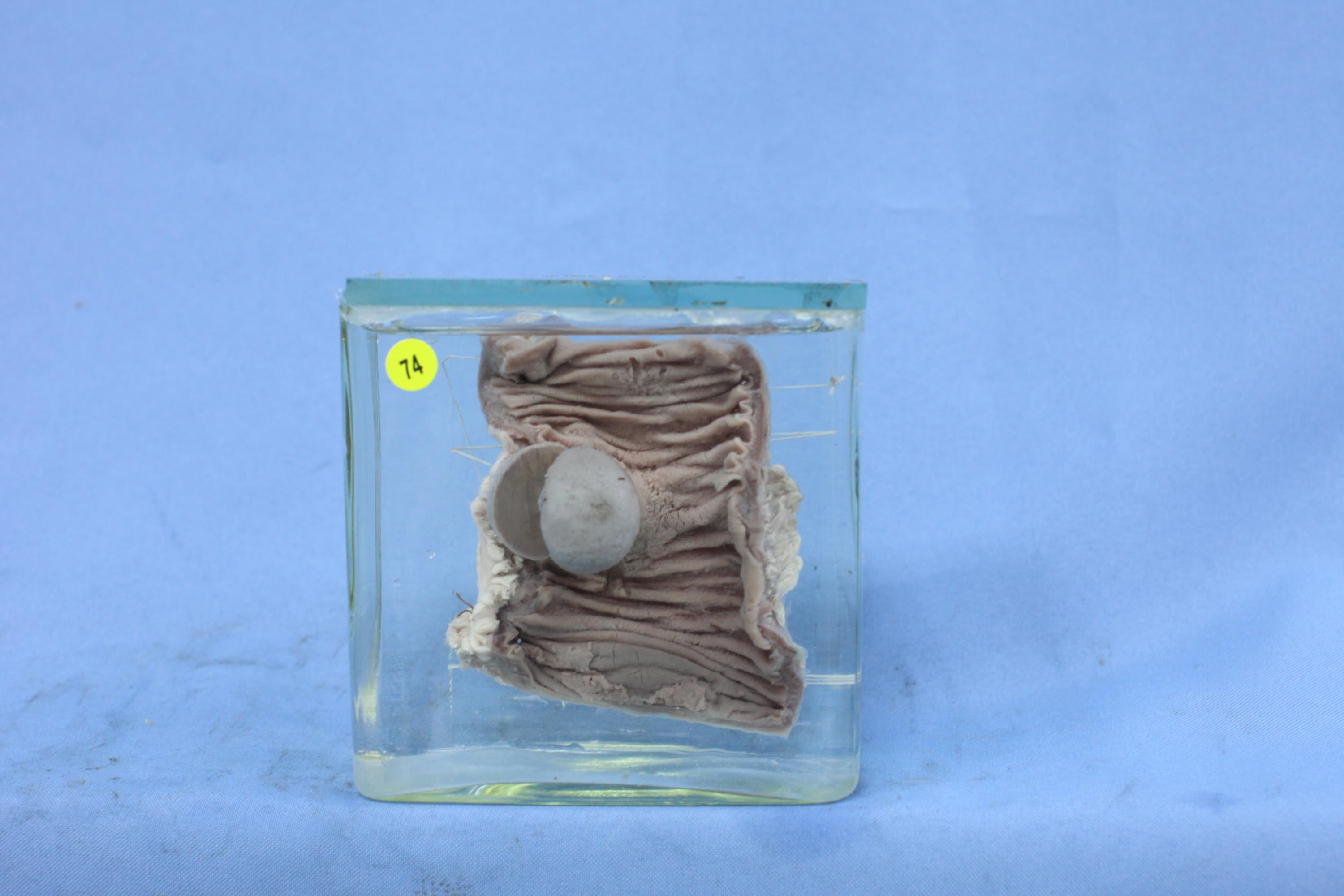 长约8厘米小肠一段,肠粘膜面见一个球形肿物突出入肠腔,其表面黏膜存在,黏膜皱襞消失;切面见肿瘤直径约3.5厘米,呈灰白色,质硬。