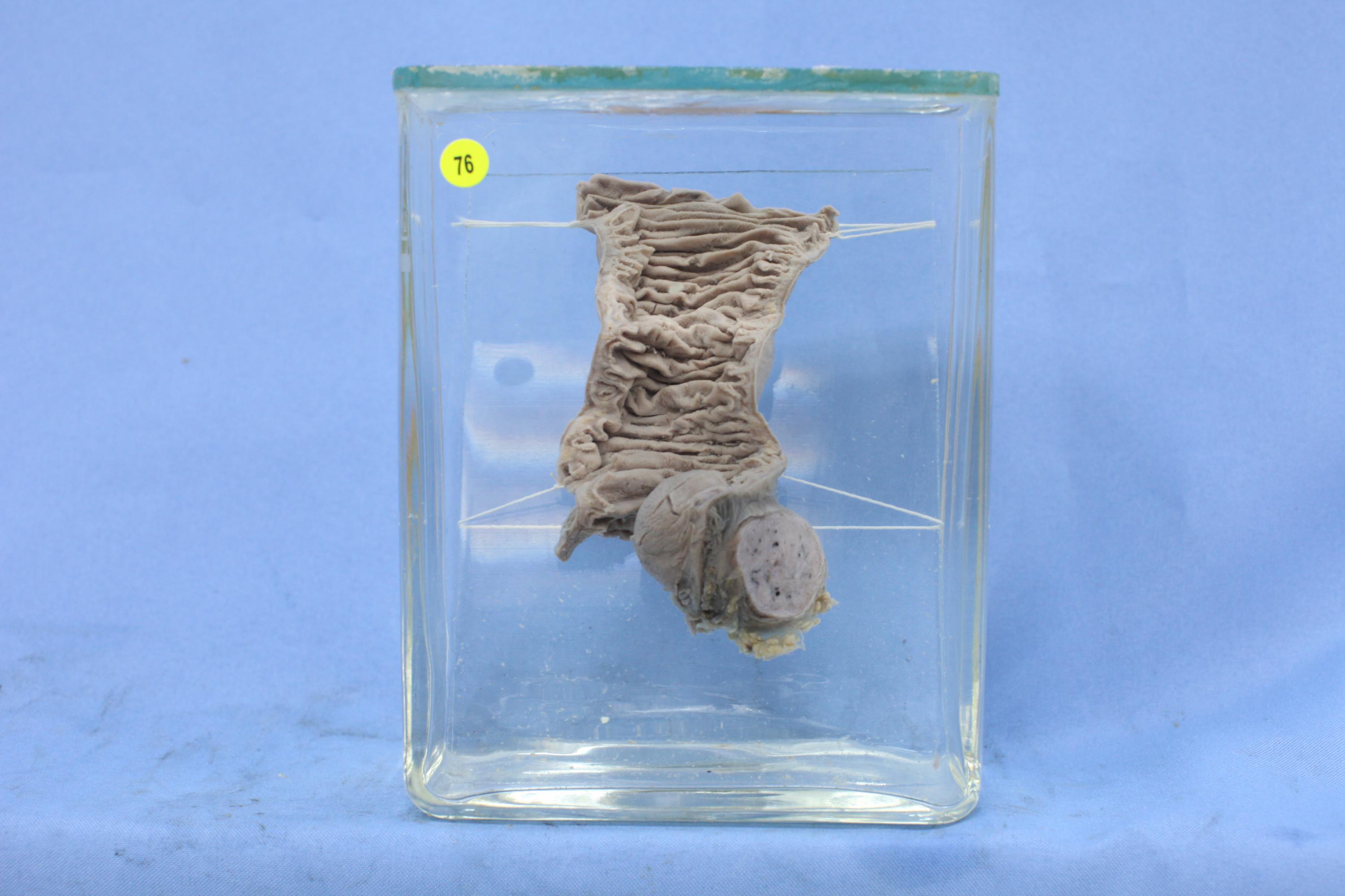 长约8厘米小肠一段,距一侧切缘1厘米处,小肠壁内见膨胀性生长的肿瘤1个,其直径3厘米,肿瘤向肠腔内、外突出,包膜完整;切面呈灰白色,可见散在分布的血管腔。