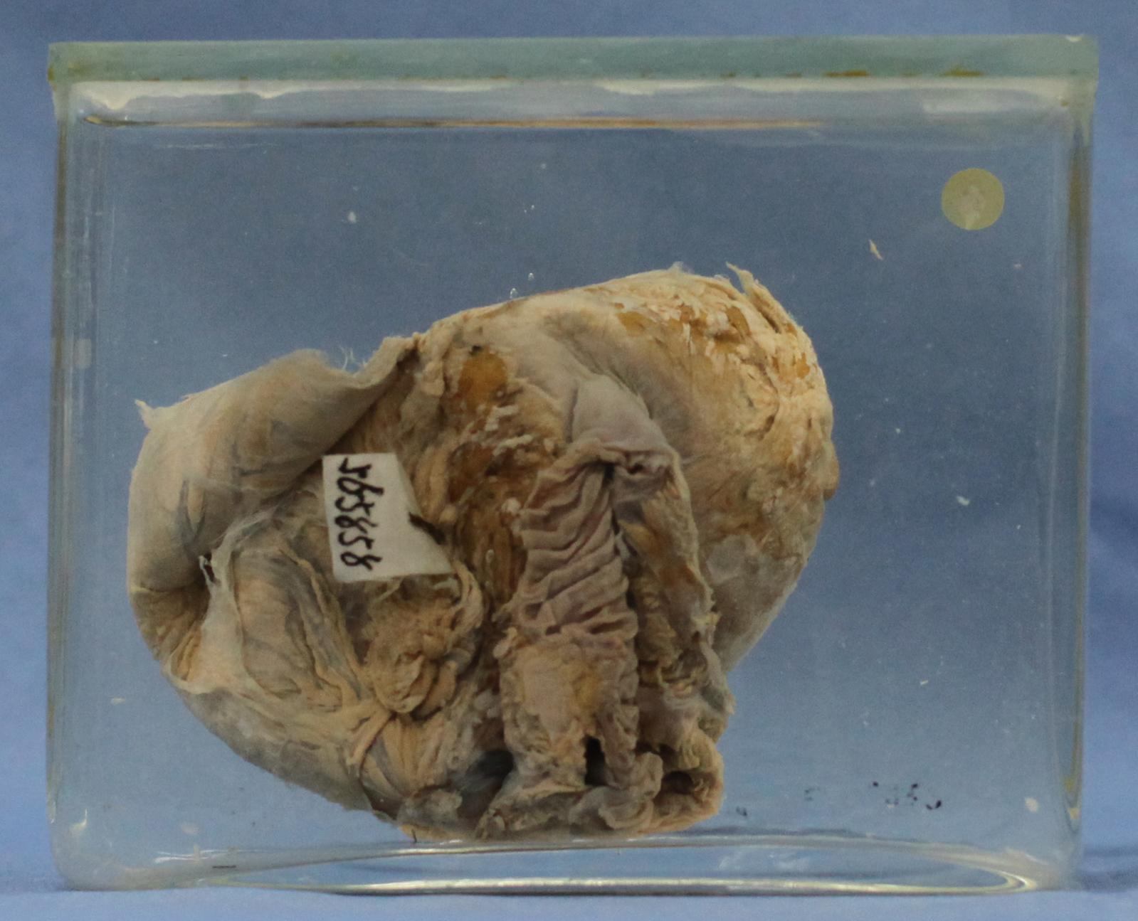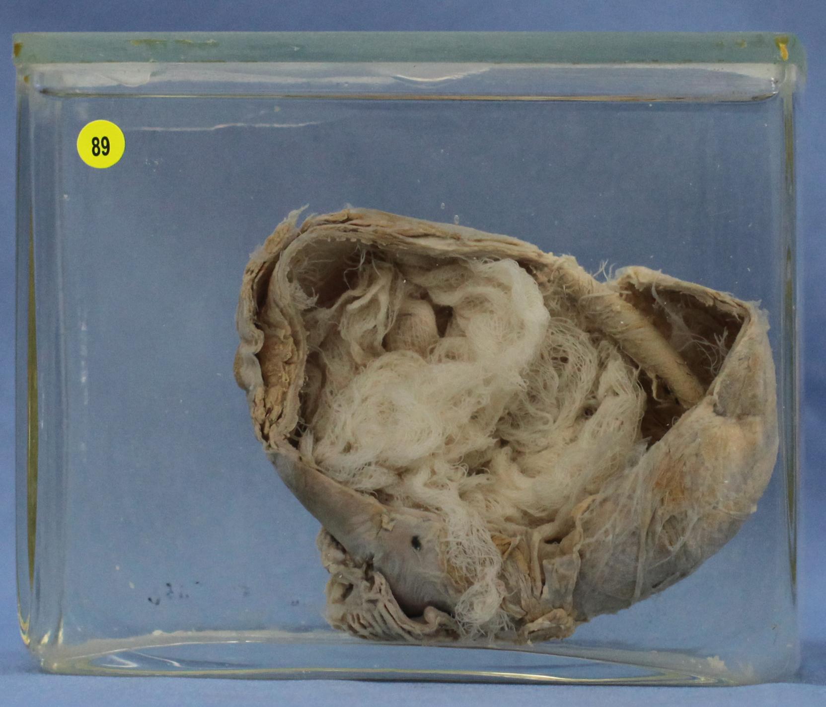 大网膜下囊块,与大网膜粘连紧密;囊壁光滑,壁较厚,内有疑似纱布填充,布质有腐毁现象。