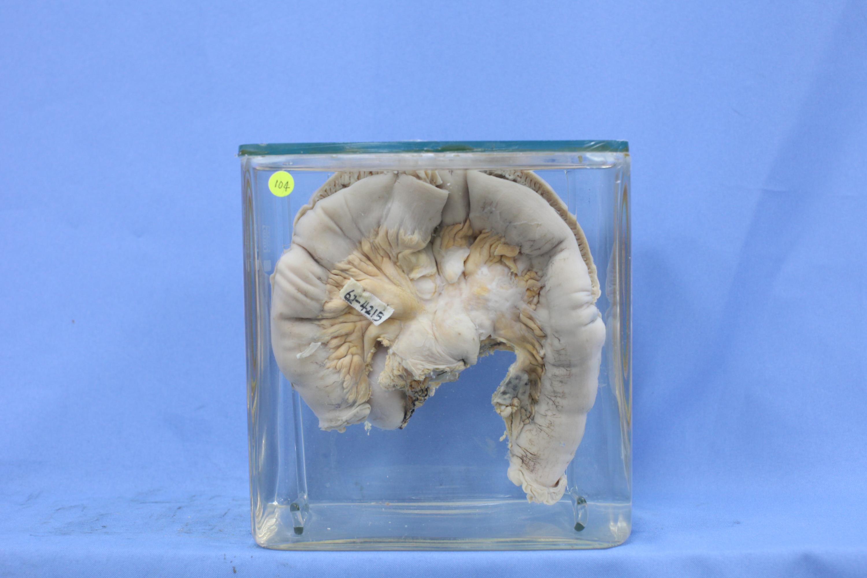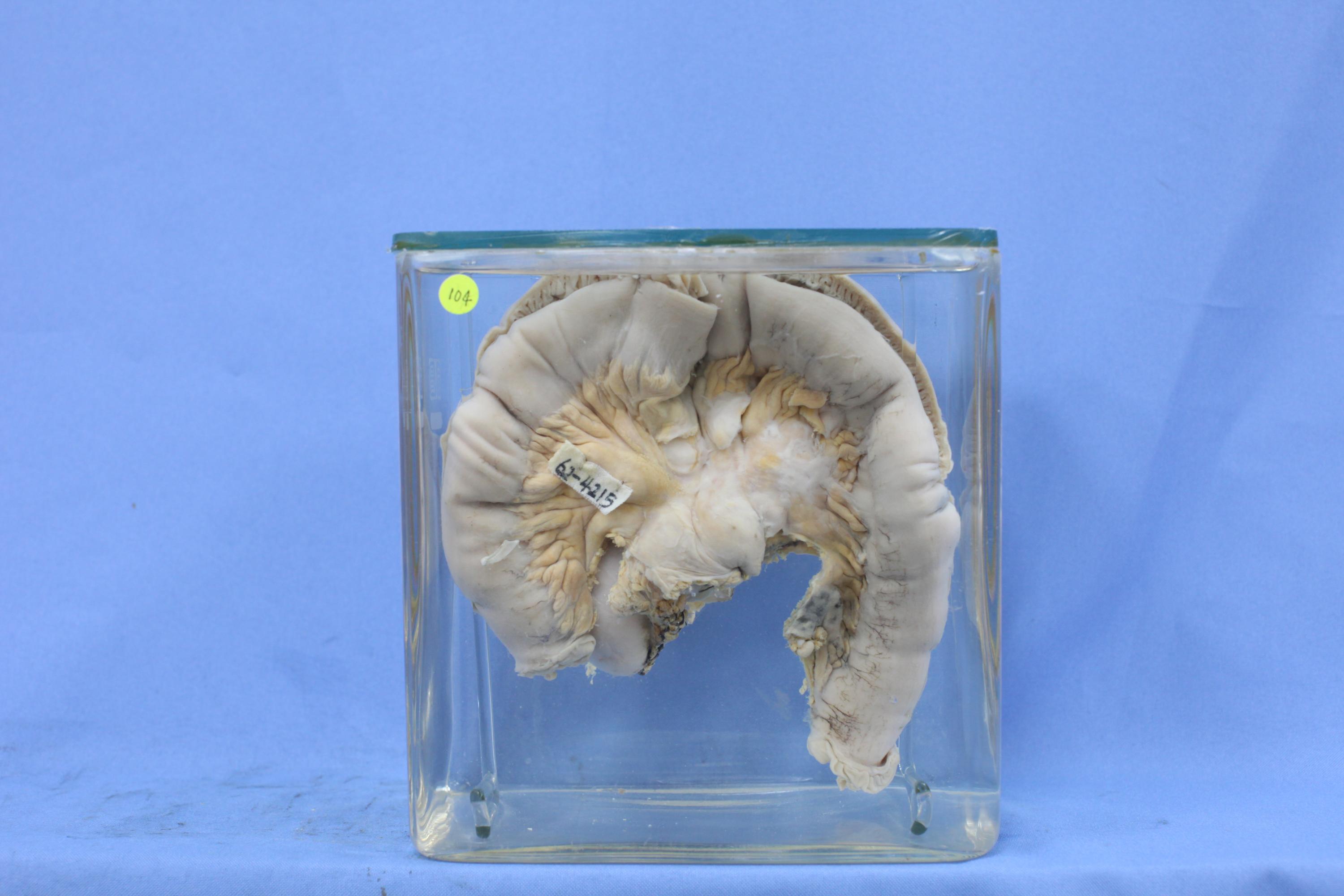 15厘米肠带肠系膜的标本,肠腔内无异常。肠系膜中见直径约3.5厘米的界清肿块,其表面呈浅黄色,局部可见出血灶;切面见肿瘤浅黄色、实性、质地细腻,有透明感。