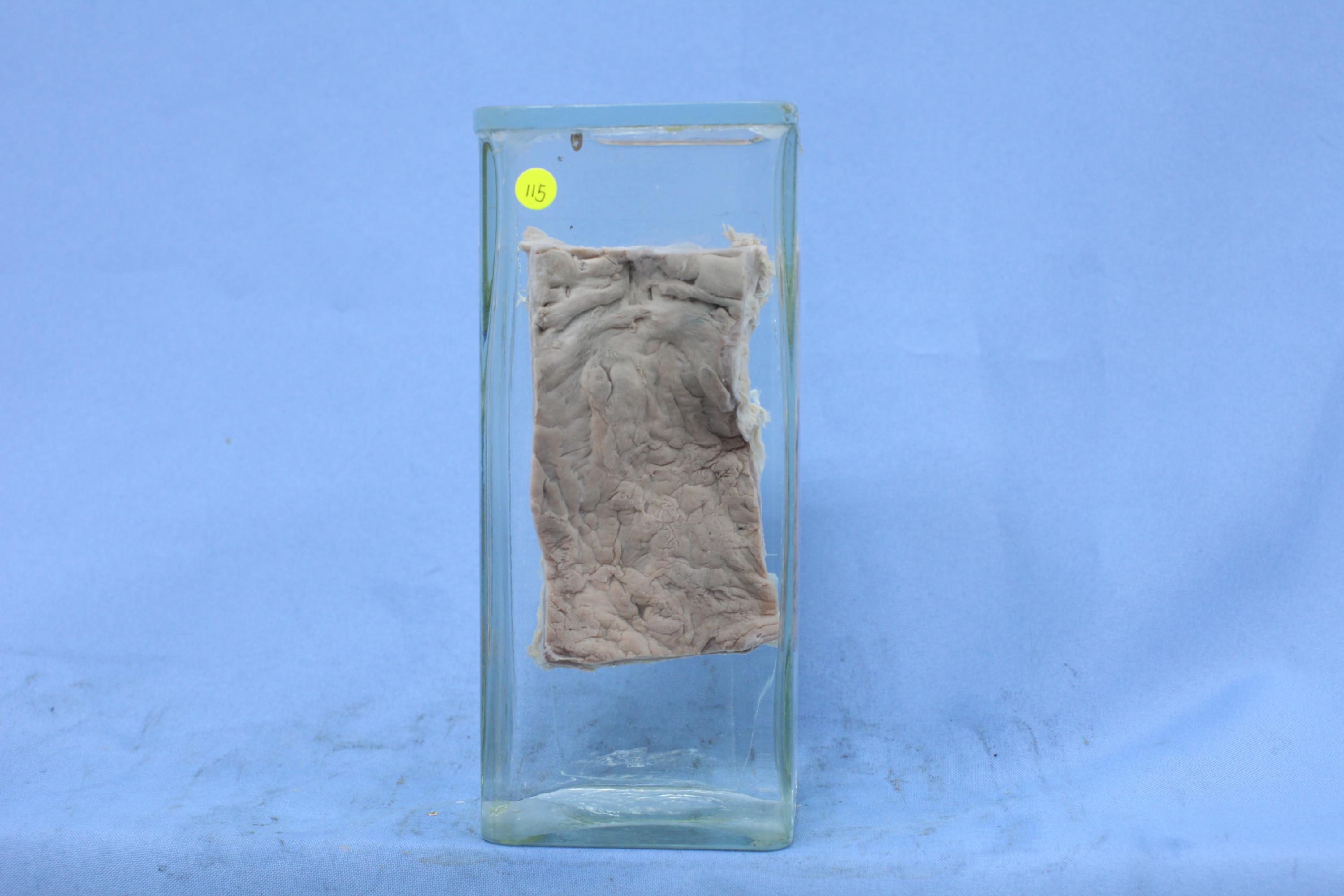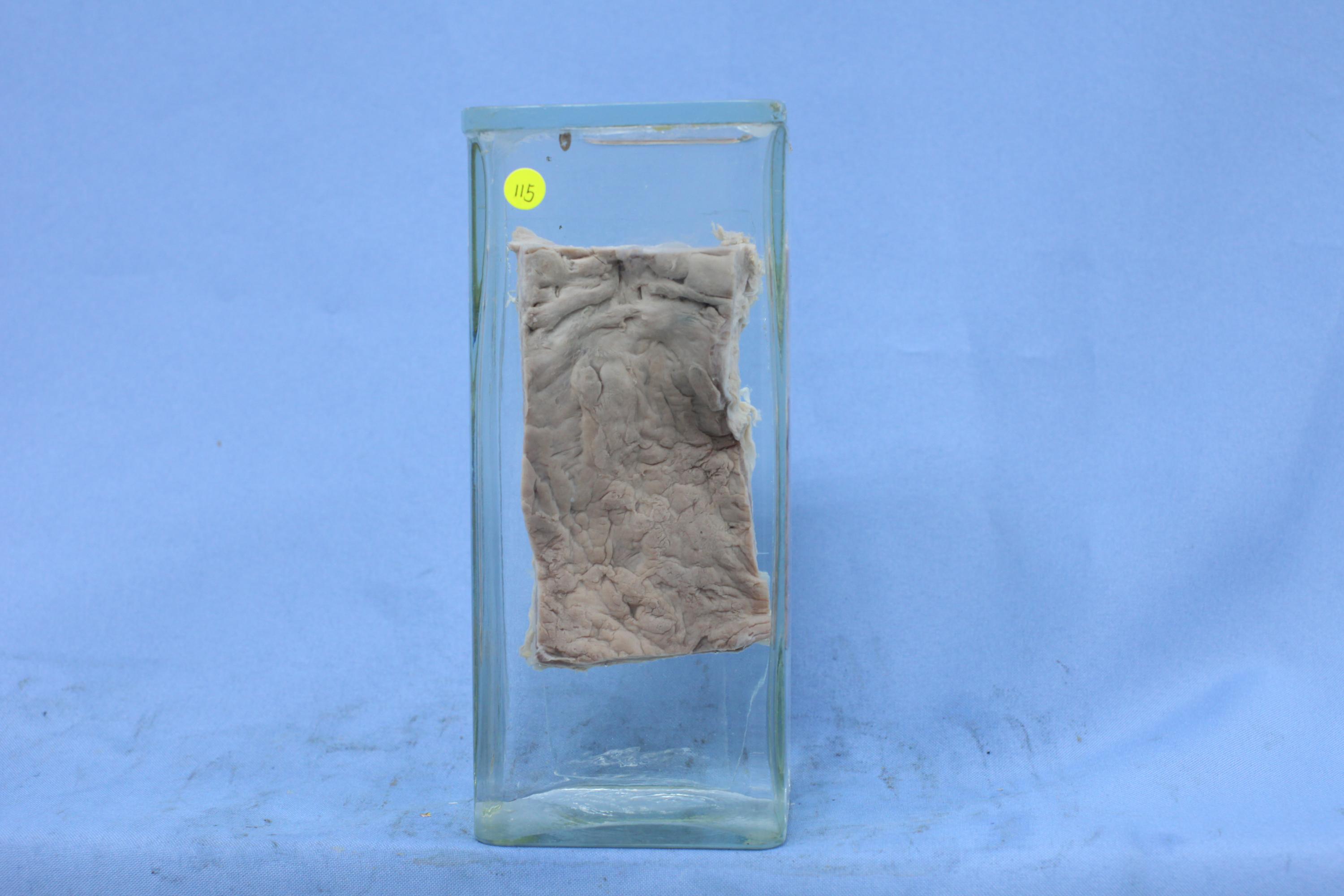 长约10厘米结肠标本。肠黏膜皱襞消失,黏膜表面不光滑,有多个浅表溃疡,溃疡之间黏膜明显肿胀。病变局限于黏膜。