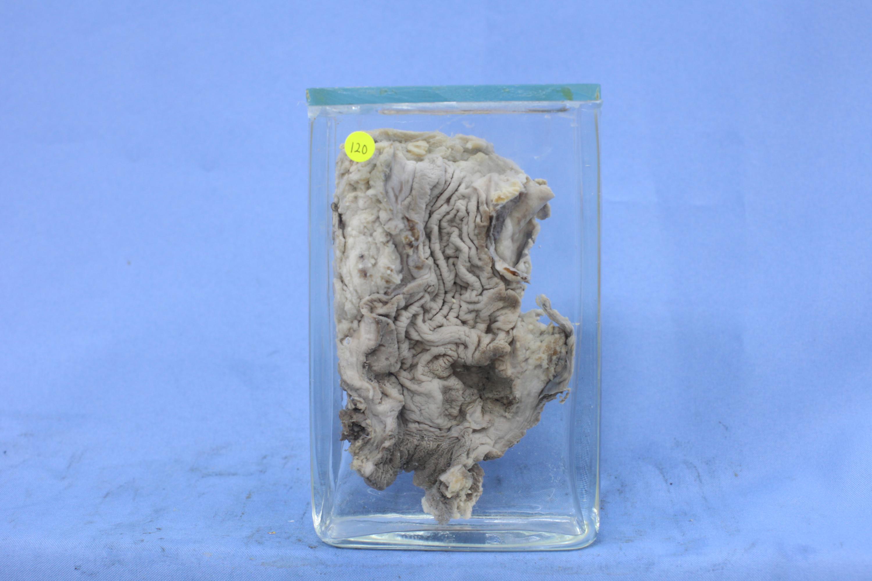 长约8厘米直肠带肛门标本。距肛门4厘米处见一个直径2.5厘米的溃疡型肿瘤,其累及1/2肠周,表面附有黑褐色物质;切面见溃疡较深,累及肌层,肿瘤与周围组织分界不清。