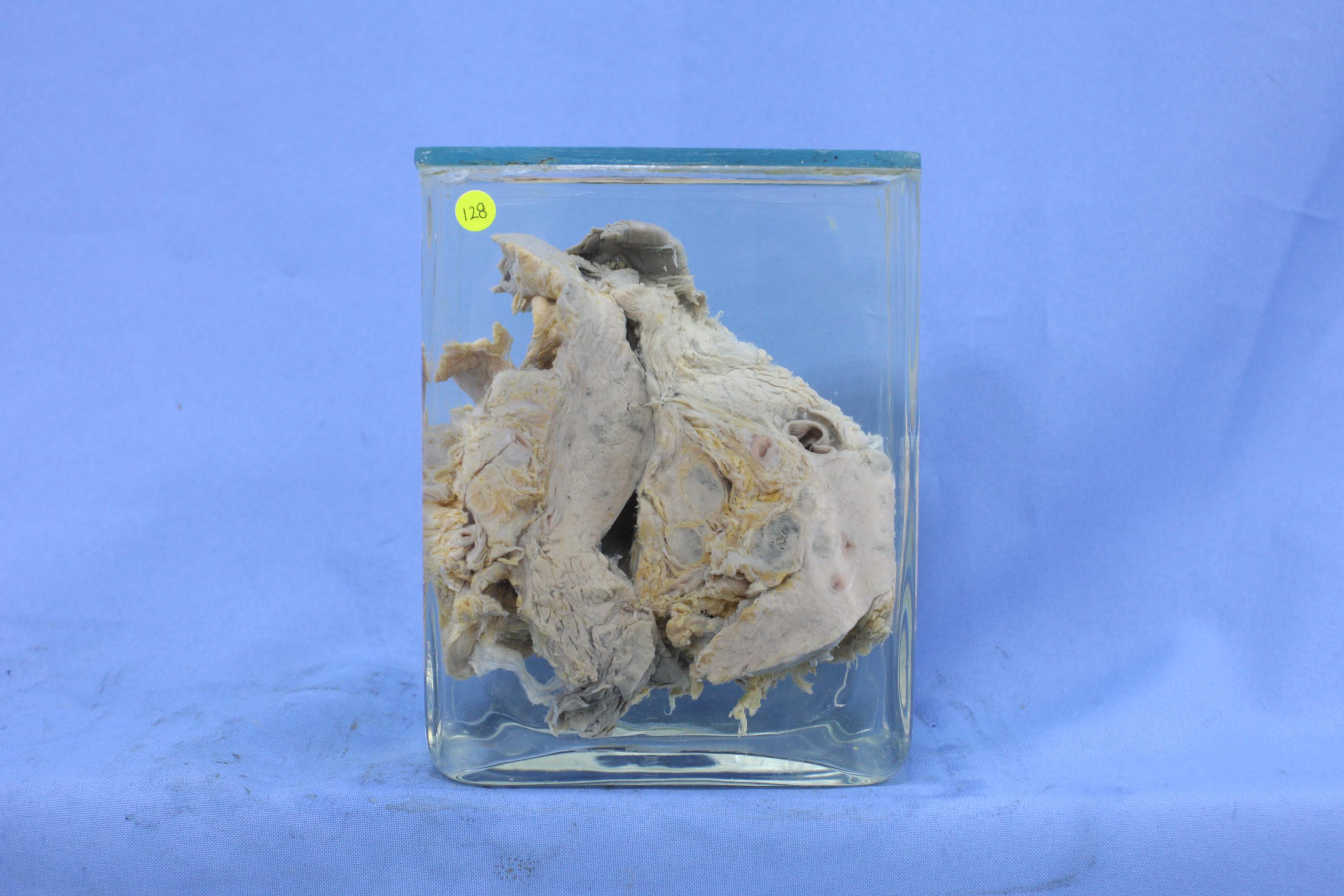 标本为约7×6×5厘米的不规则腺样组织,其胰头体积增大,有一个与周围组织分界不清、切面混有灰褐色区的肿瘤呈浸润性生长。