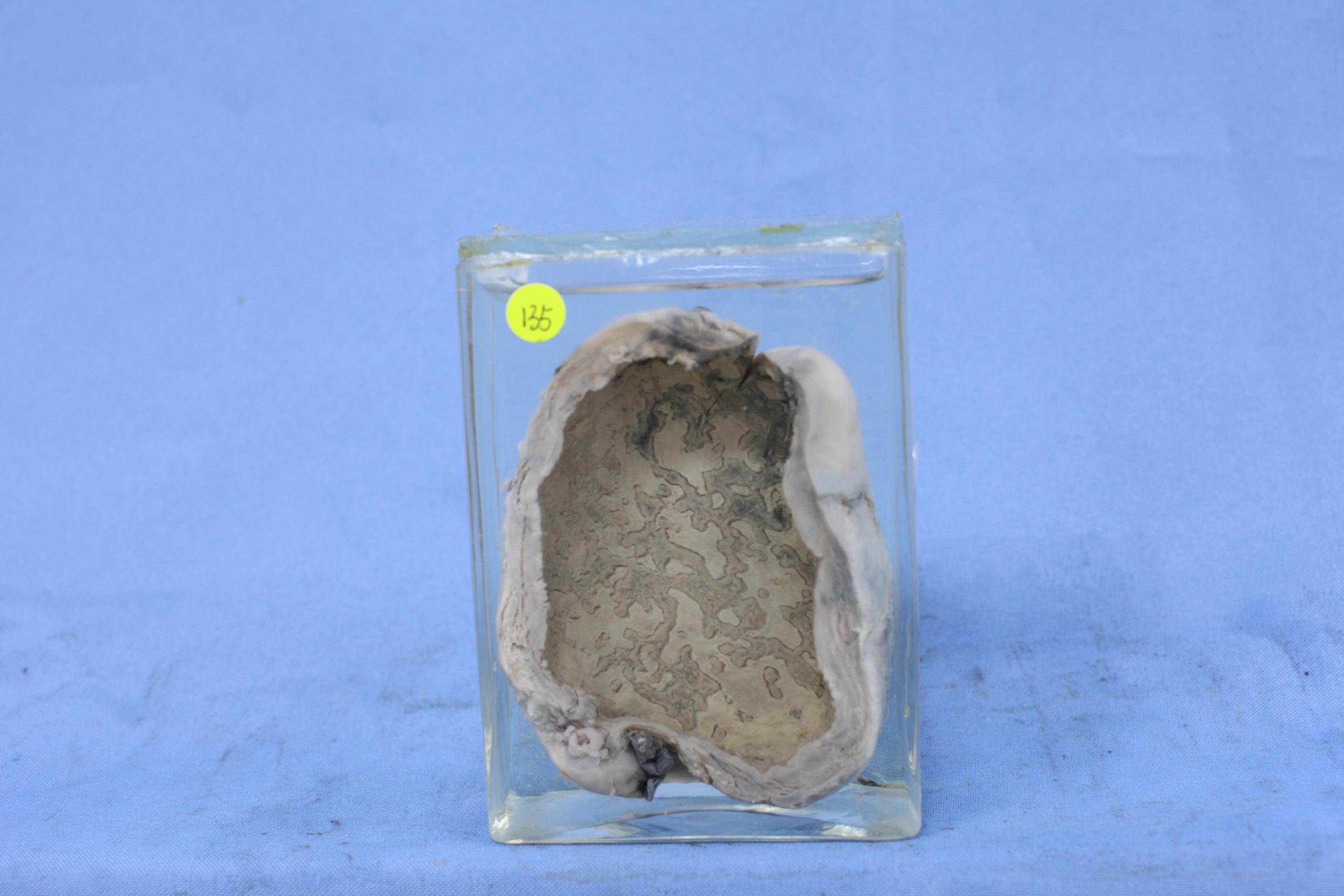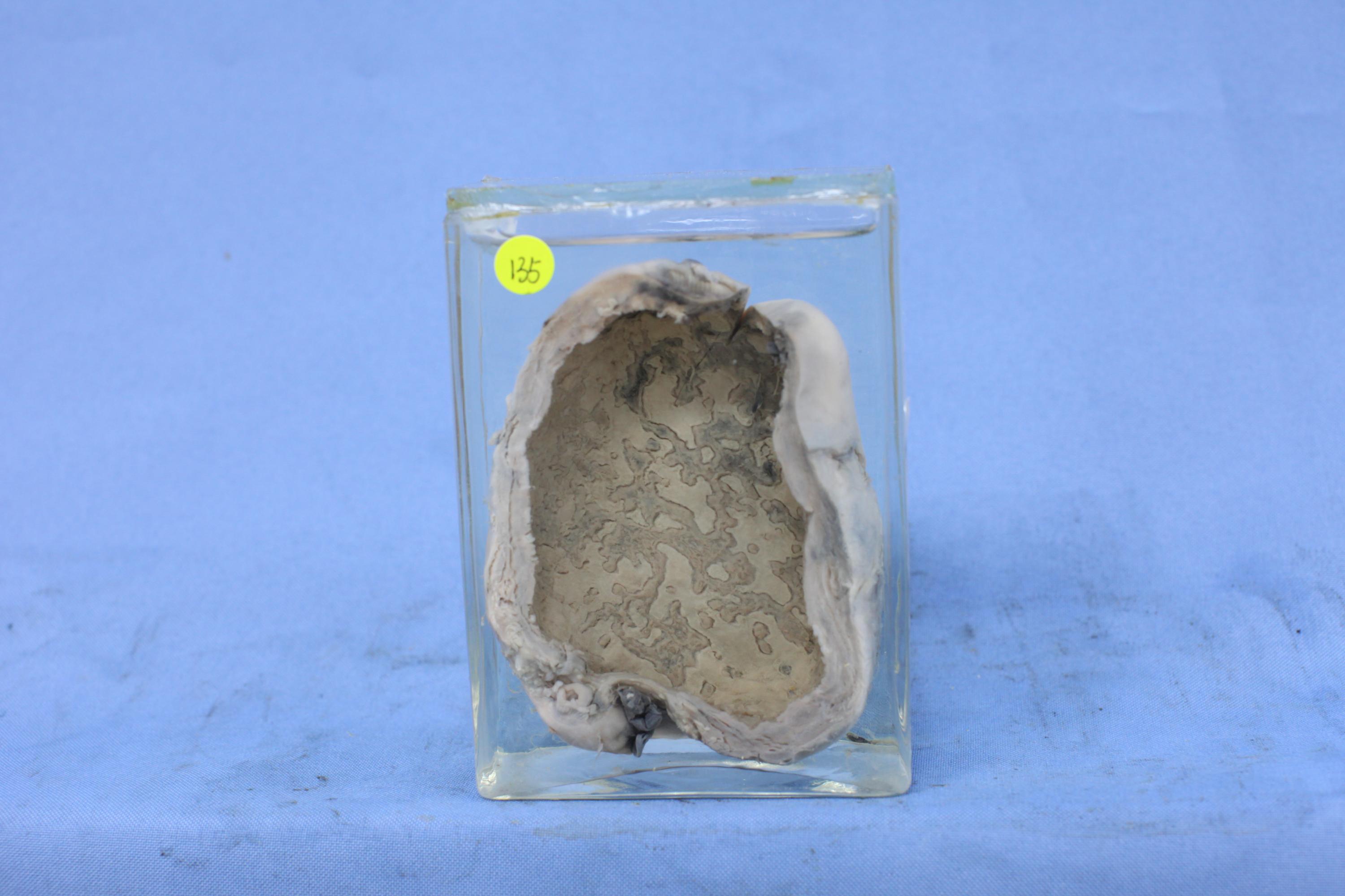 剖开胆囊标本,8×5厘米,胆囊壁厚0.7厘米,粘膜呈花纹样脱落,局部有小灶出血。