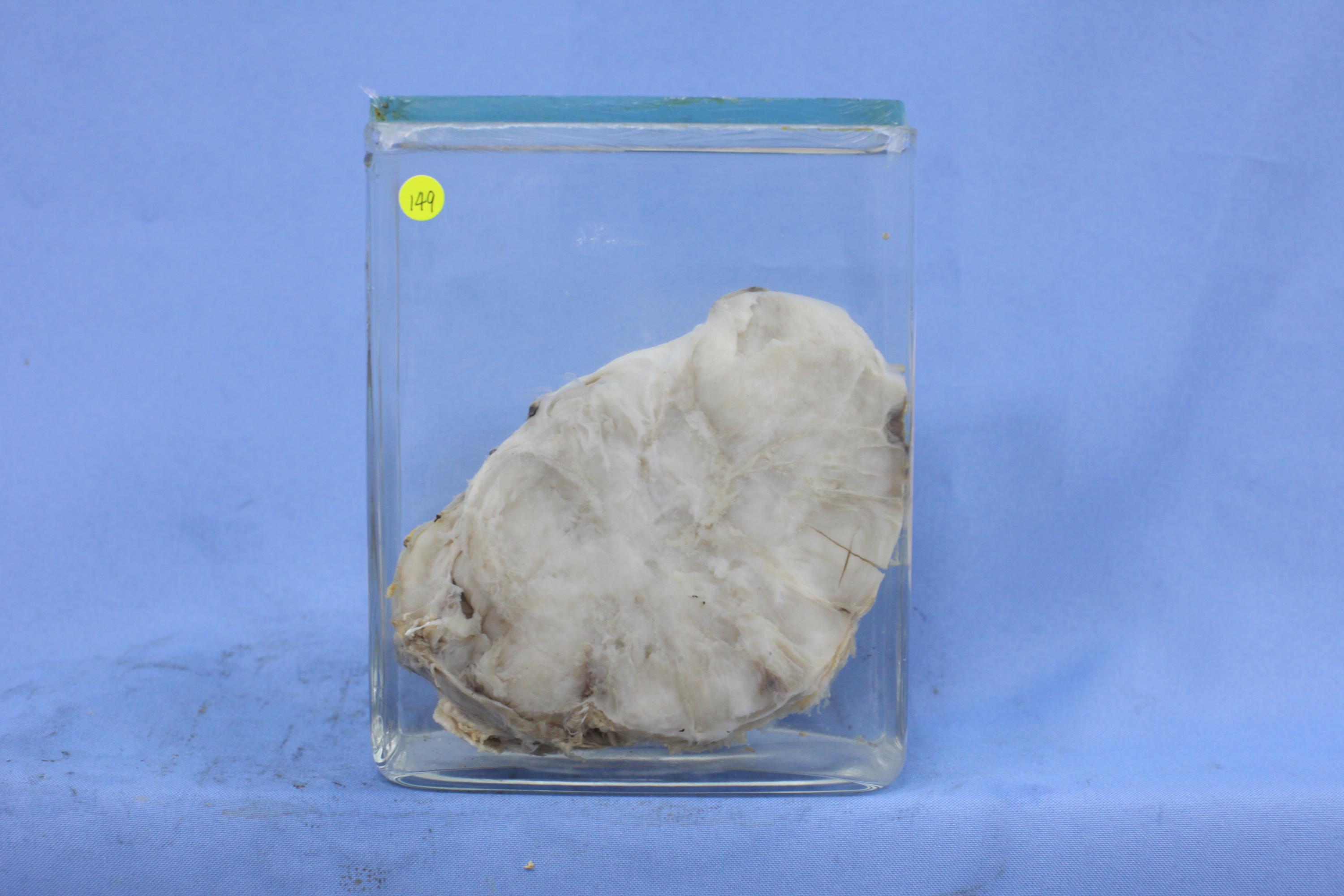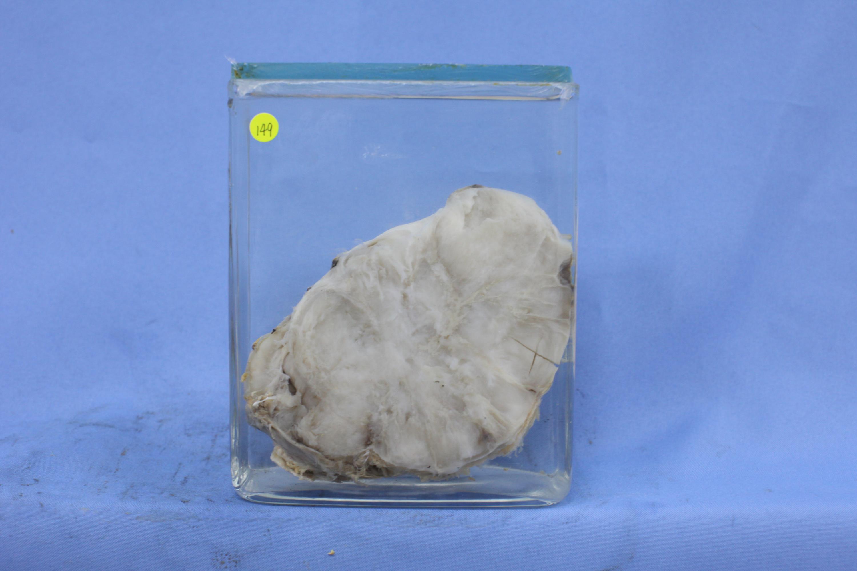 切开半球形肿块7×5×3厘米,外周有包膜,切面呈灰白色,透明状。