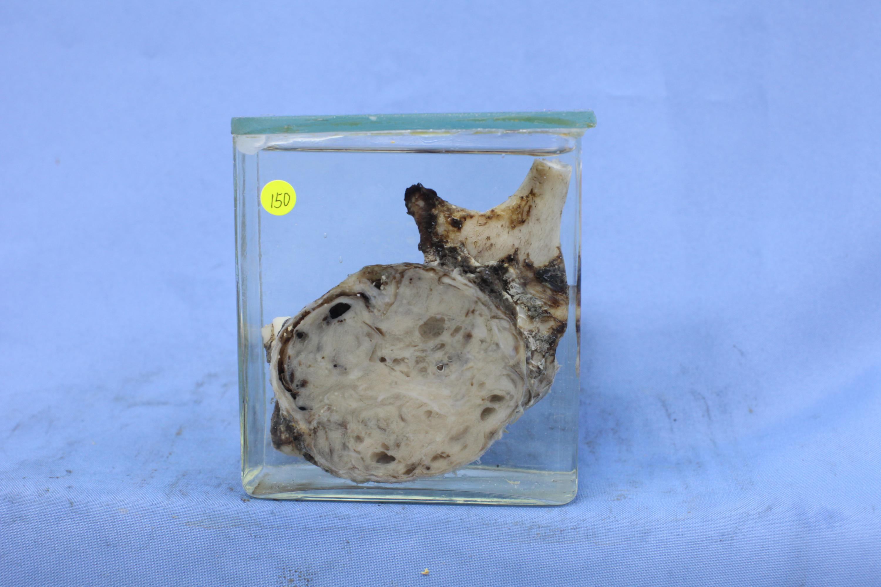 部分下颌骨标本,下颌骨的一侧见一个直径约7厘米的球形肿瘤,其界限较清,切面呈灰白色,散在分布着大小不等的囊腔及小出血灶。