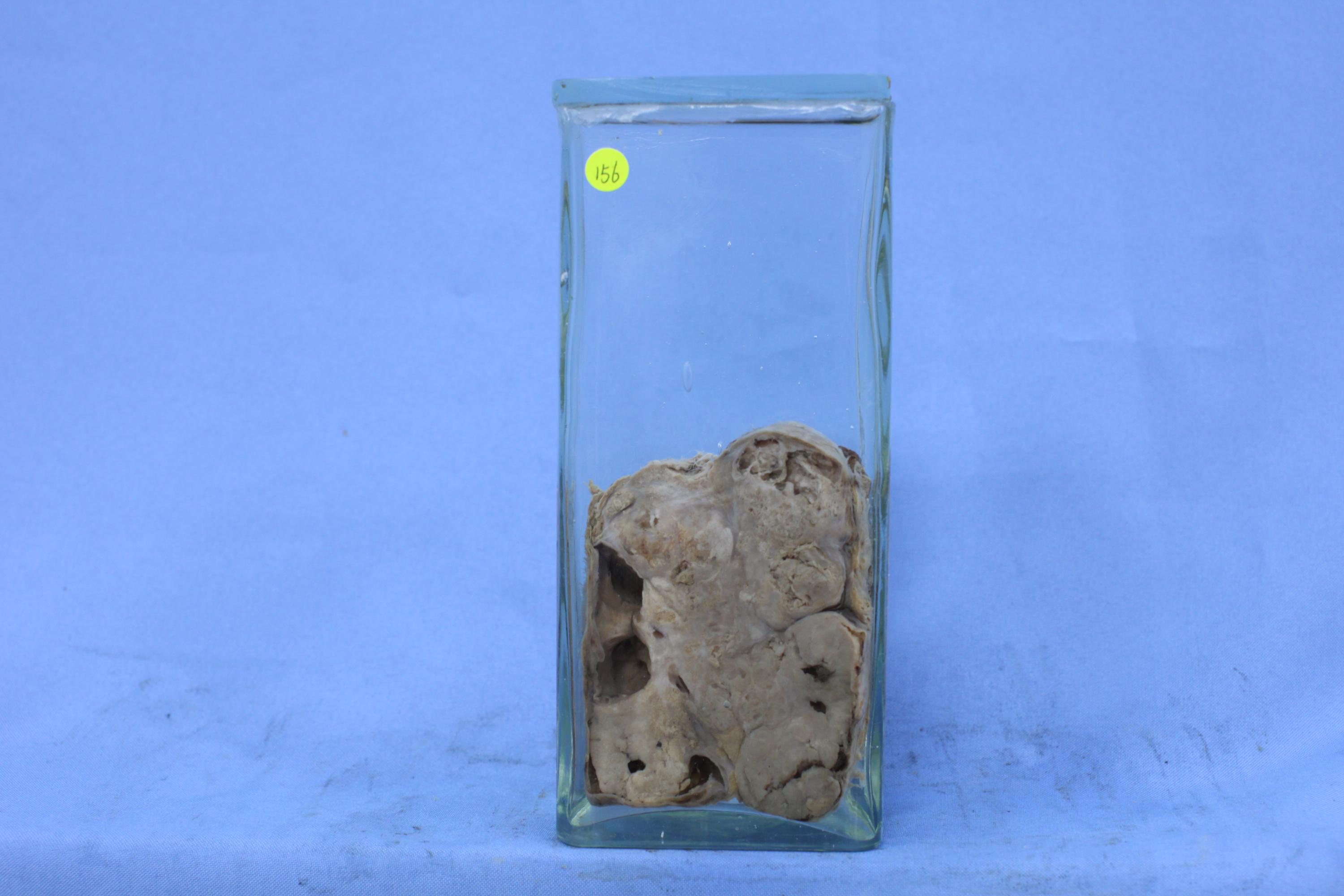 已切开形状不规则腺组织,其中见约5×4×3厘米的界限不清肿块,其切面呈灰褐色,被 结缔组织分隔成多个囊腔,左上见软骨样结构区,右上组织结构比较疏松。
