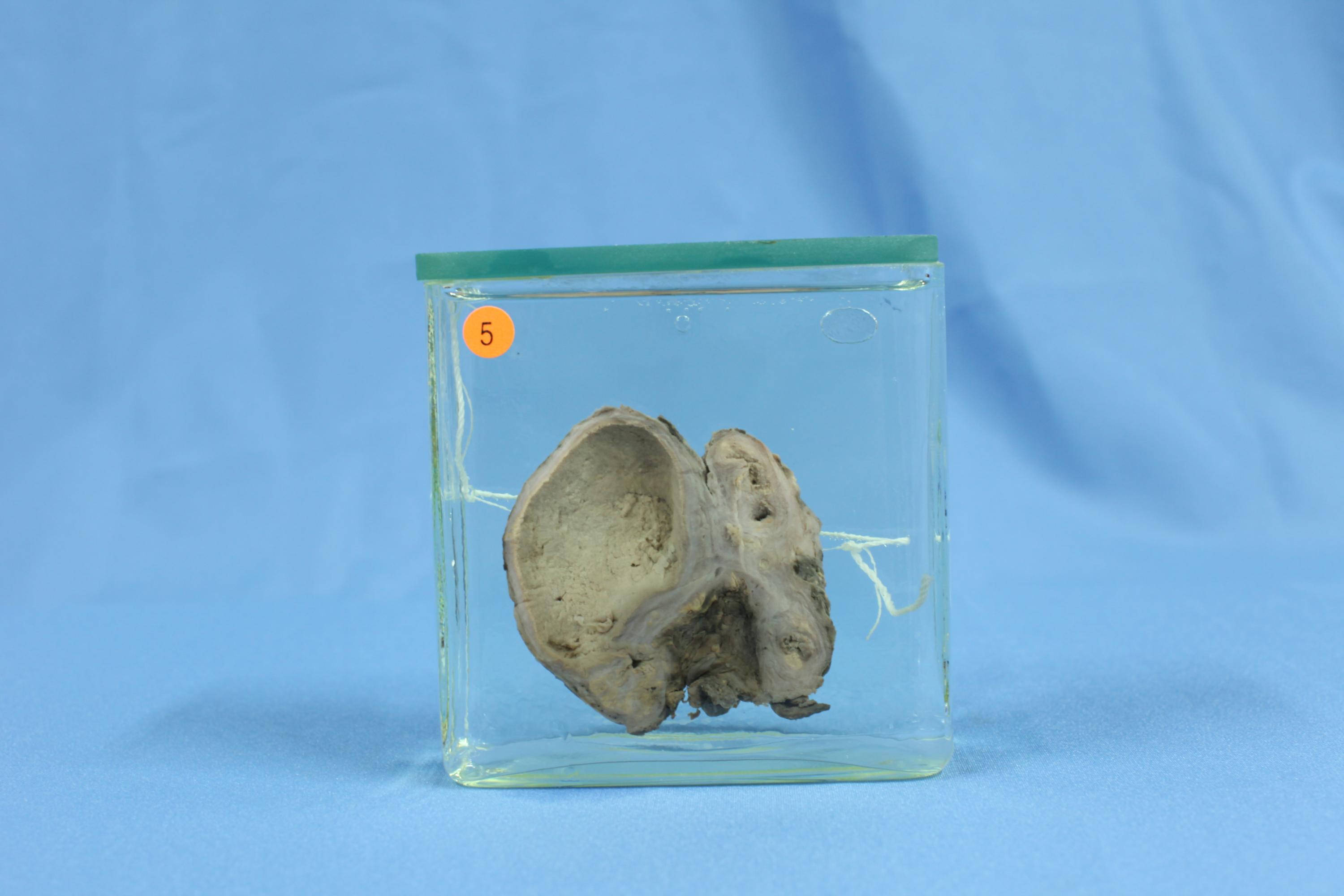 卵巢呈肿块性增大,四周粘连极多。脓肿的表面(标本背面)微紫红色或附有土黄色的坏死组织。脓肿腔内见絮状及细颗粒状坏死组织。脓肿壁较厚,约0.8cm。