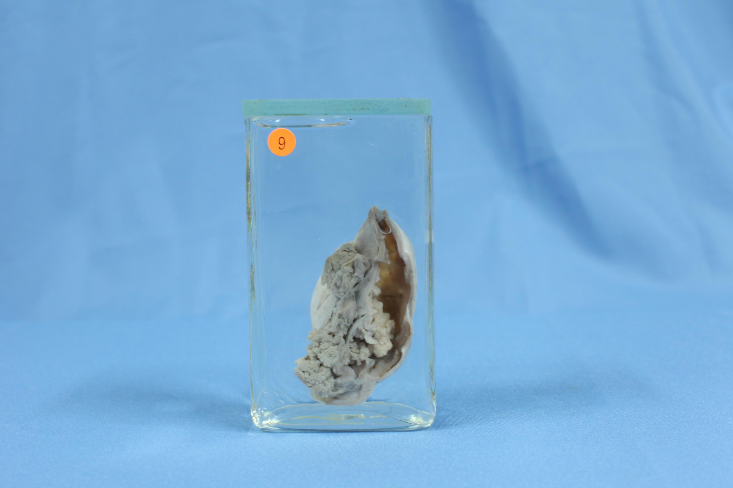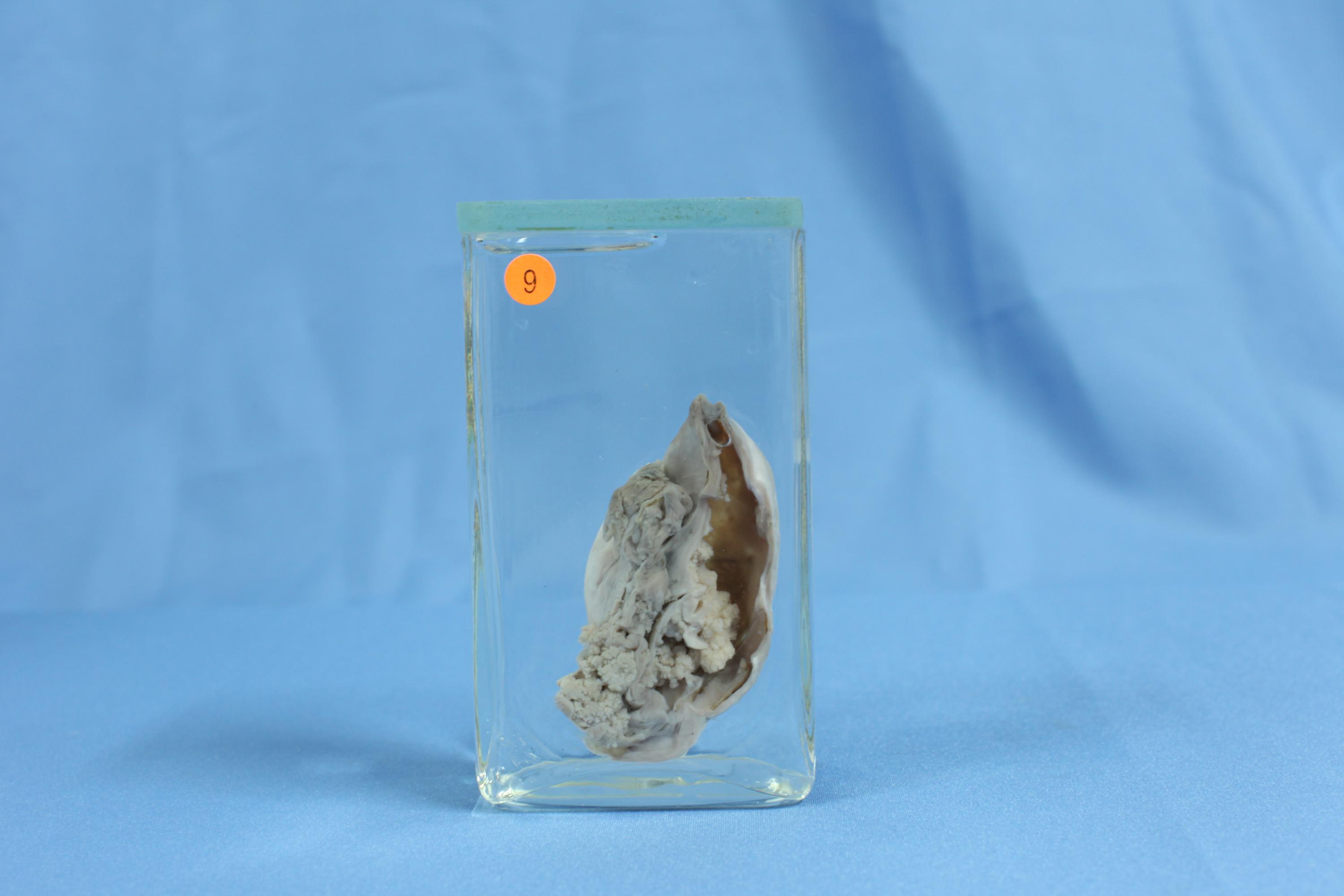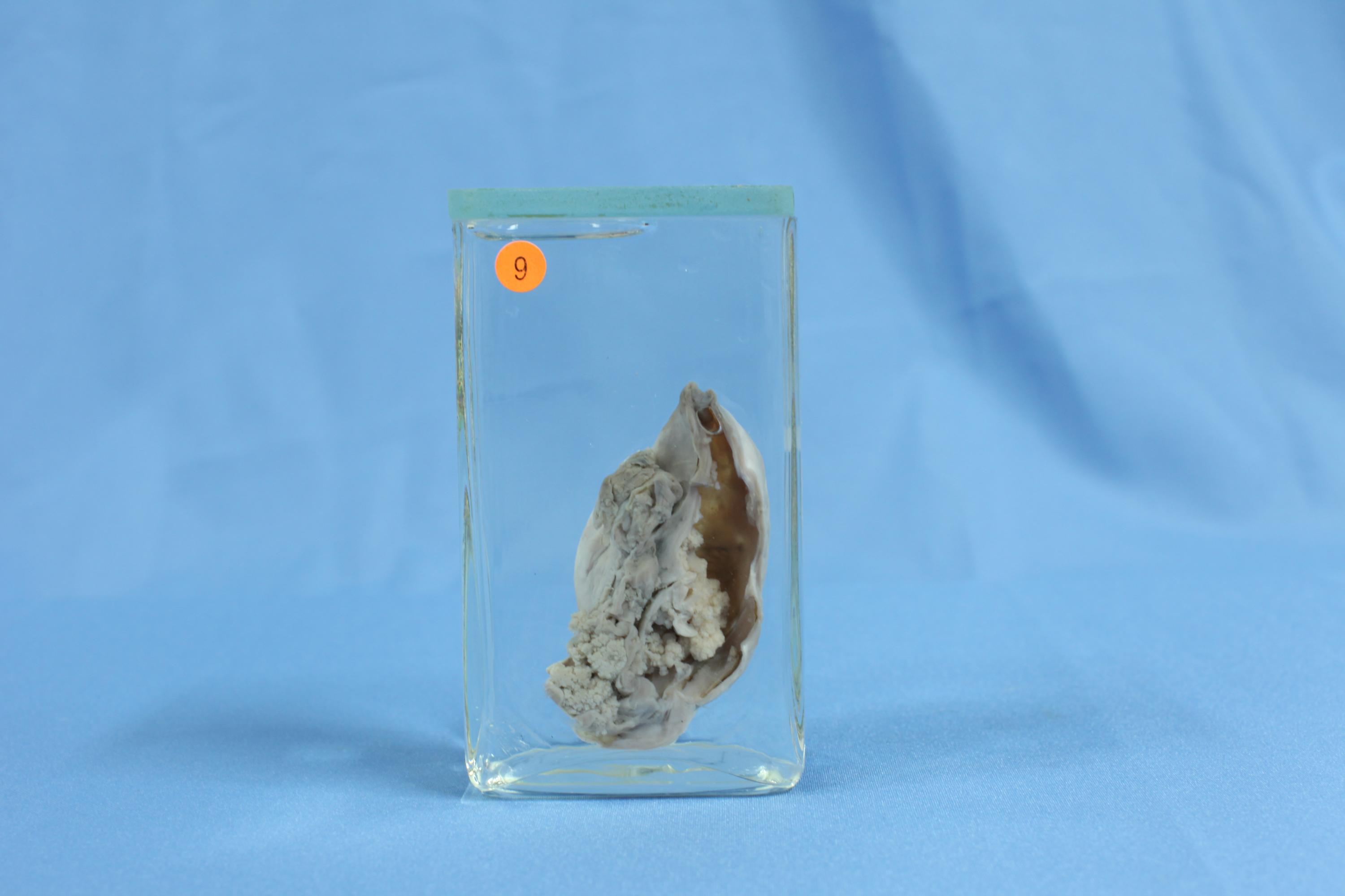 肿瘤为一多房性囊腺瘤,表面(标本背面)呈结节状。包膜略厚,呈灰白色、光滑。切面见囊腔由纤维组织分割为两房。新鲜标本房内充满清色液体。房内可见乳头生长,乳头分散在多房内,成外生性。乳头形态多样,有的乳头细小、平坦,质地坚硬,或呈片状生长如疣状突起,或短粗状分支,但基地较宽大,不脆。这种事良性乳头的特征。