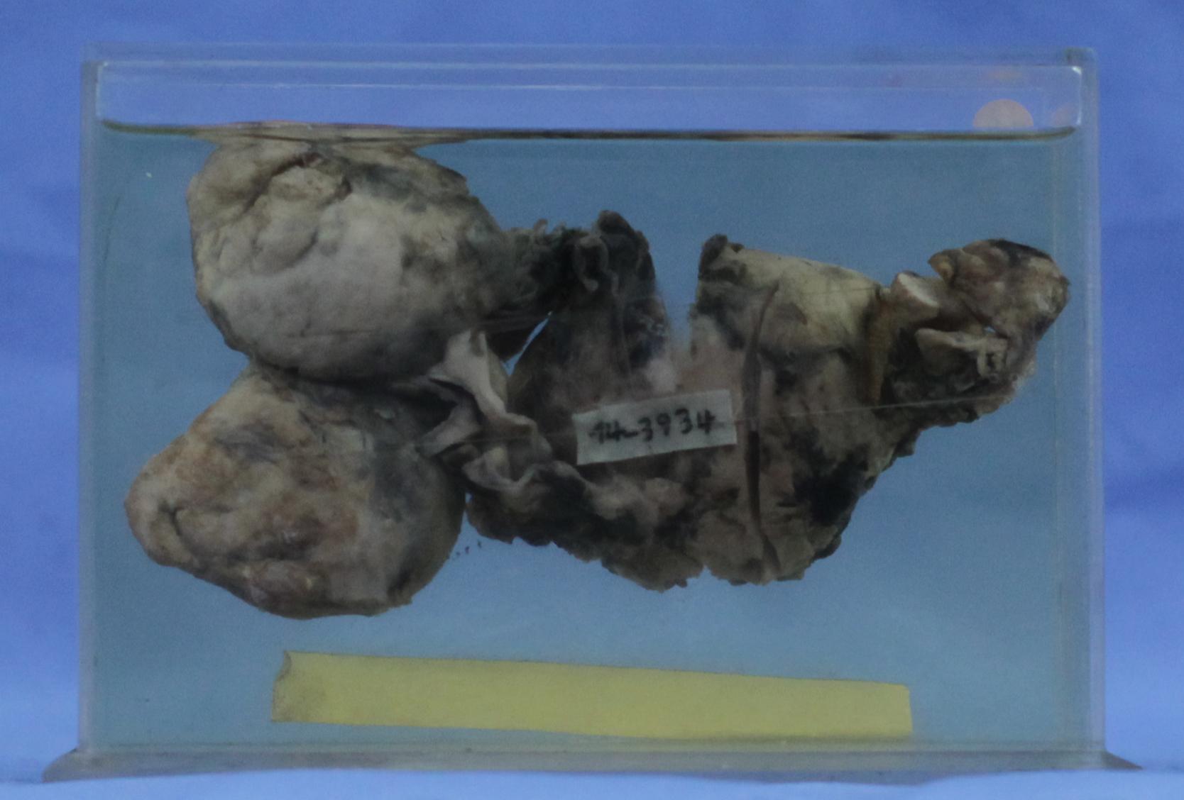 中央为一切开子宫,肿瘤位于一侧卵巢上,呈圆形,表面光滑结节状,质地较软,直径约6cm,代替了整个卵巢结构。切面见肿瘤为实质性,呈黄色。