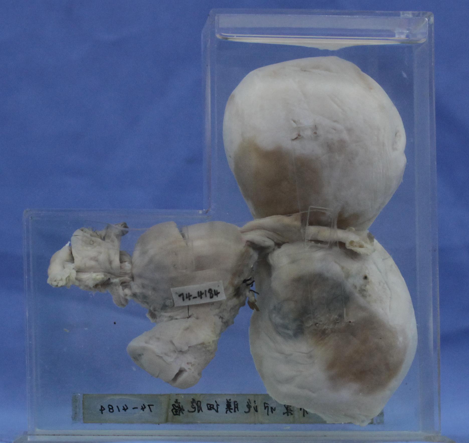 中央为切开子宫,子宫一侧卵巢上见一切开卵圆形肿瘤,直径9cm,质实。肿瘤表面(标本背面)隆起,呈浅表分叶状,灰白色,被覆有光泽而薄的包膜。切面一片灰白,如同白心甜薯的切面。