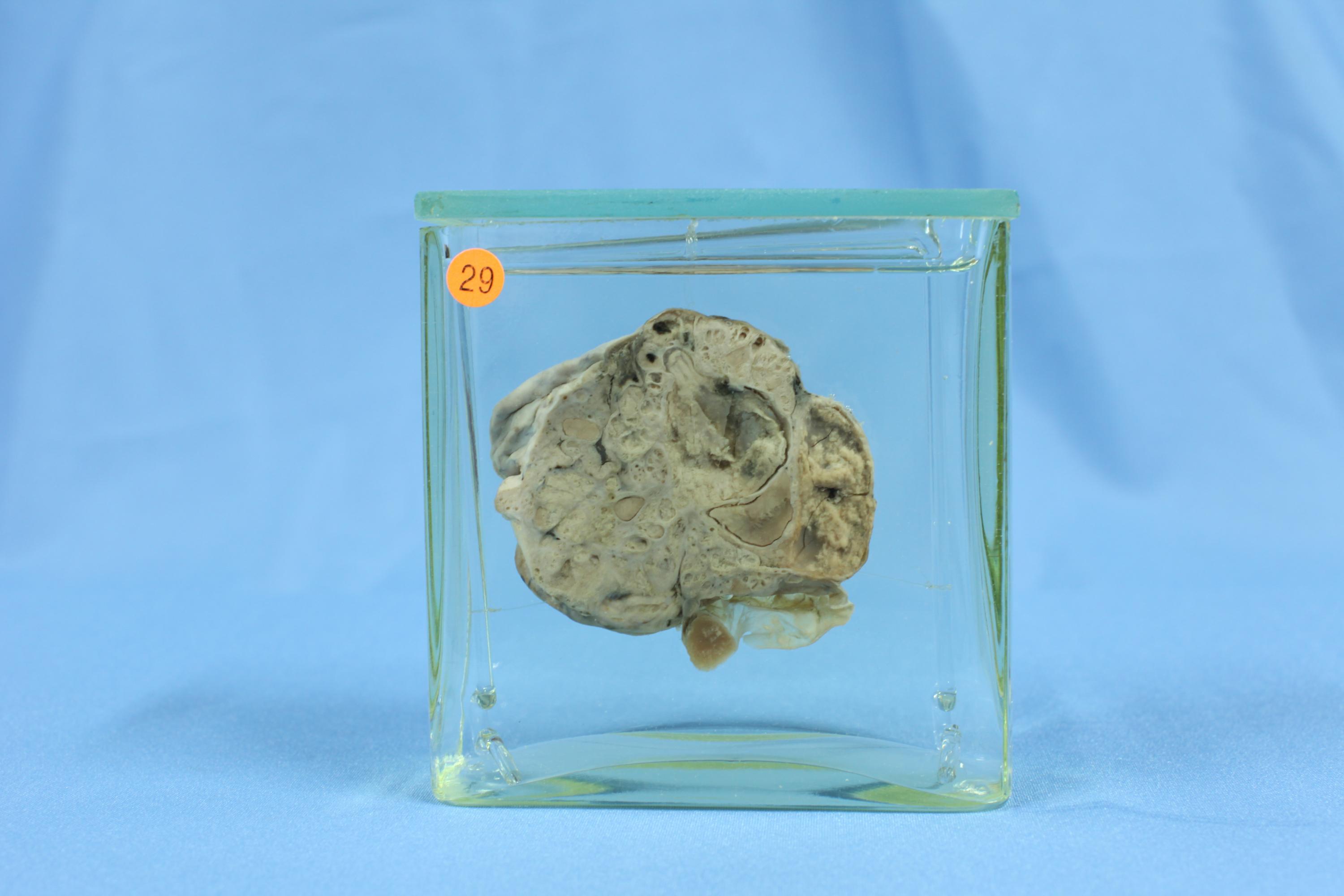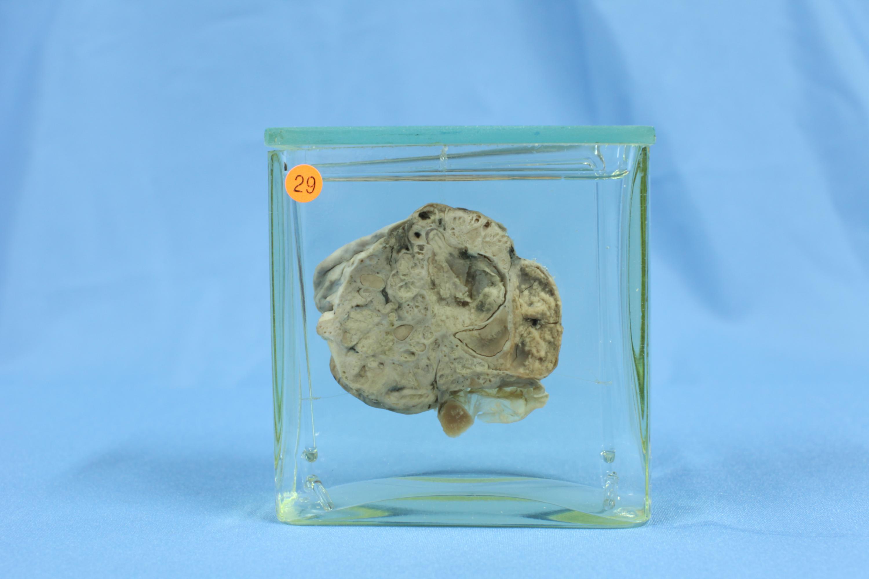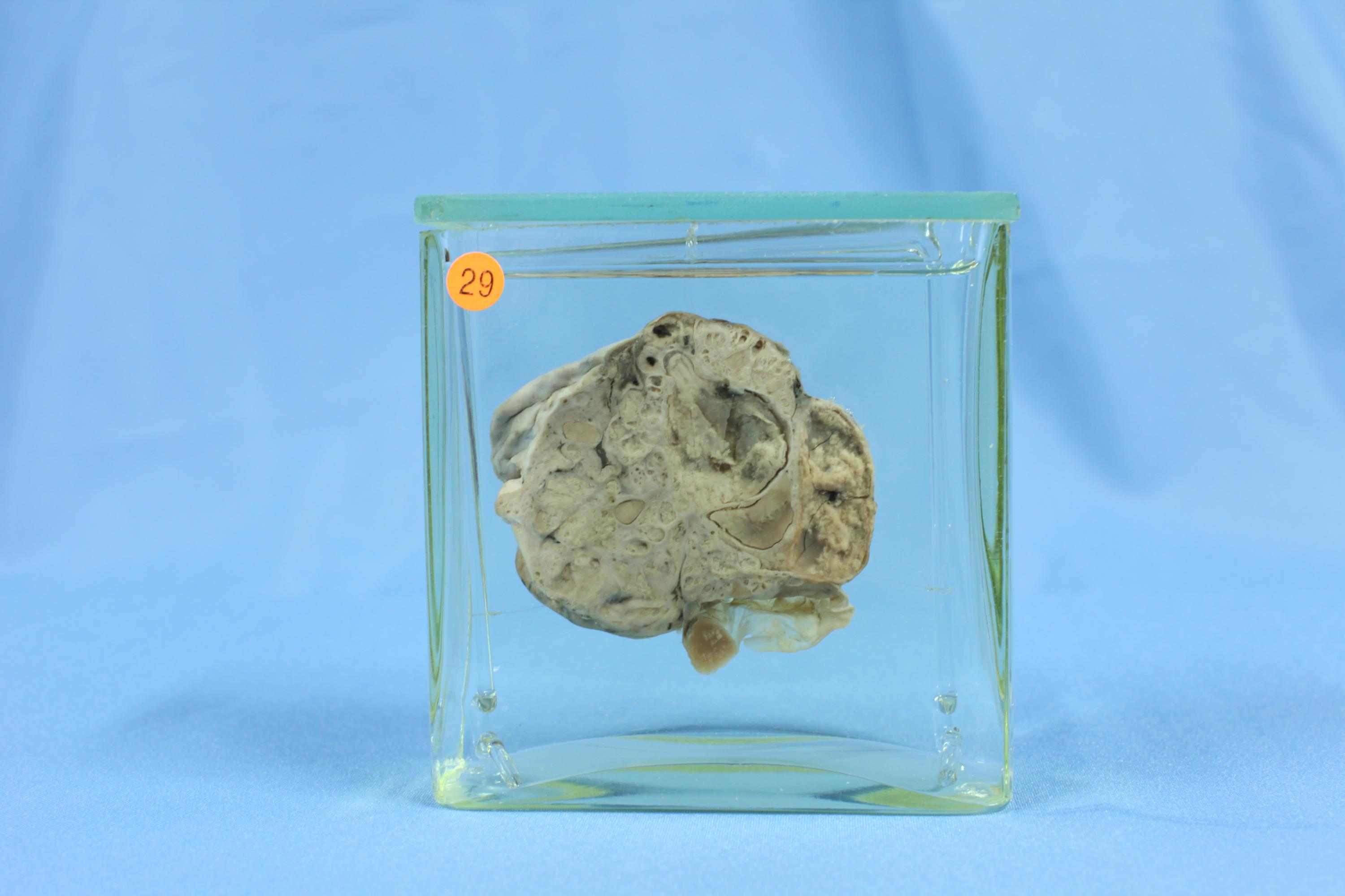 肿瘤侵犯卵巢,直径 6cm,灰黄色,表面(标本背面)呈结节状隆起。切面见肿瘤质实,可见透亮胶冻样物分散在实质组织中,局部组织出血坏死。