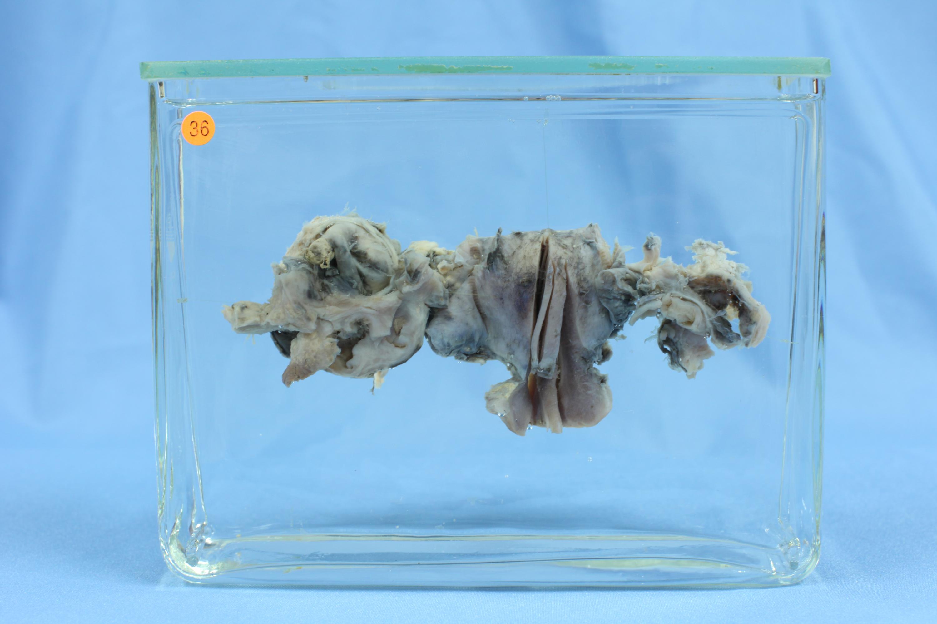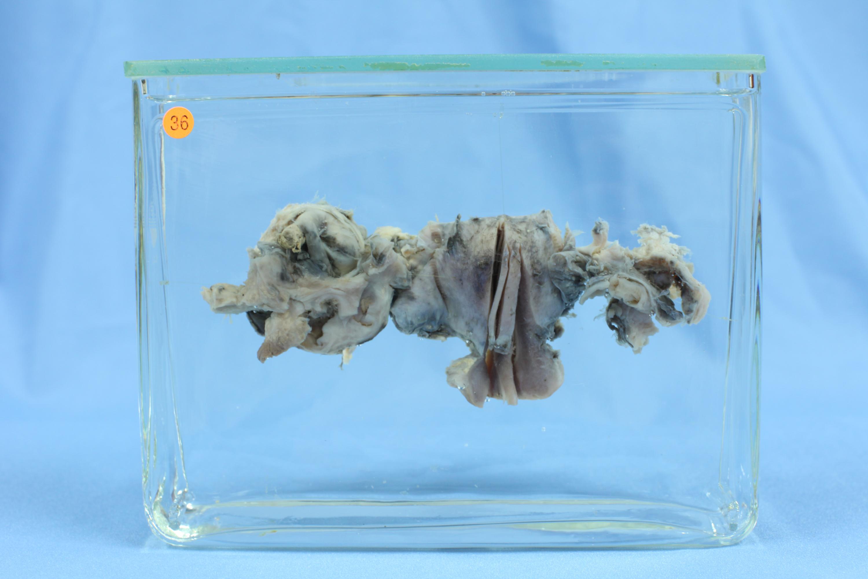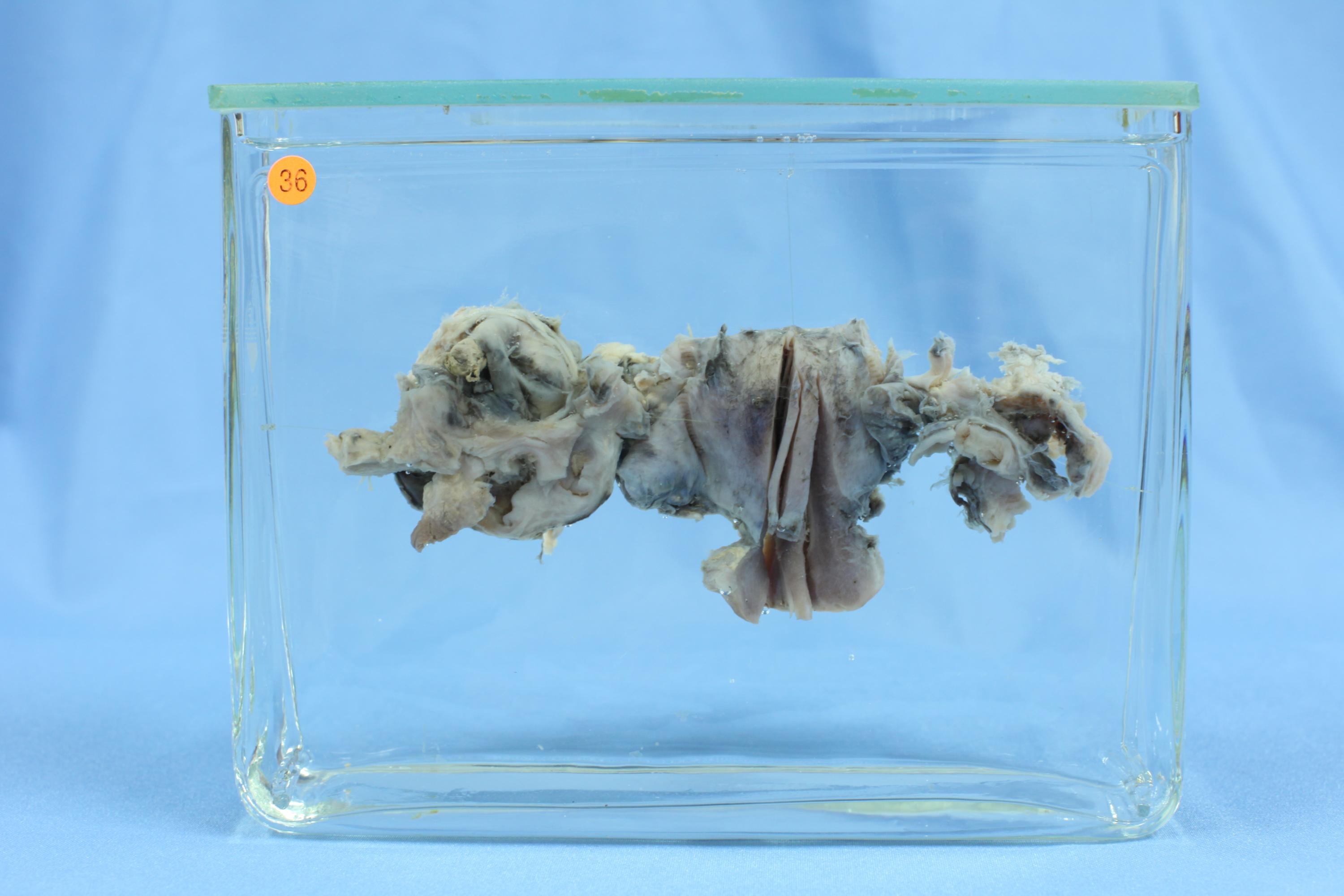中央为切开子宫,肿瘤位于一侧输卵管壶腹部,卵圆形,质韧,灰黑色,直径4cm。