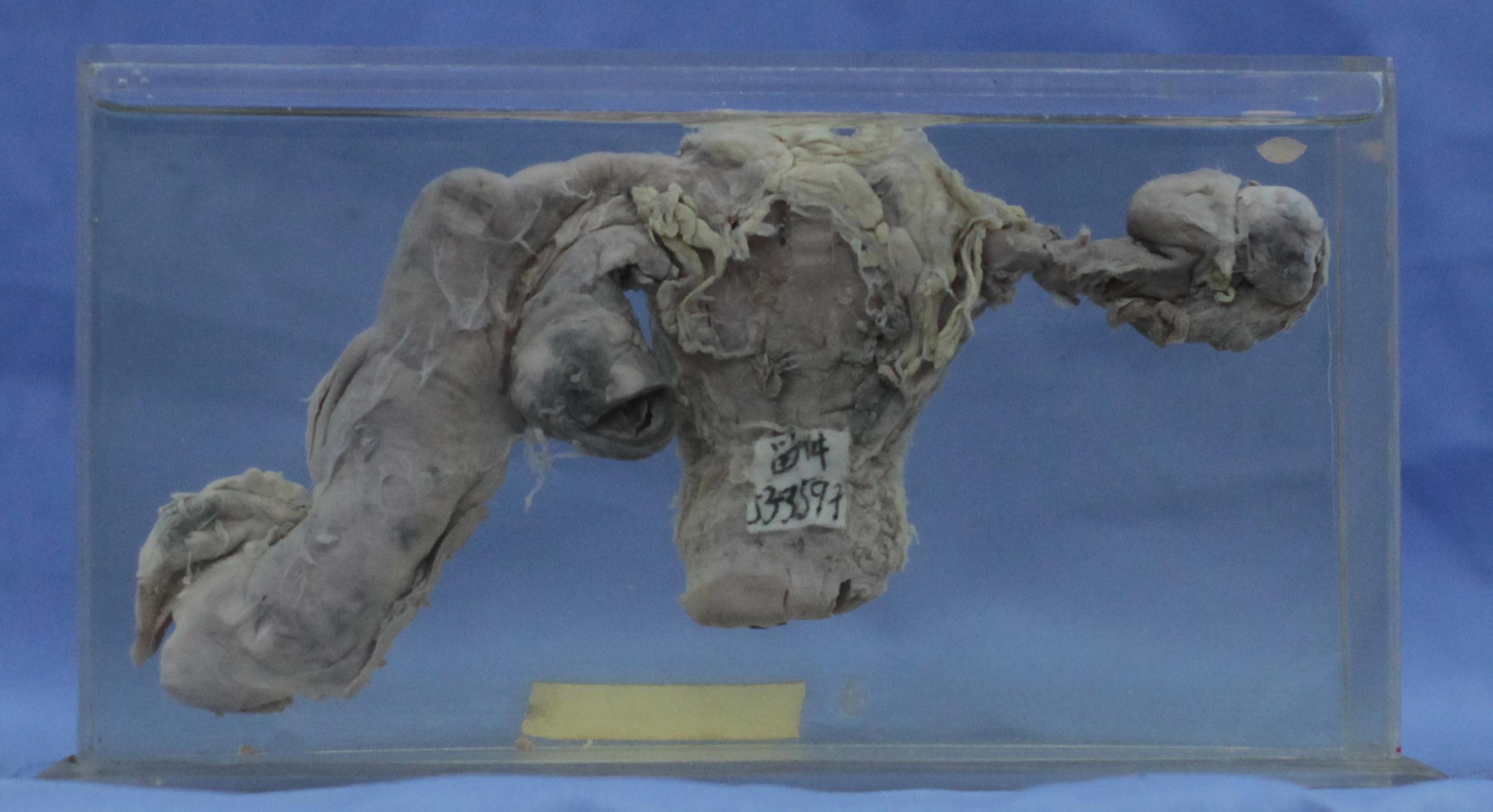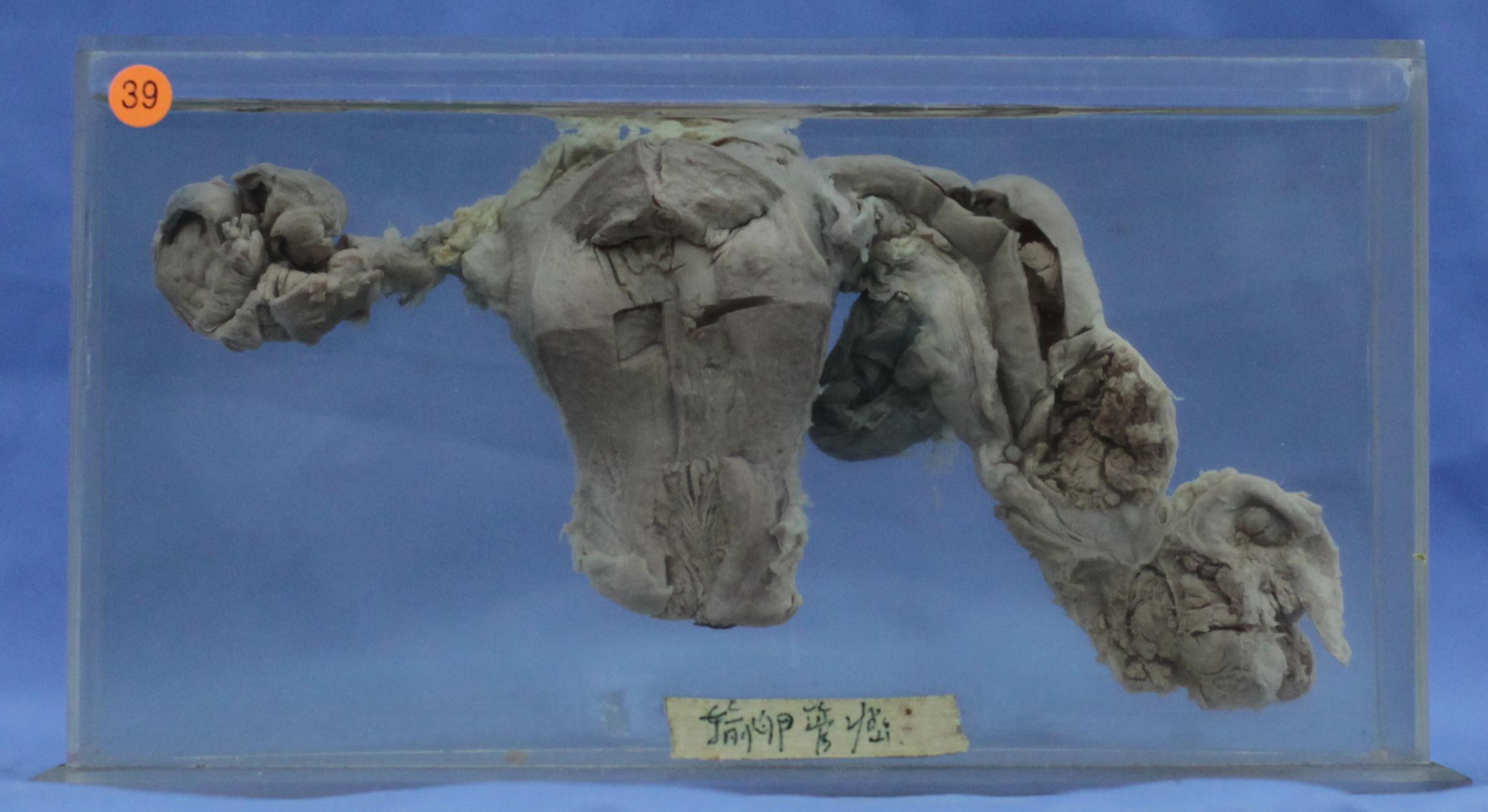中央为切开子宫,肿瘤位于左侧输卵管壶腹部,伞部开放。腔内充满菜花状肿瘤组织,突出于伞端开口。肿瘤组织质脆,易脱落。