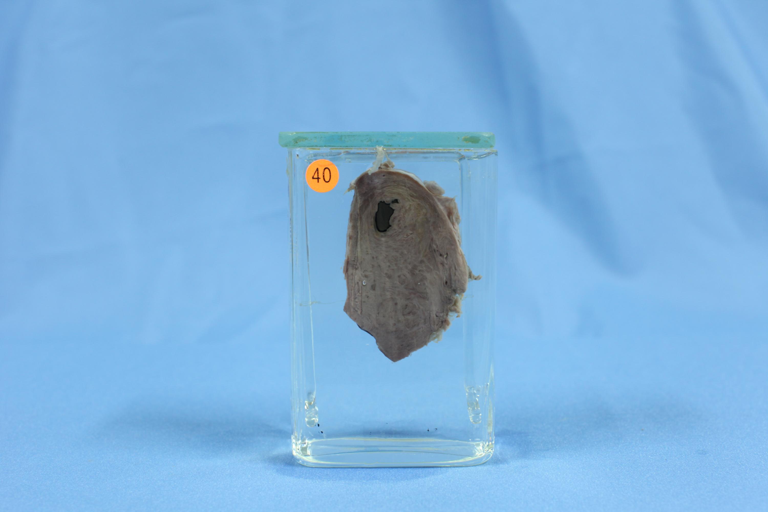 标本为一段子宫肌壁,切面中央见一棕色不规则区域,大小1X0.5cm,与周围肌壁组织界限清晰。