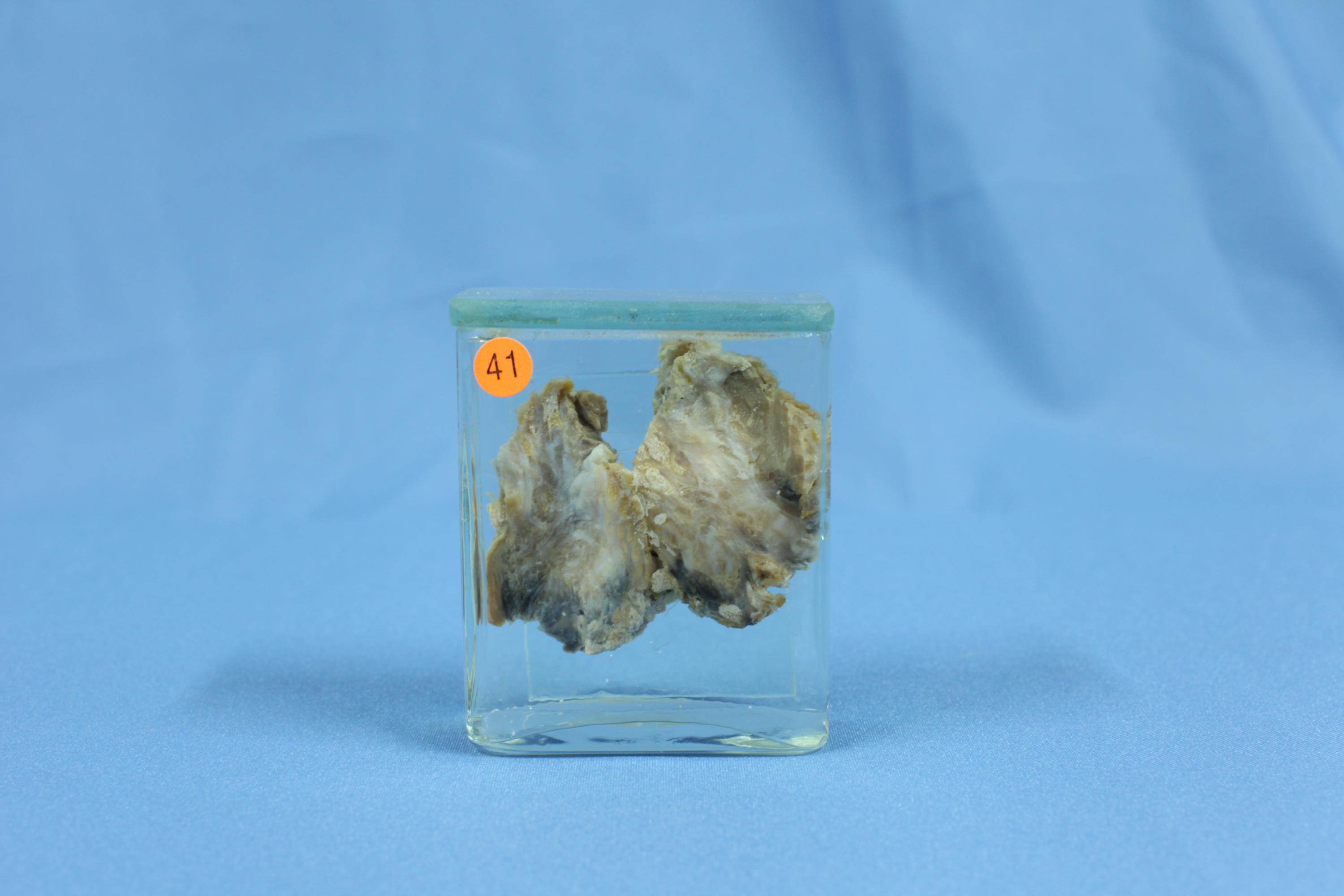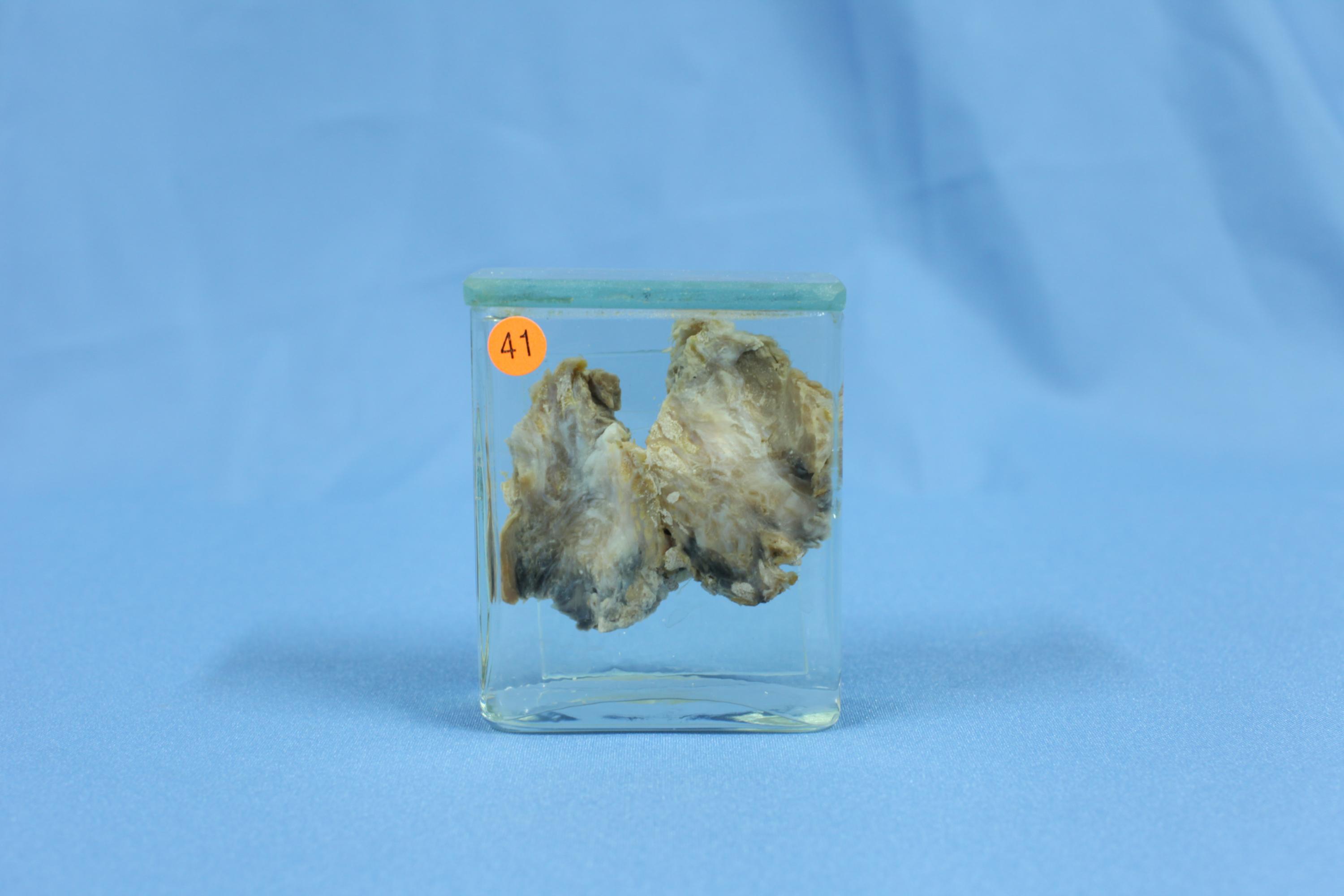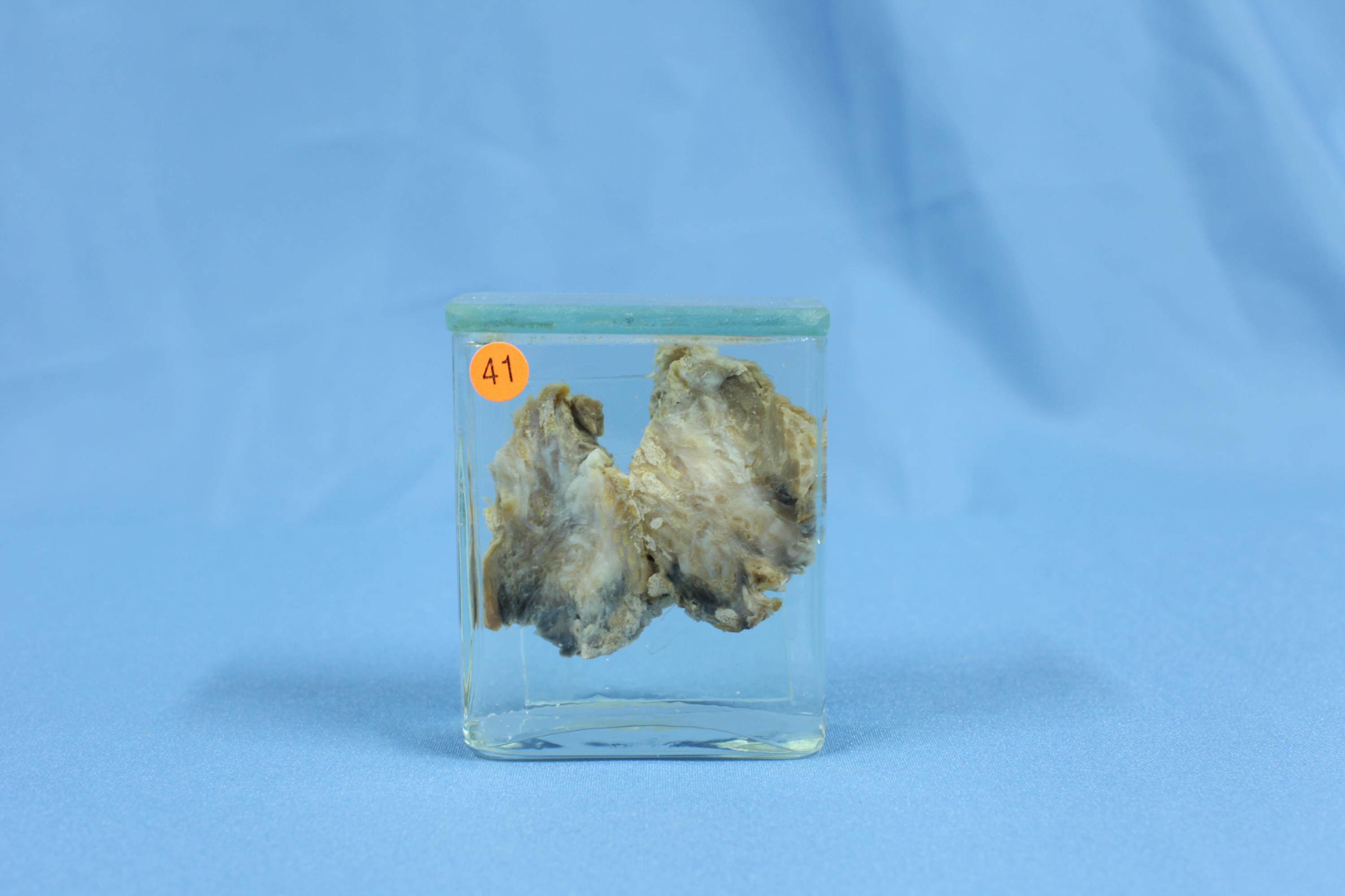 标本为一段腹壁组织,切面周围见棕色不规则区域,大小5X1cm,与周围肌壁组织界限清晰。