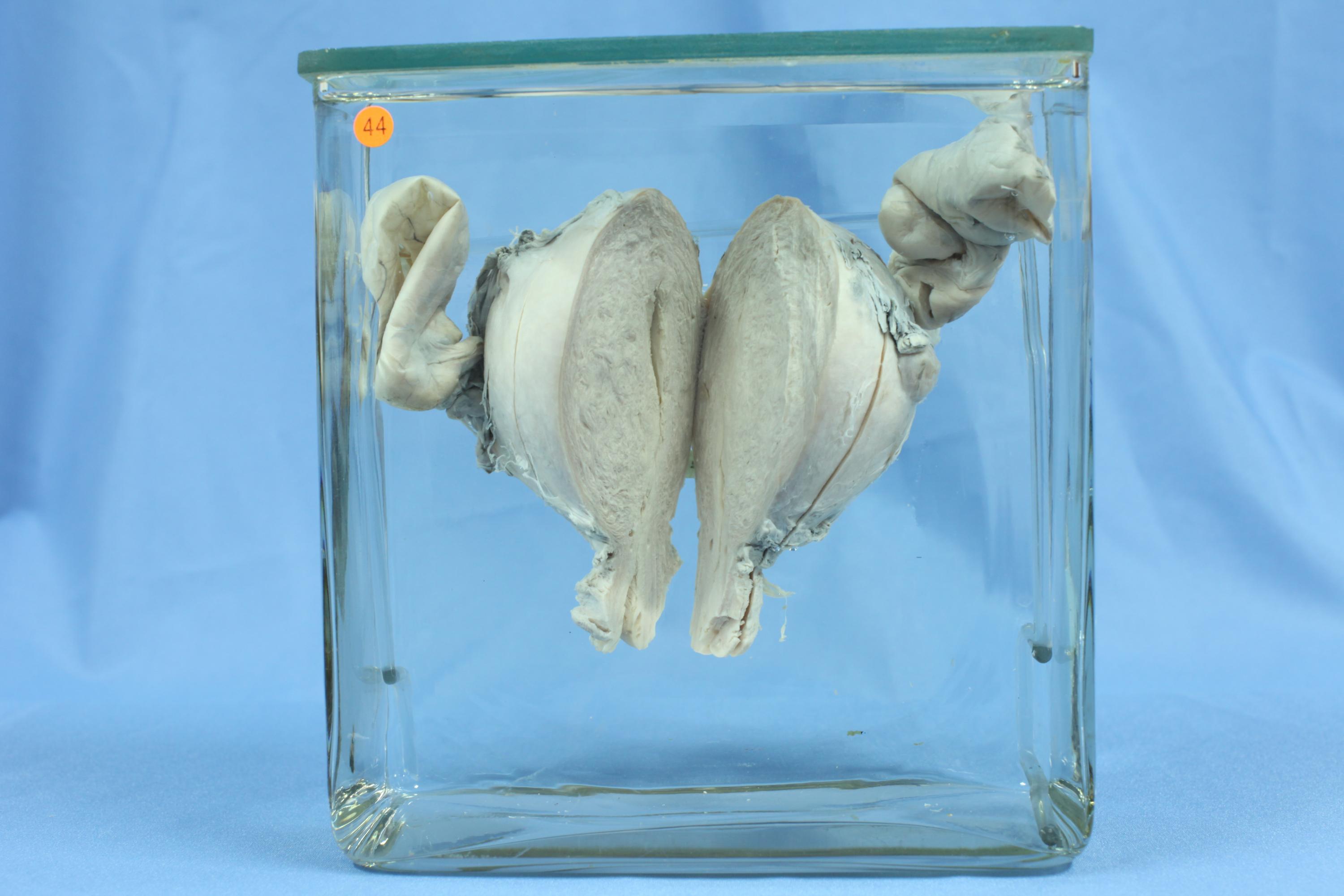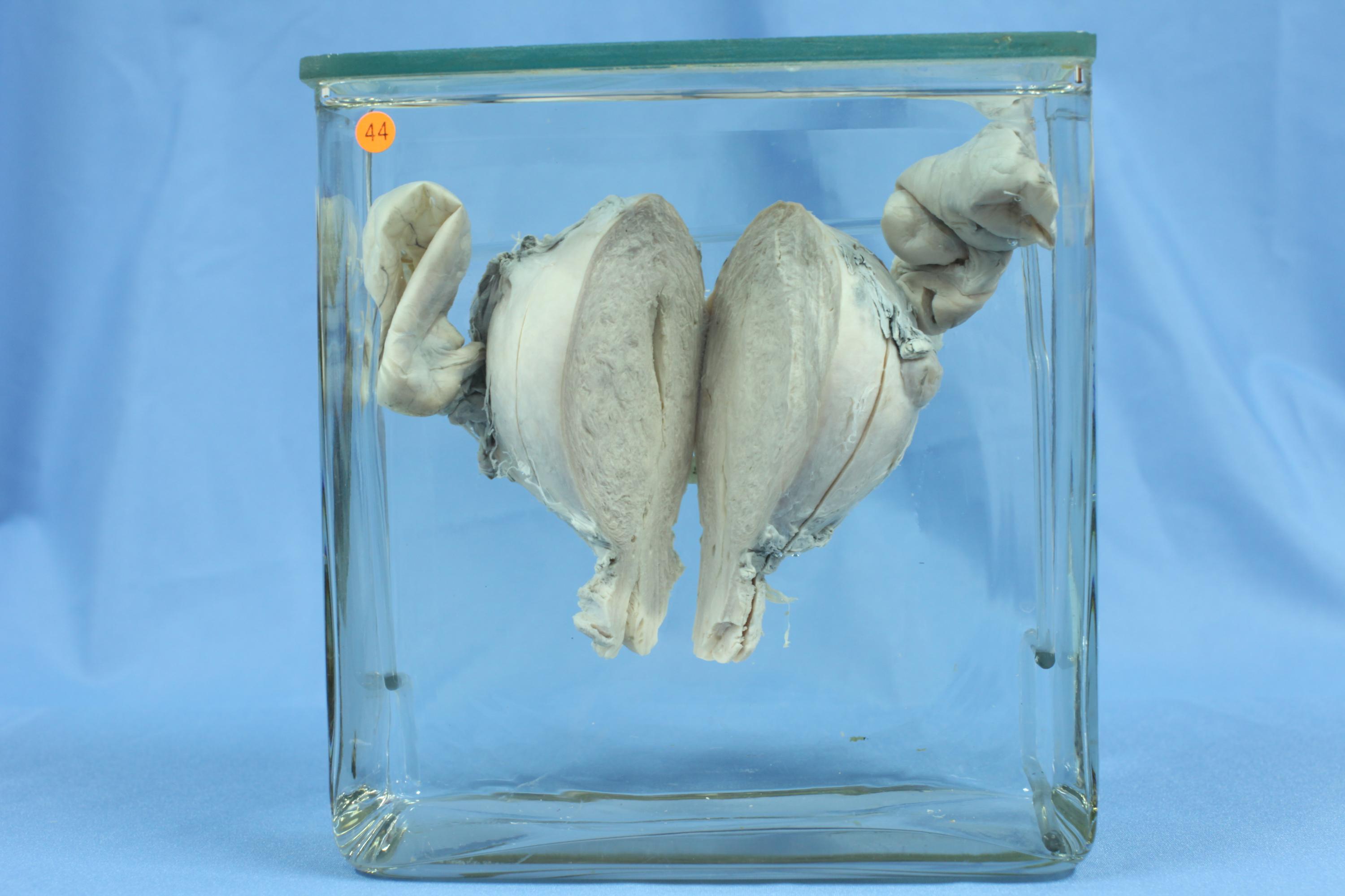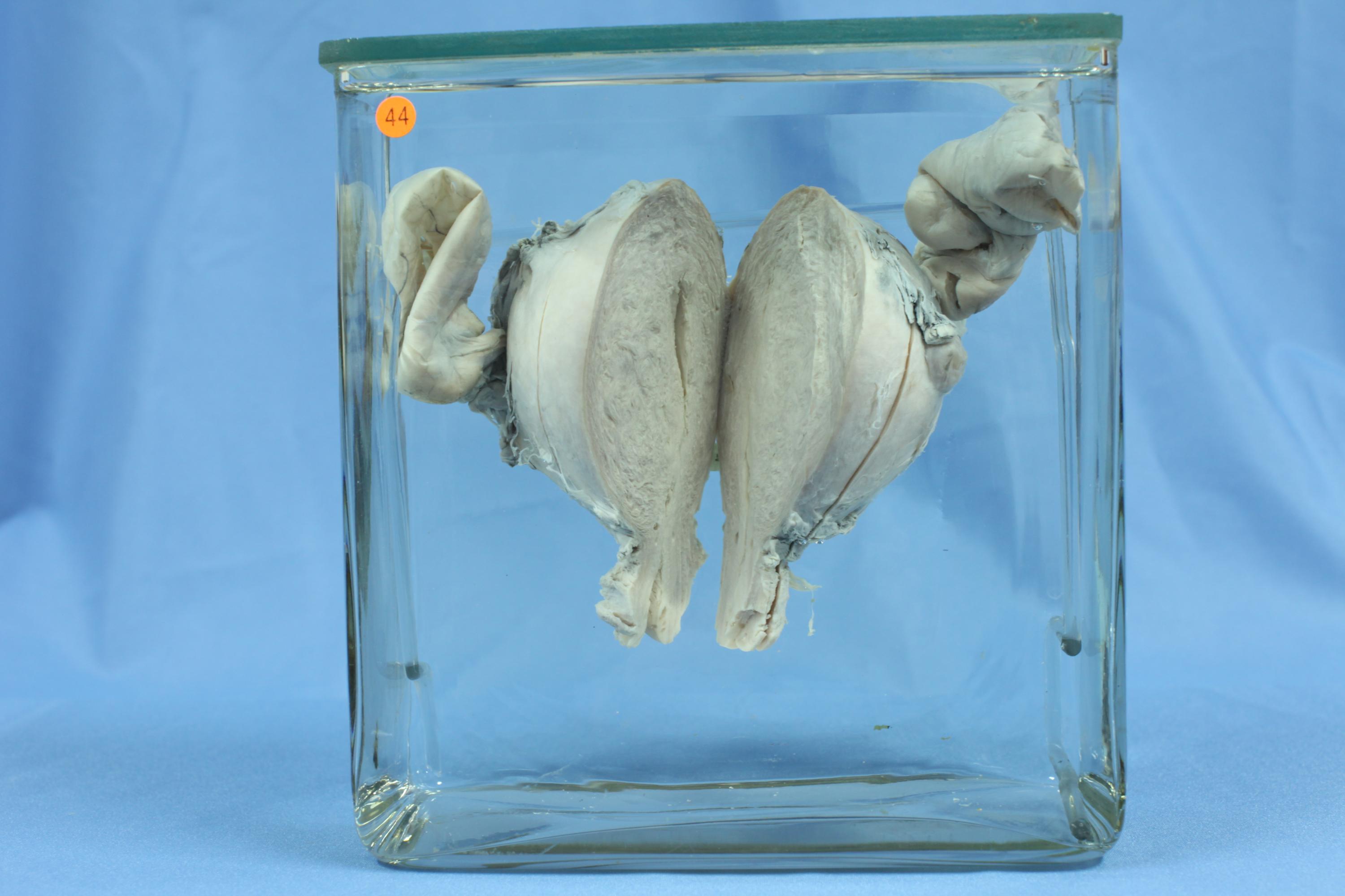 中央为切开子宫,子宫肌壁最厚处约3cm。肌壁内呈漩涡状。输卵管伞端封闭,输卵管壶腹部及漏斗部囊样扩大,输卵管壁变薄透亮,新鲜标本内含浆液样液体。子宫内膜异位症常引起泌尿道阻塞,形成输尿管积水及肾盂积水。