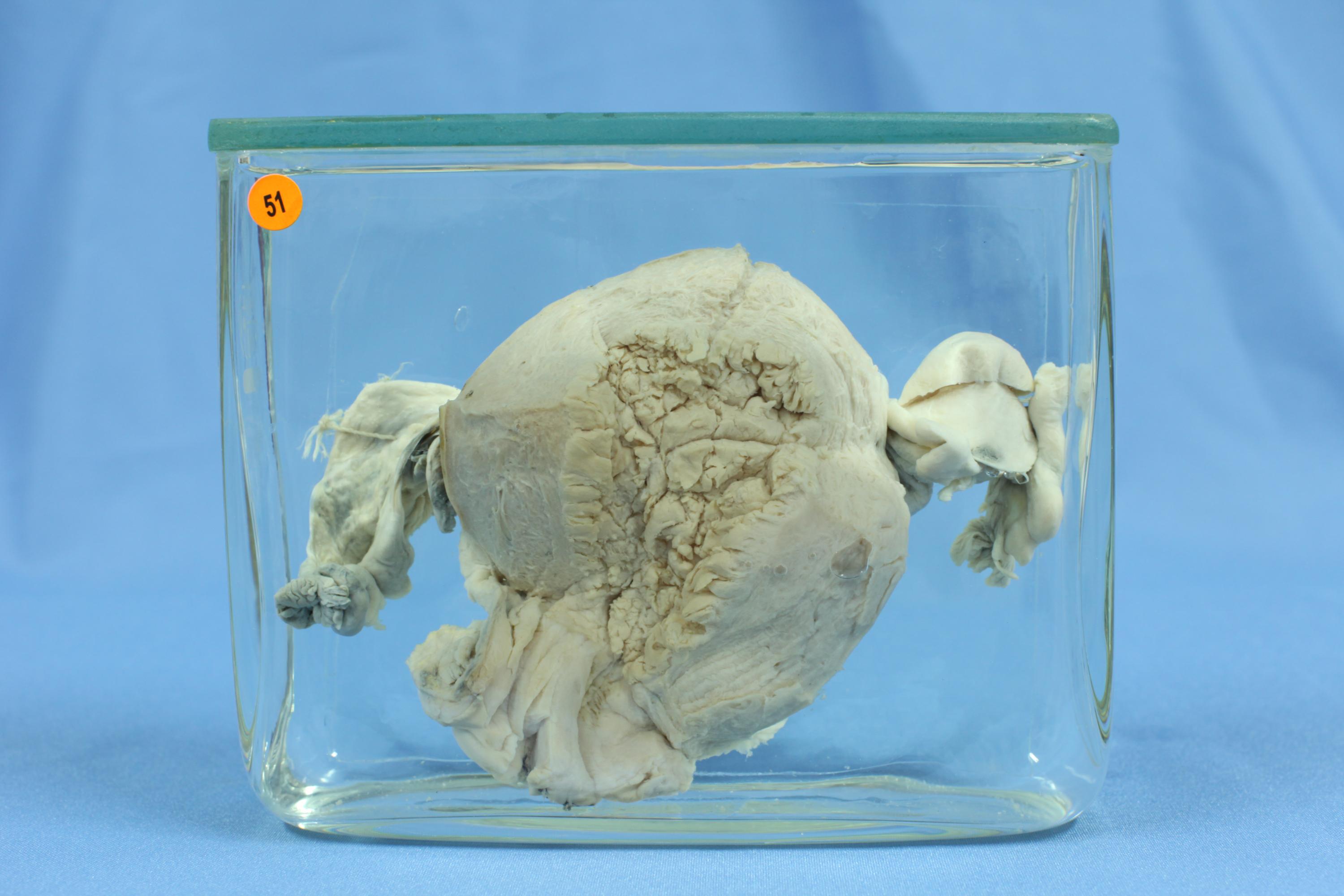 中央为切开子宫。子宫内壁见肿瘤呈息肉状弥漫生长,似铺路石样。肿瘤组织成灰白,质脆。肿瘤向肌层浸润生长。
