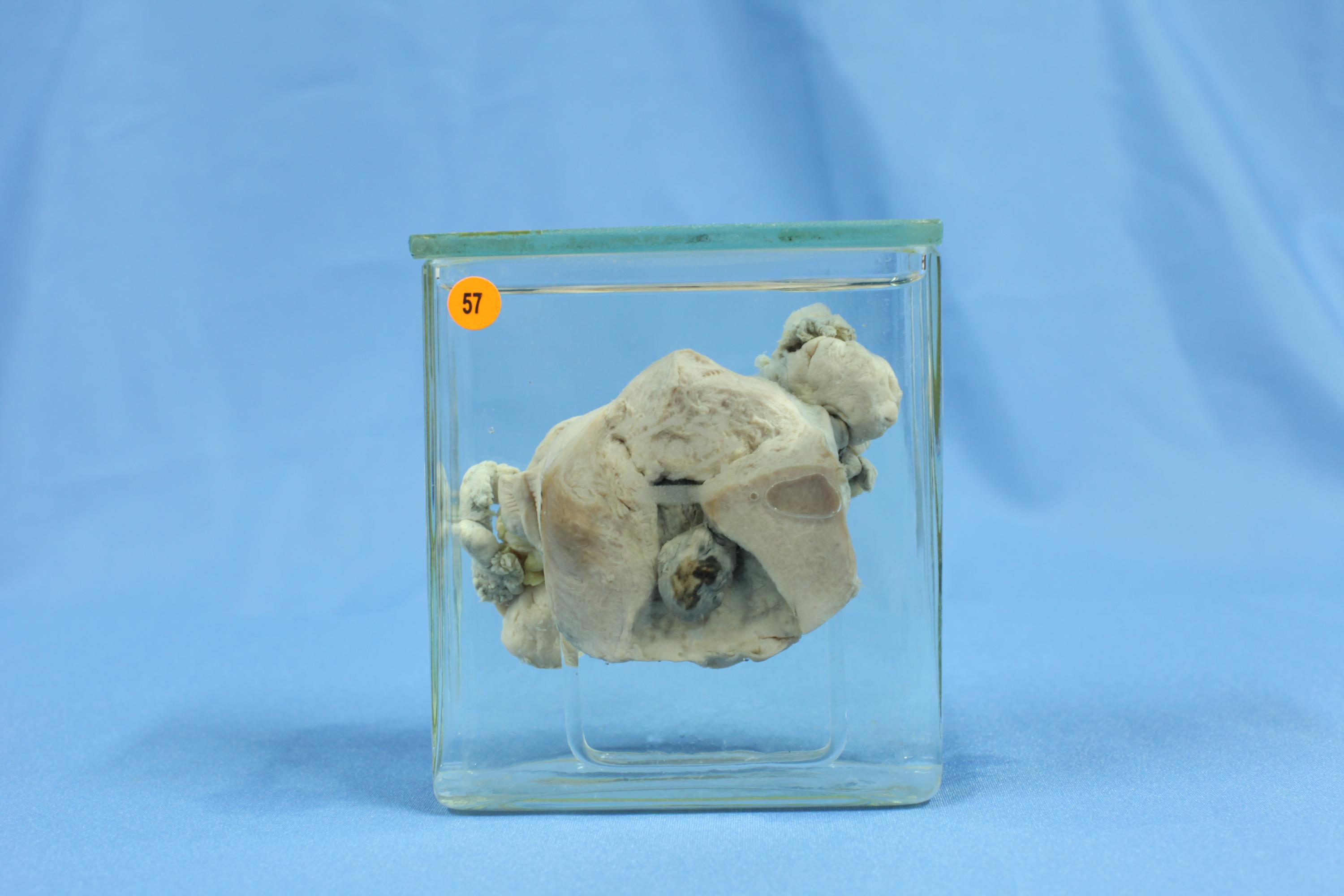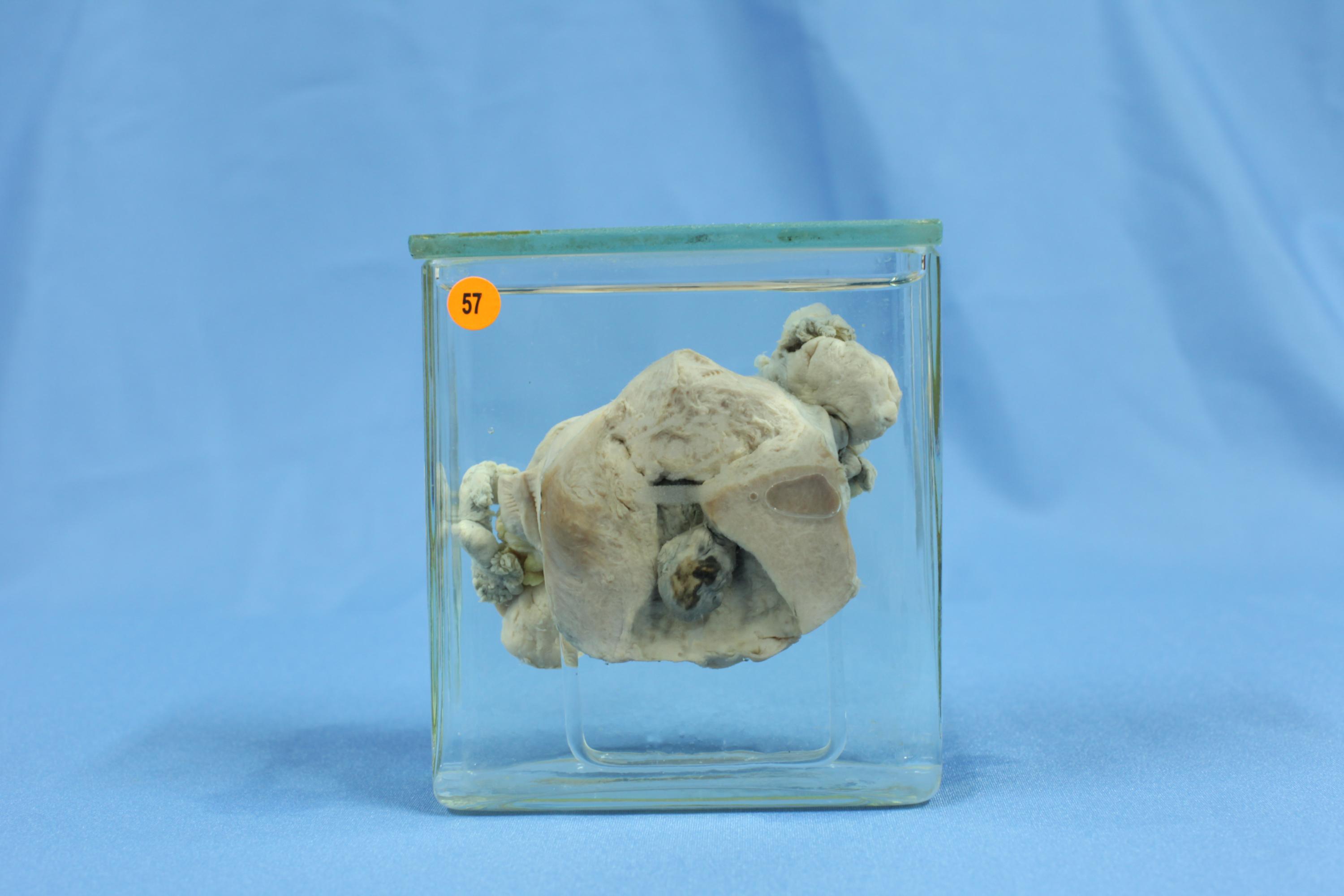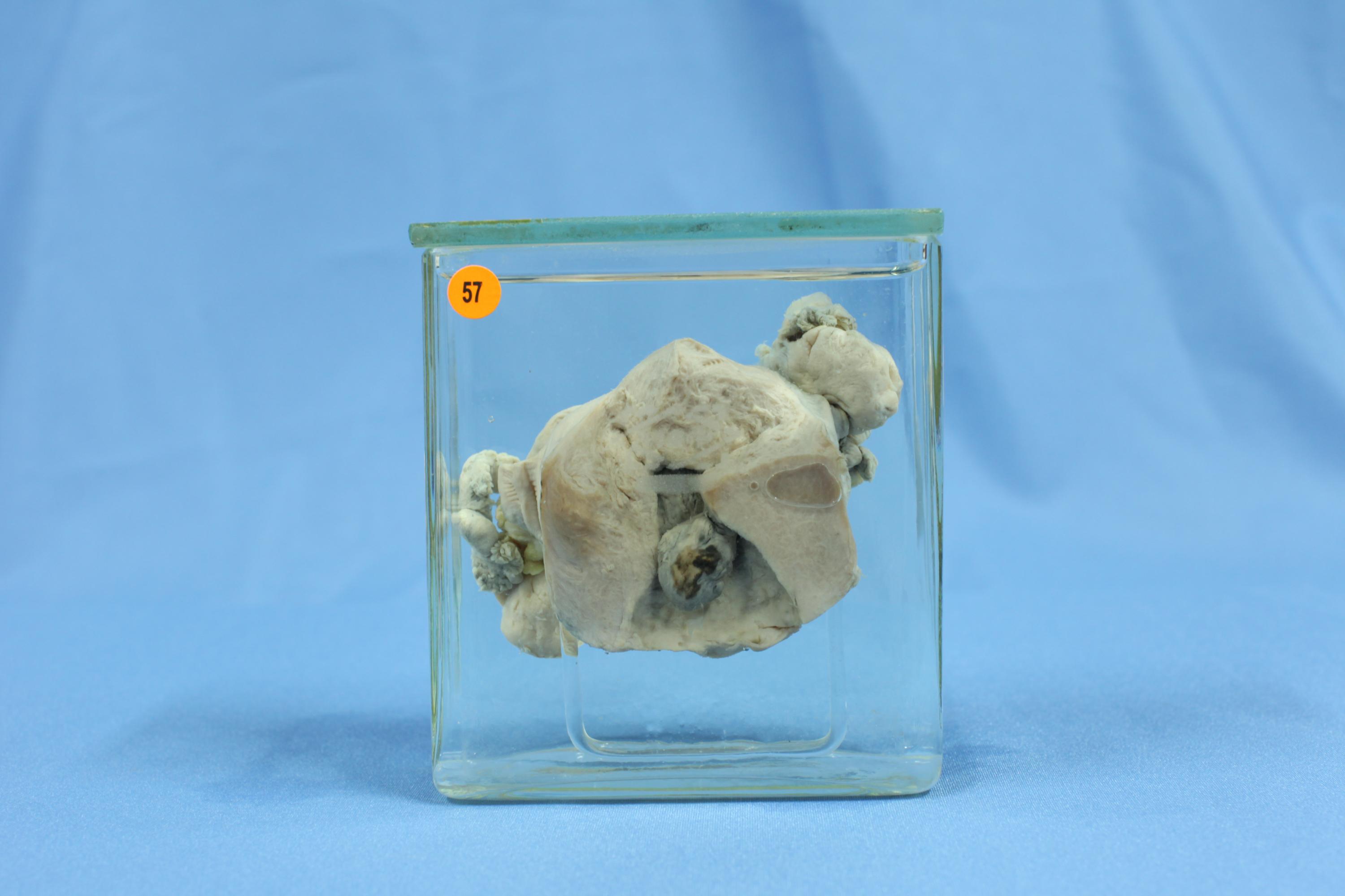 切开子宫见肌壁间肌瘤与内膜接触向宫腔突出。肿瘤直径1.2cm,表面局部呈棕褐色为出血区域。