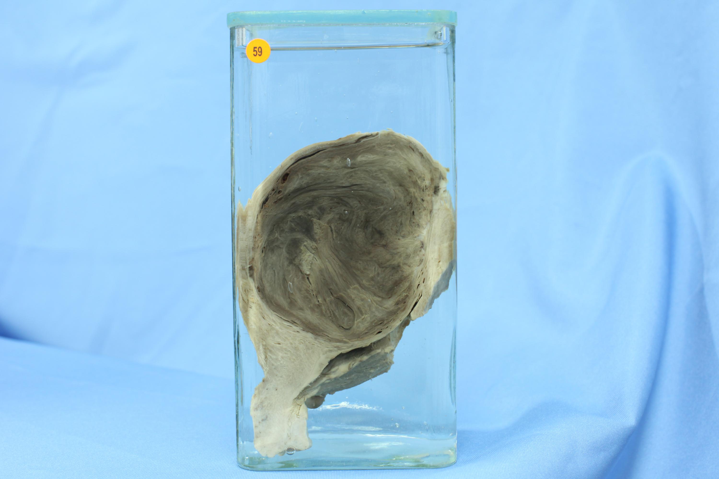 子宫肌壁间见一卵圆形肿瘤,直径7cm,切面呈红色,无光泽,质软,如变质牛肉样。