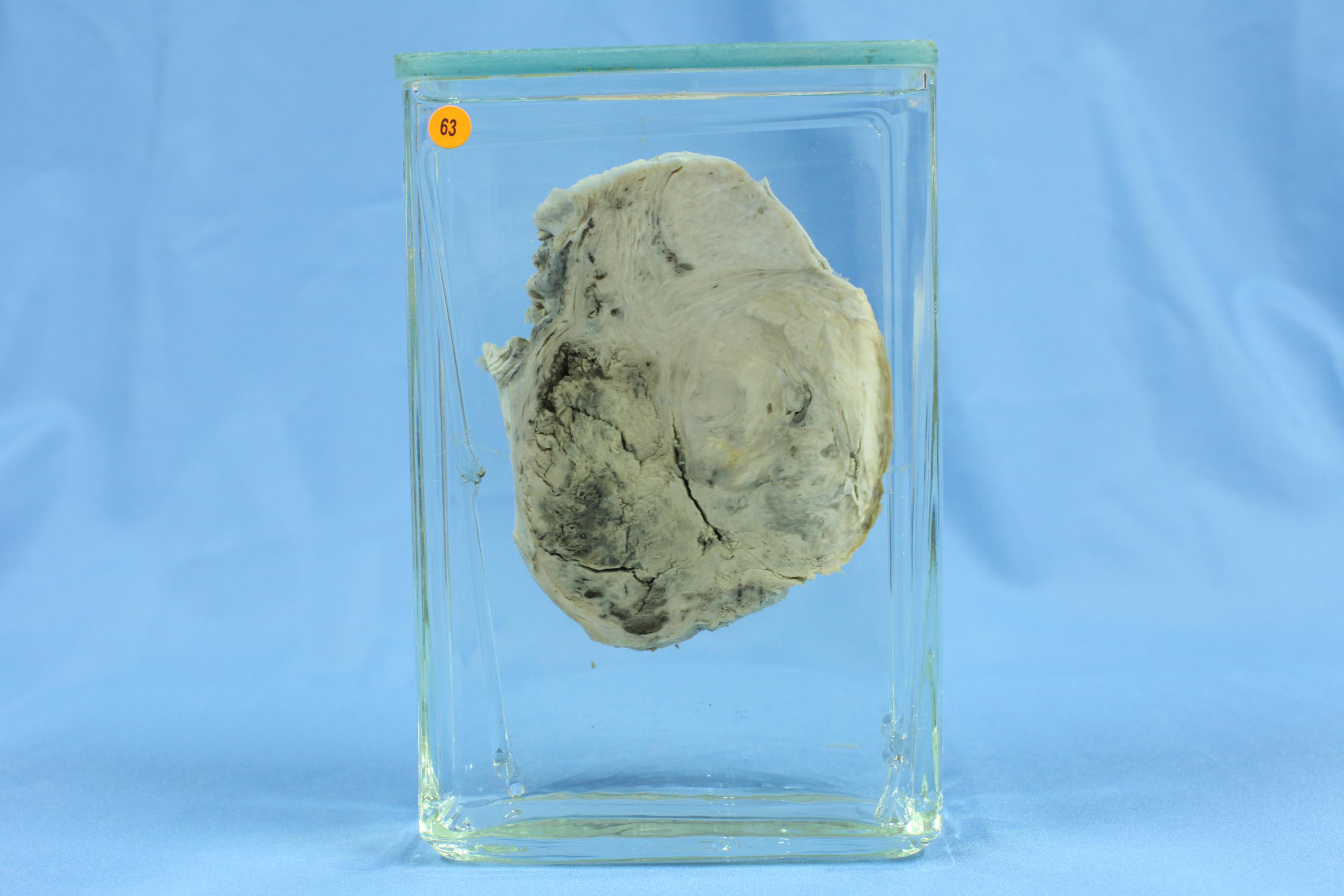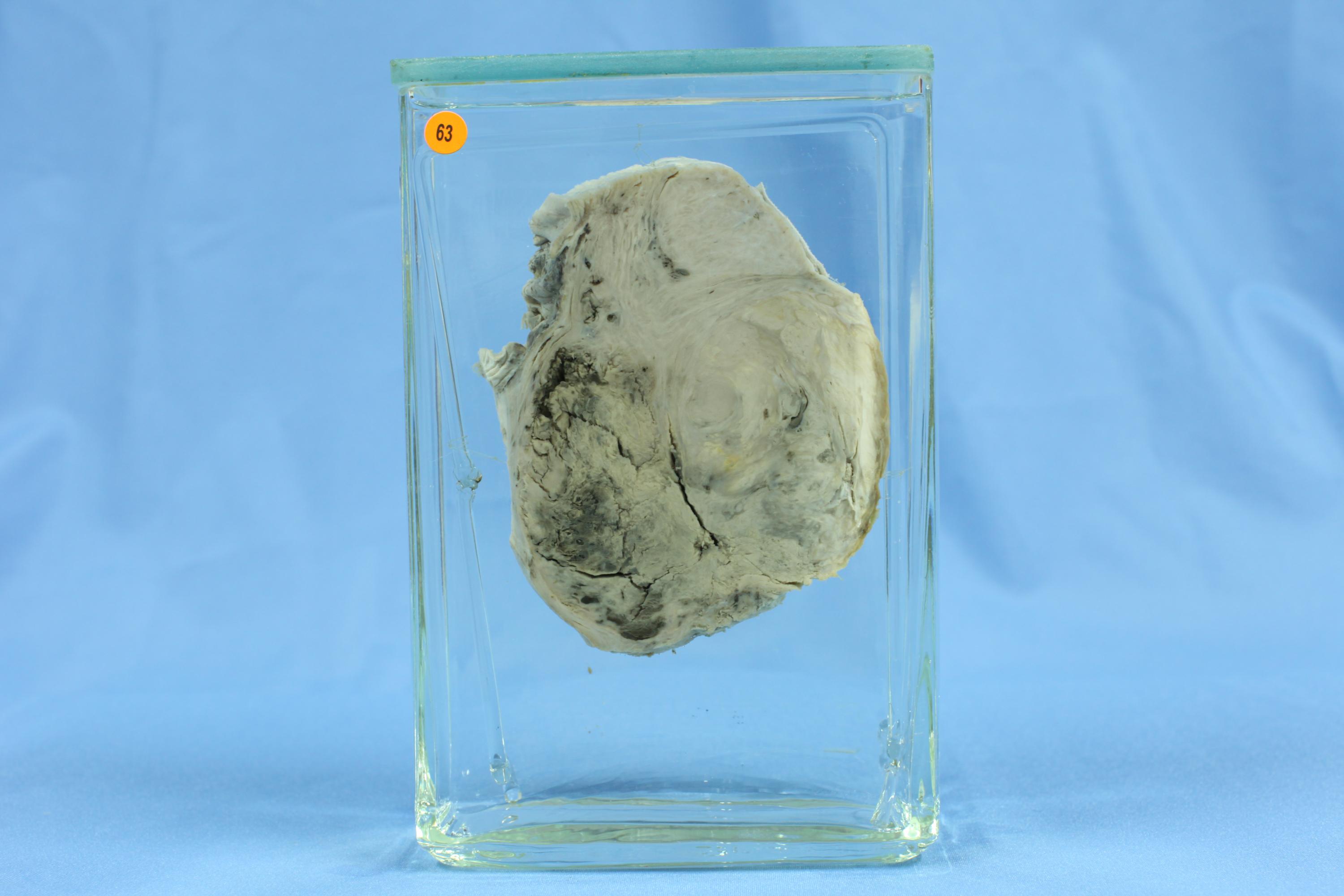 即肌瘤肉瘤变。切开肿瘤,直径7.5cm。形成假包膜,瘤组织变软而嫩,不像肌瘤那样坚韧,失去漩涡状及条索状的结构,常呈均匀一片或鱼肉状。肿瘤内明显坏死出血,色泽灰黄或有黄红色夹杂。
